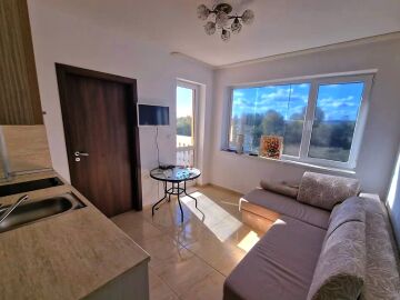 Апартаментът е компактен, със следното разпределение – всекидневна с кухненски бокс, спалня, баня с тоалетна и душ кабина, тераса с гледка към озеленената територия.