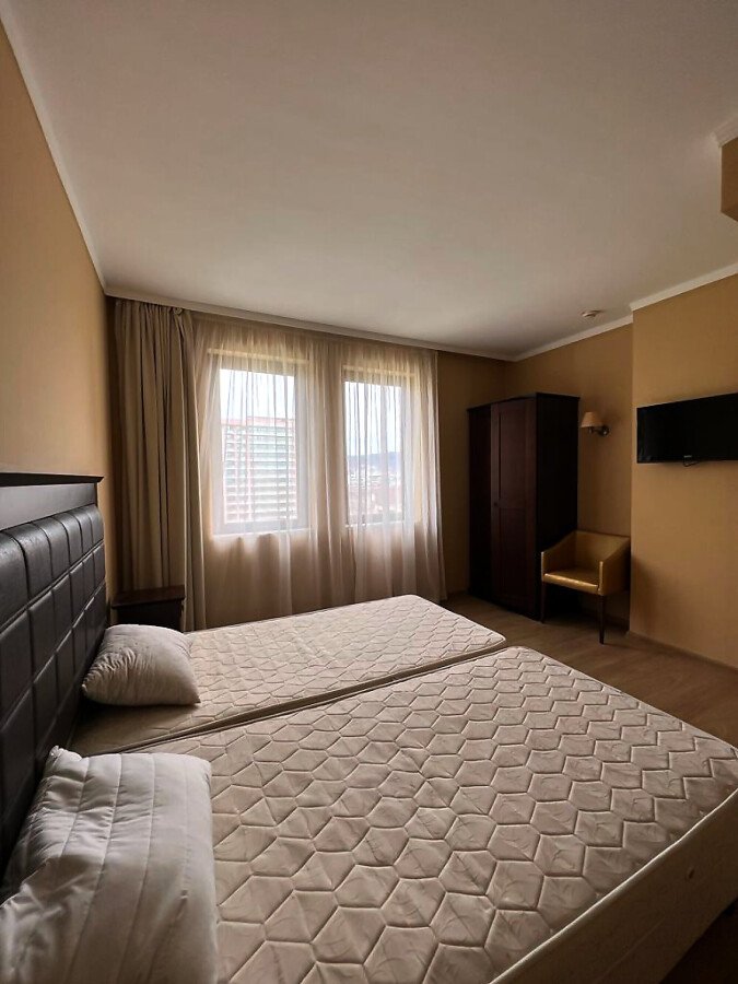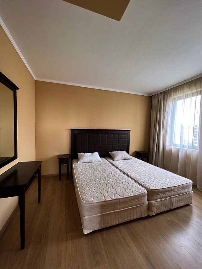 Апартаментът е слънчев, просторен и функционален, със следното разпределение – входно антре, всекидневна с малък кухненски кът, две спални, баня с тоалетна и вана, отделна тоалетна, тераса с красива гледка към морето. За продажба в идеално състояние, обзаведен и оборудван с всичко необходимо, готов за нанасяне.