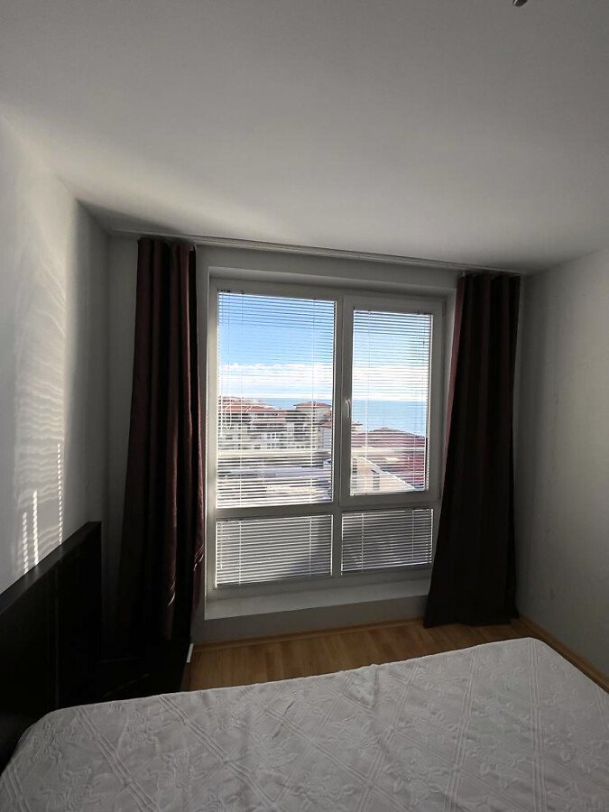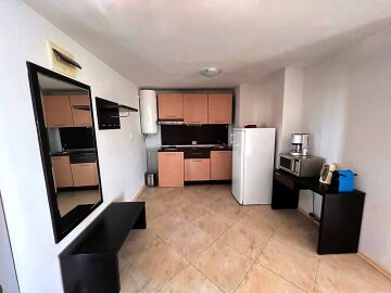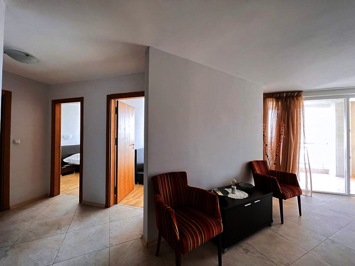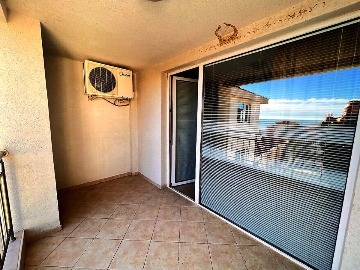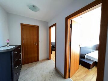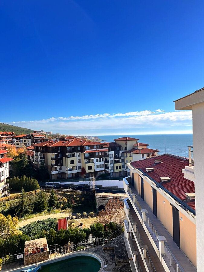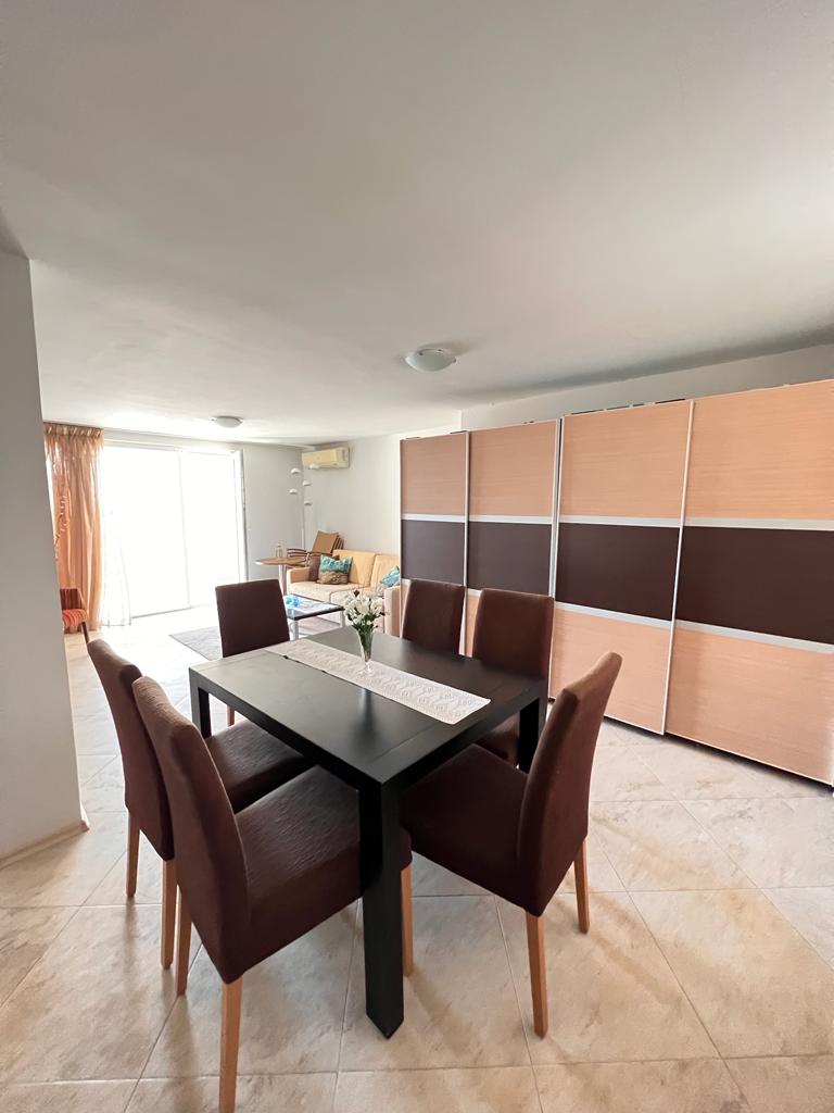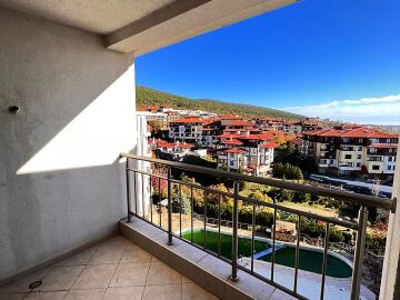 Апартаментът е просторен и светъл, със следното разпределение – входно антре, голяма всекидневна с кът за хранене и кухненски бокс, две спални, баня с тоалетна и душ кабина, тераса с красива гледка към морето, планината и басейна. За продажба в добро състояние, обзаведен и оборудван с всичко необходимо, готов за живеене.