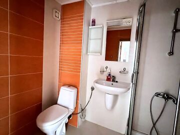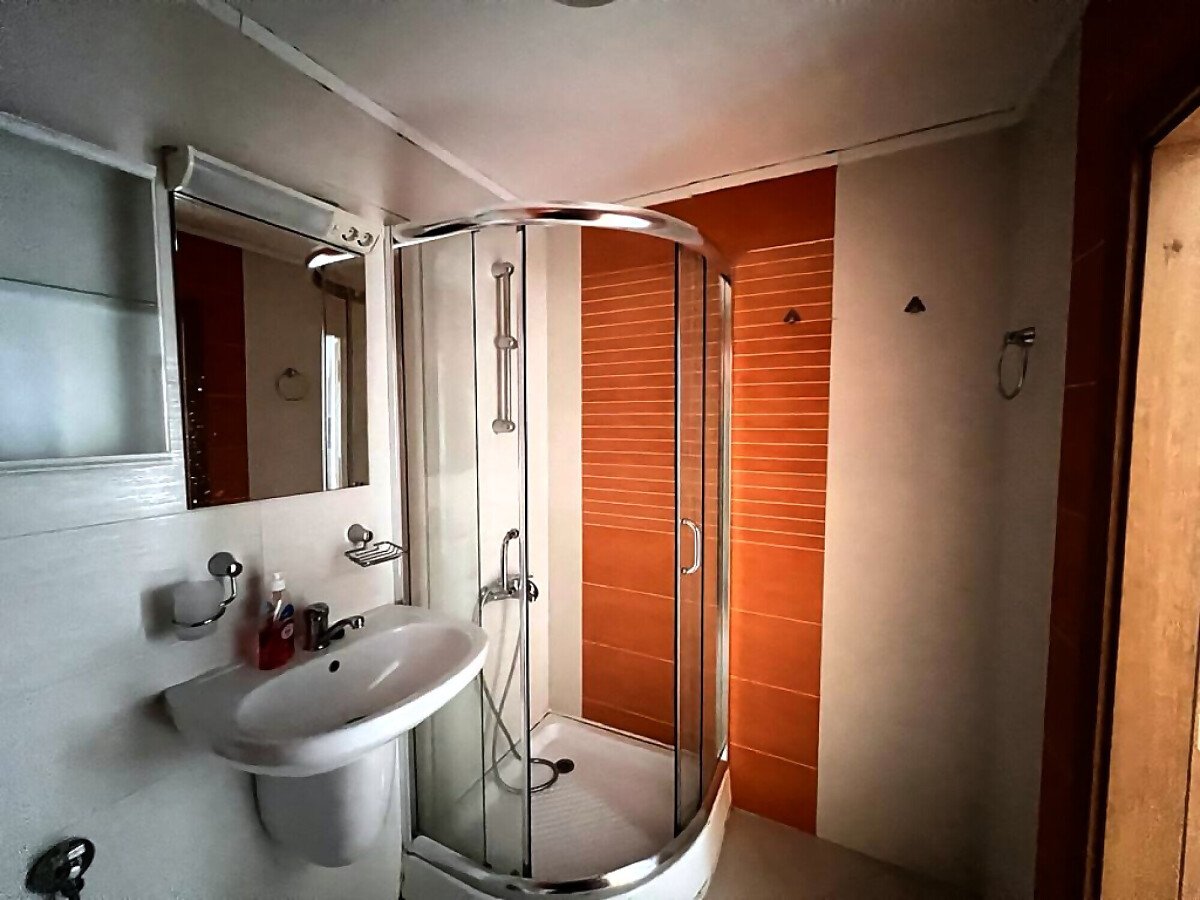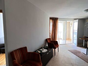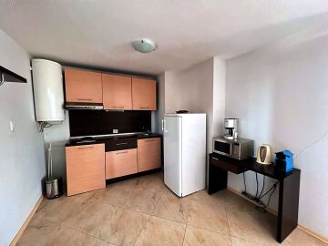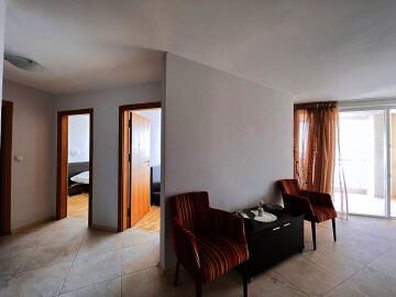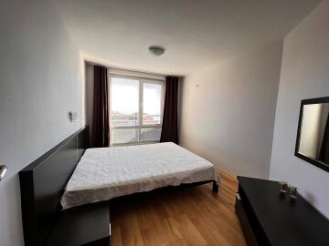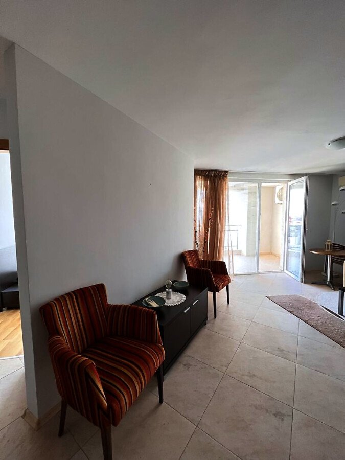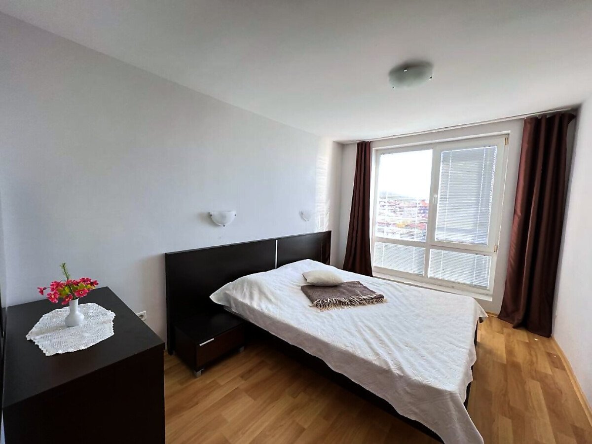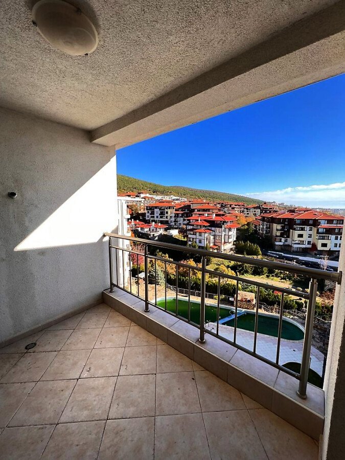 Апартаментът е просторен и светъл, със следното разпределение – входно антре, голяма всекидневна с кът за хранене и кухненски бокс, две спални, баня с тоалетна и душ кабина, тераса с красива гледка към морето, планината и басейна. За продажба в добро състояние, обзаведен и оборудван с всичко необходимо, готов за живеене.