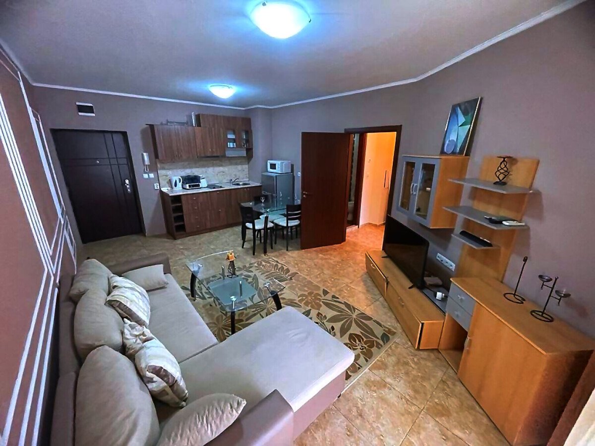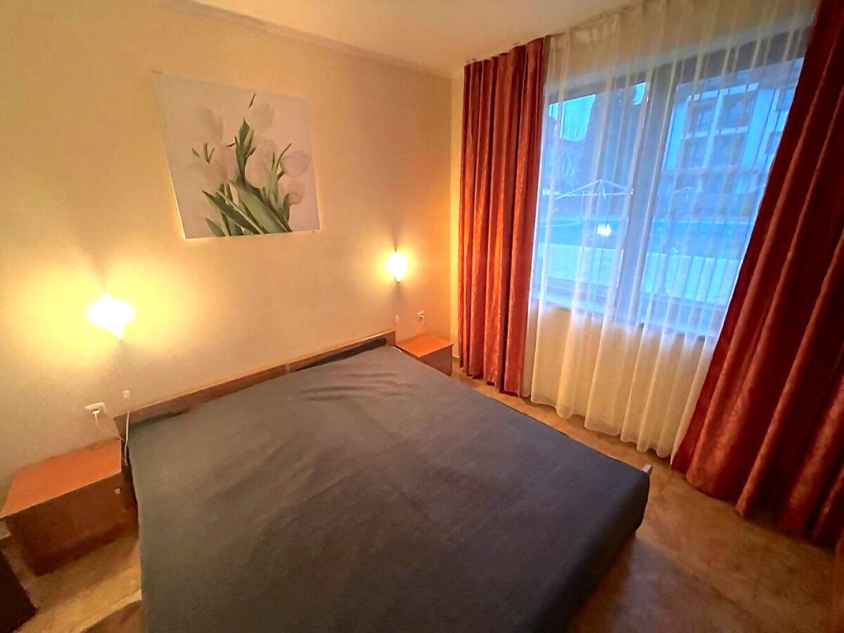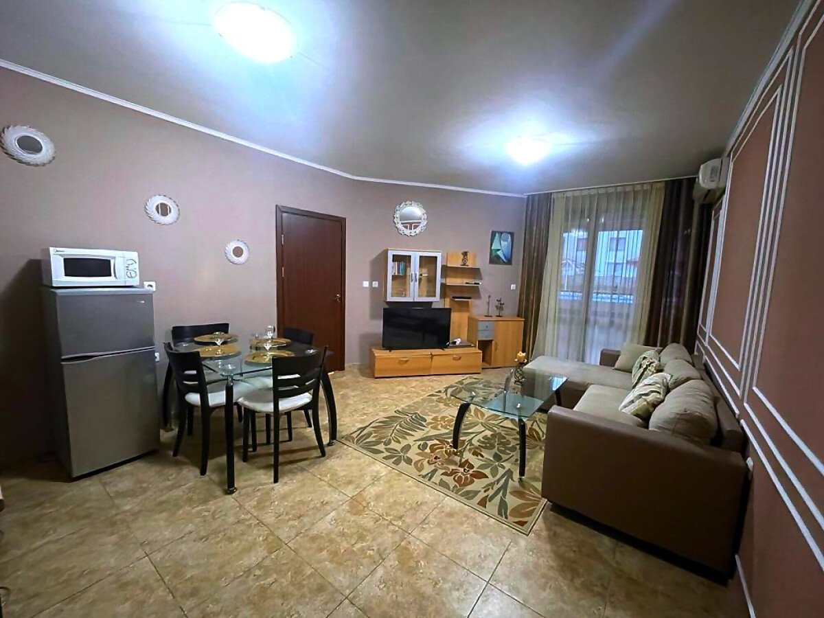 Апартаментът е разположен на партерен етаж и се състои от входно антре, всекидневна с обособена зона за хранене и кухненски бокс, спалня, баня с тоалетна и душ кабина, тераса с изглед към градината и към басейна. Жилището е след основен ремонт, в отлично състояние, готово за живеене.