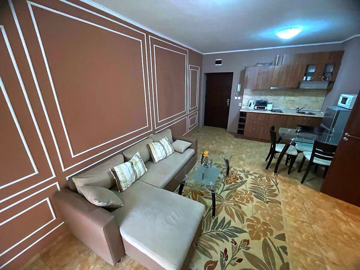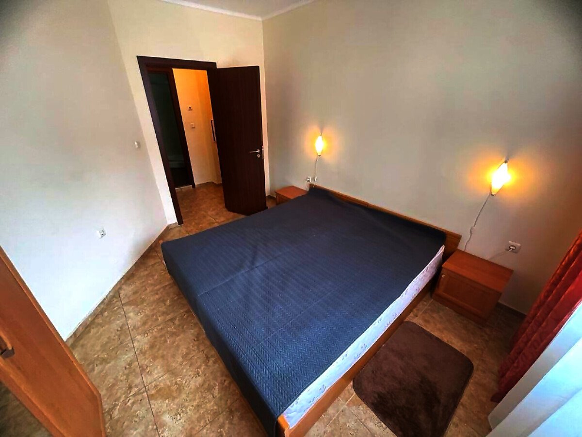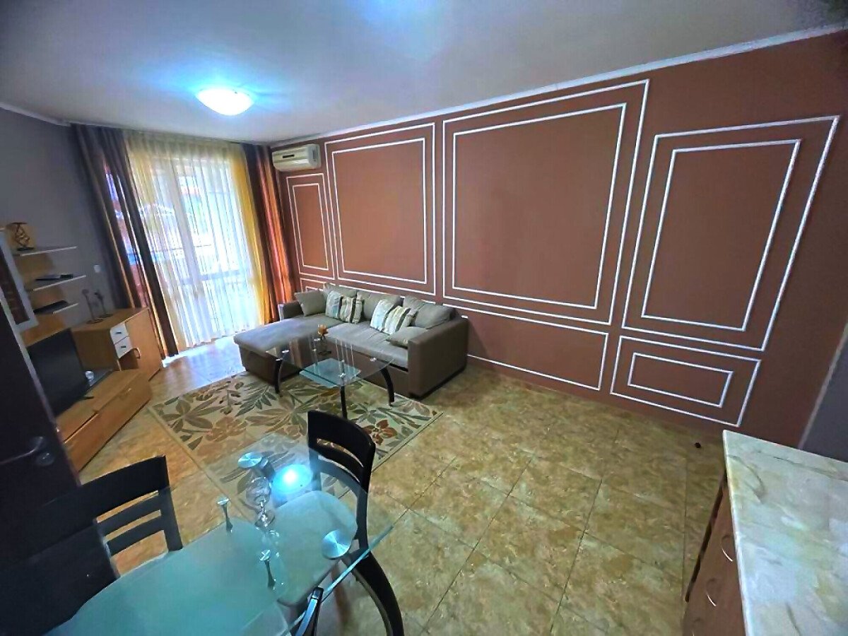 Апартаментът е разположен на партерен етаж и се състои от входно антре, всекидневна с обособена зона за хранене и кухненски бокс, спалня, баня с тоалетна и душ кабина, тераса с изглед към градината и към басейна. Жилището е след основен ремонт, в отлично състояние, готово за живеене.