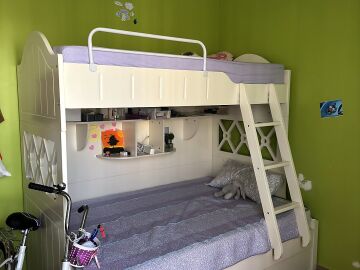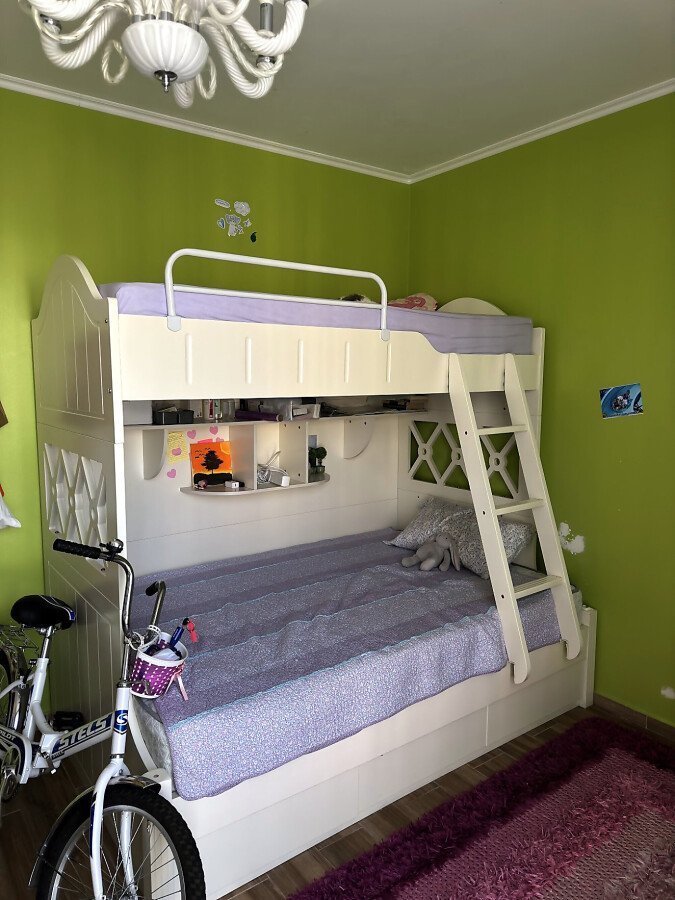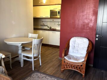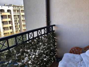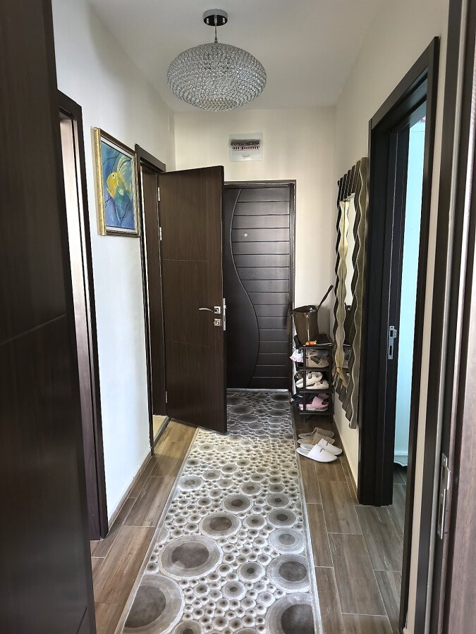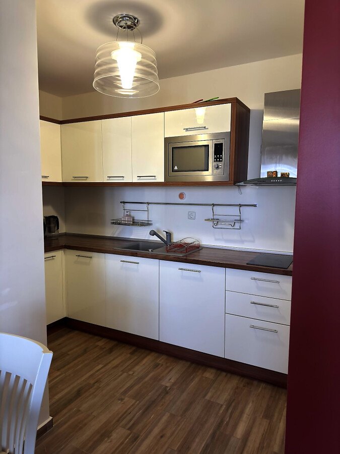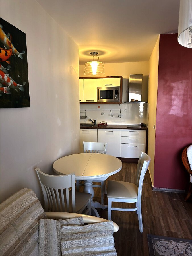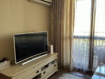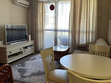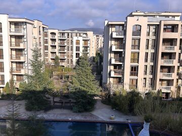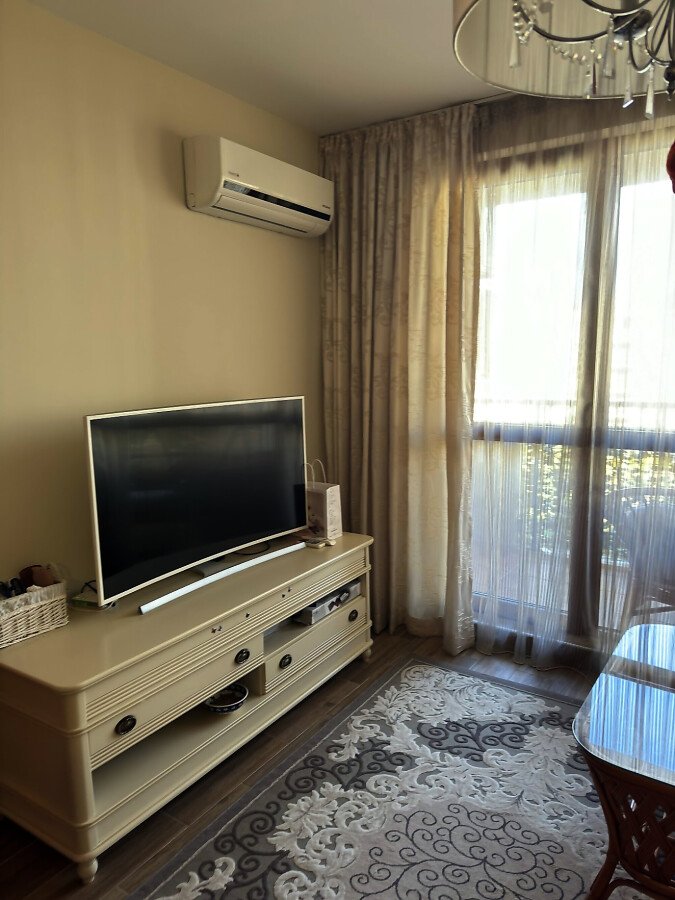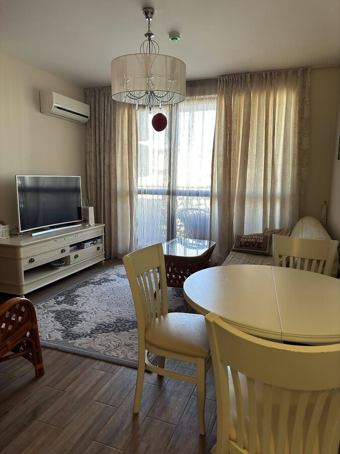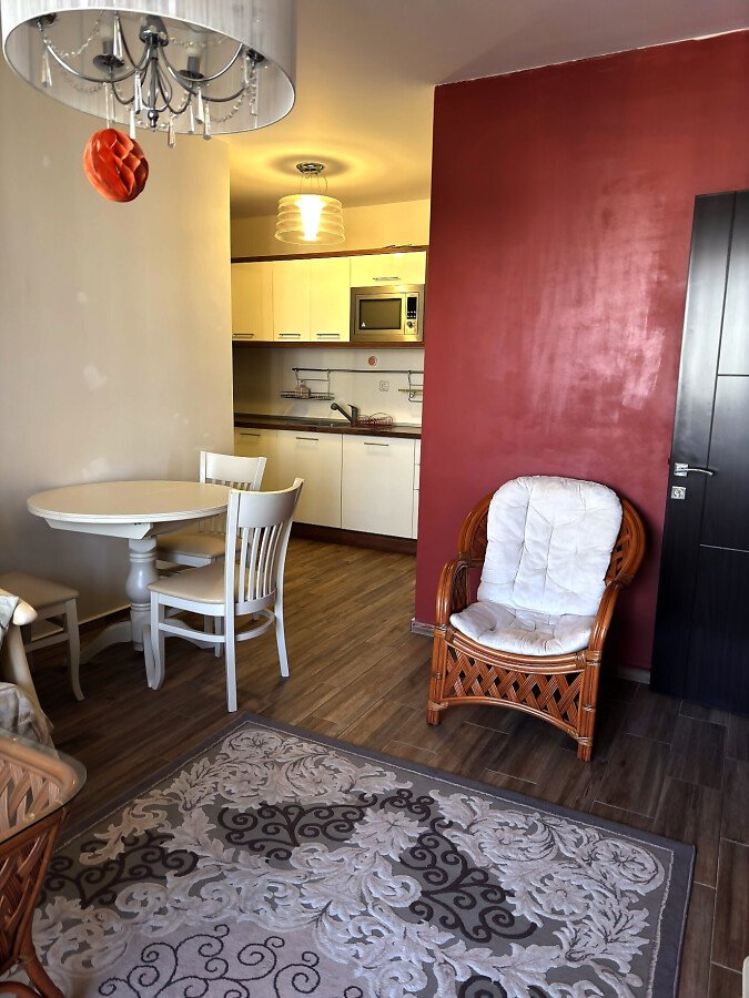 Апартаментът е разположен на пети етаж в сграда с асансьор и се състои от входно антре, всекидневна с кухненски бокс, две спални, баня с тоалетна и душ кабина, тераса с прекрасен изглед към басейна и добре поддържаната вътрешна територия. Продава се напълно обзаведен и оборудван – има два климатика, пералня, хладилник.