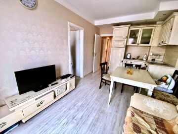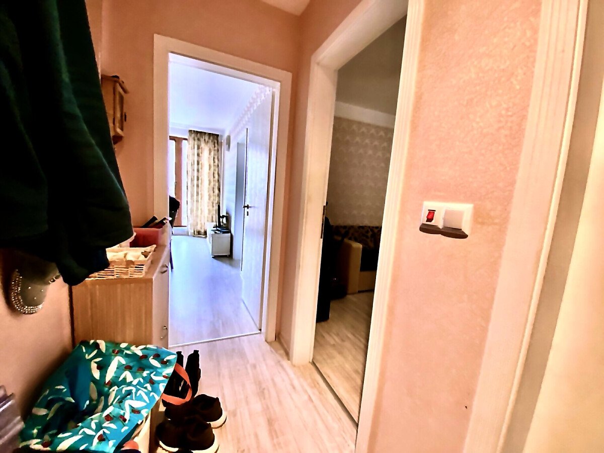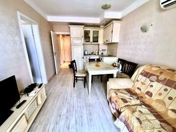 Апартаментът е разположен на четвърти етаж и има следното разпределение – входно антре, всекидневна с кухненски бокс и зона за хранене, две спални, баня с тоалетна и душ кабина, тераса с прекрасна гледка към басейна.