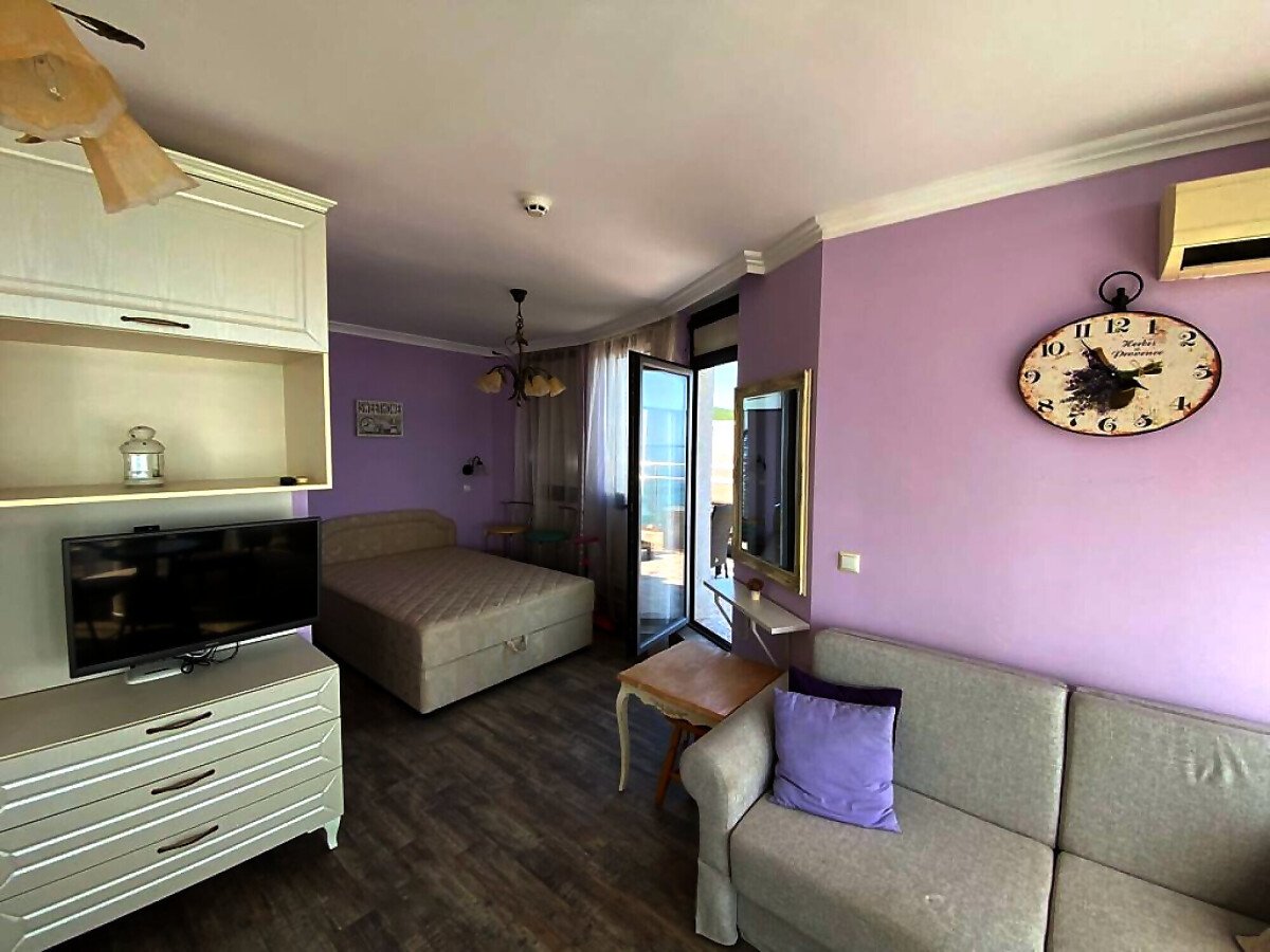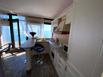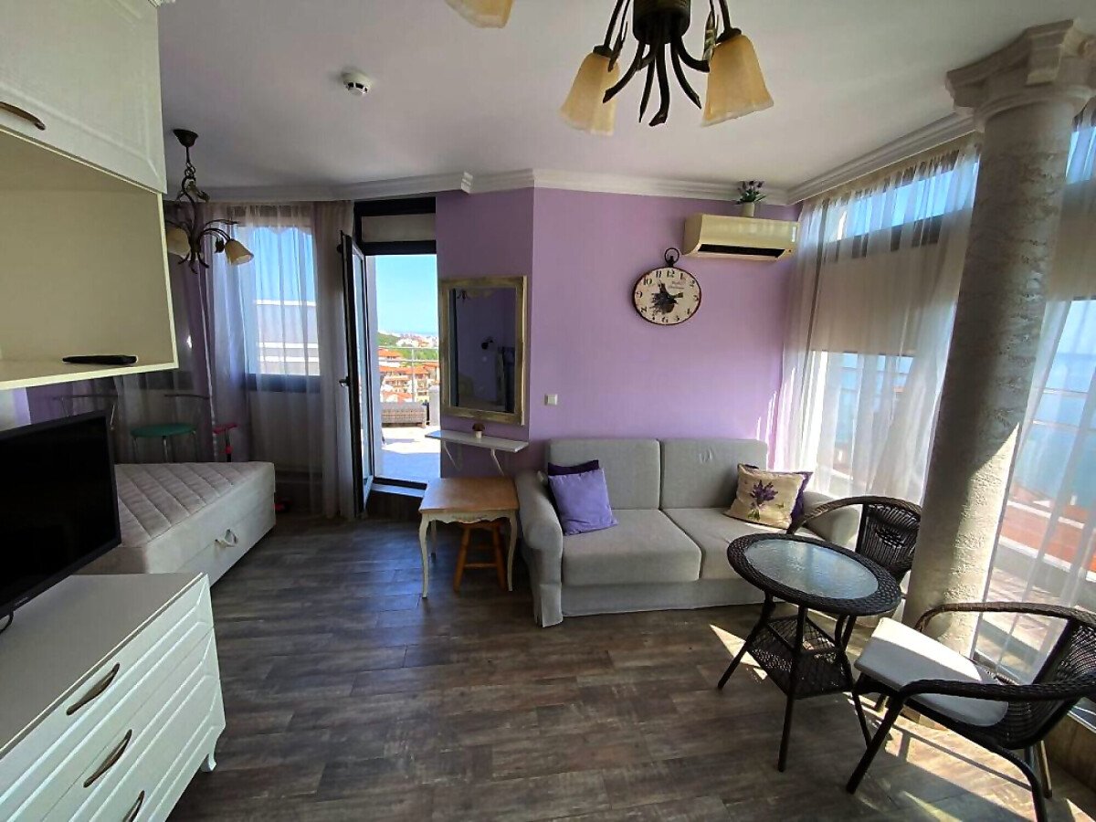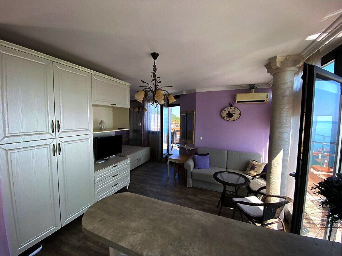 Апартаментът е разположен на пети, последен етаж, в сграда с асансьор и се състои от входно антре, всекидневна с кухненски бокс, спалня, баня с тоалетна и душ кабина, тераса с шезлонги и барбекю зона. От тераса се разкрива невероятна панорамна гледка към морето и басейна.