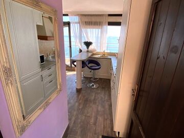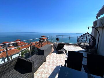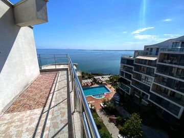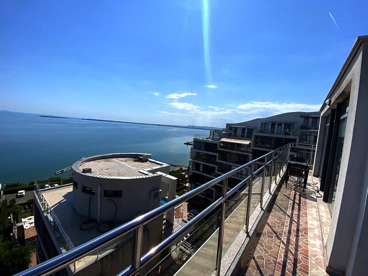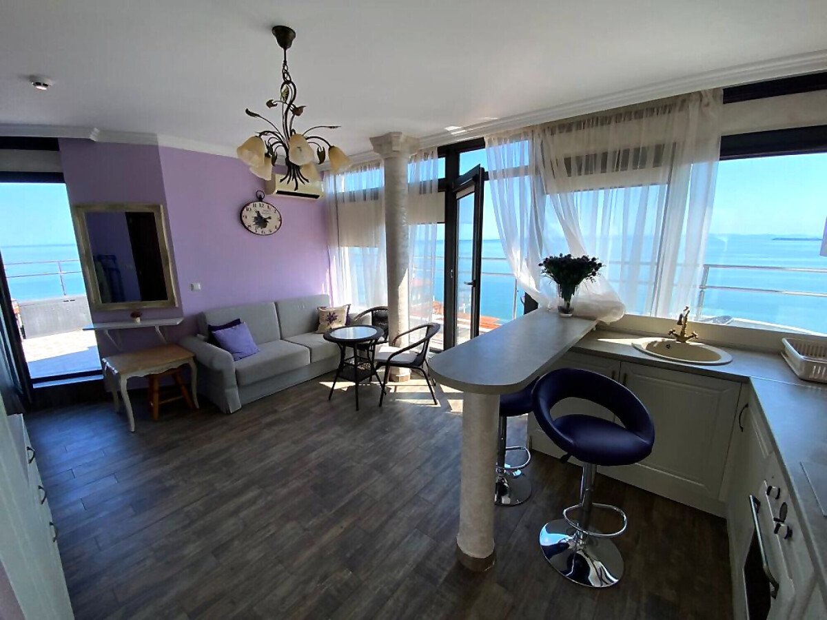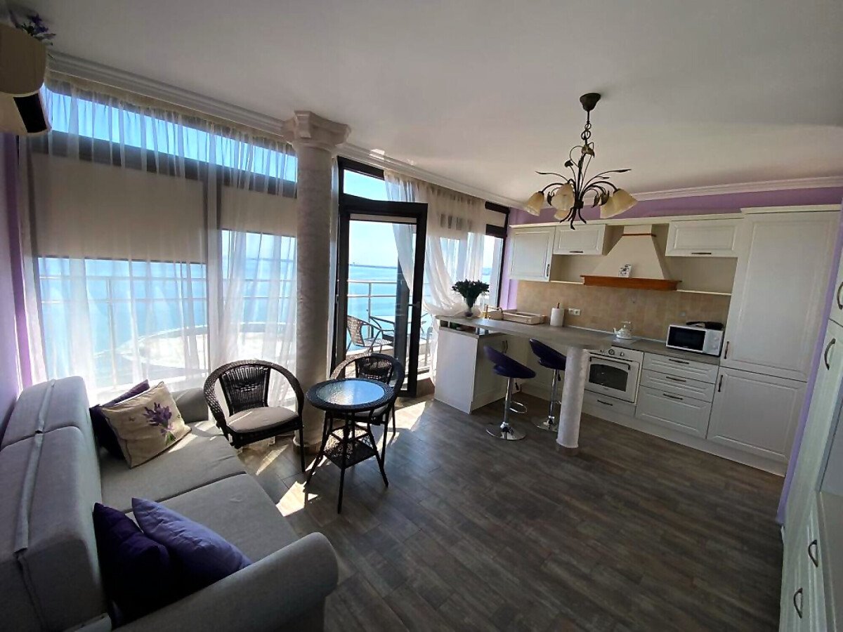 Апартаментът е разположен на пети, последен етаж, в сграда с асансьор и се състои от входно антре, всекидневна с кухненски бокс, спалня, баня с тоалетна и душ кабина, тераса с шезлонги и барбекю зона. От тераса се разкрива невероятна панорамна гледка към морето и басейна.