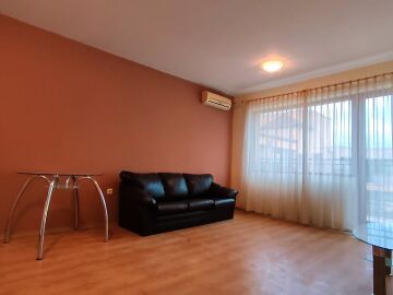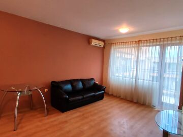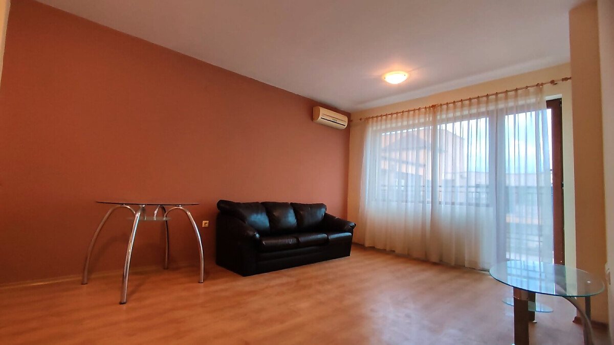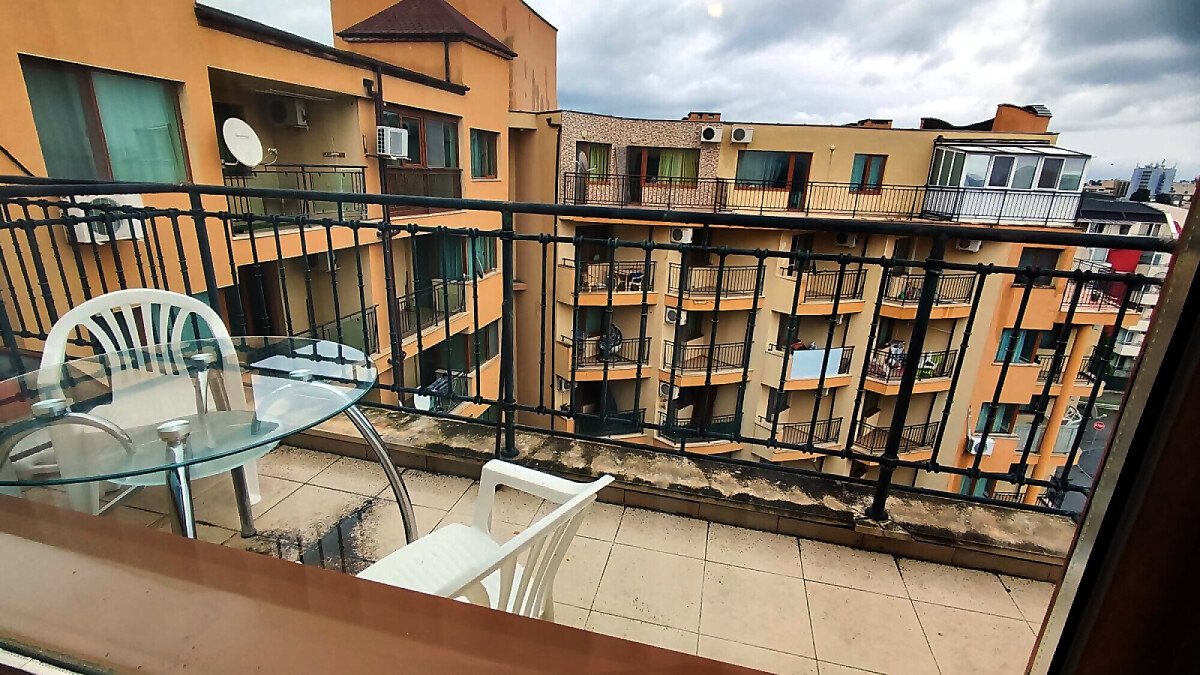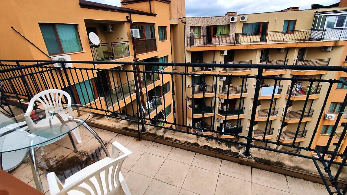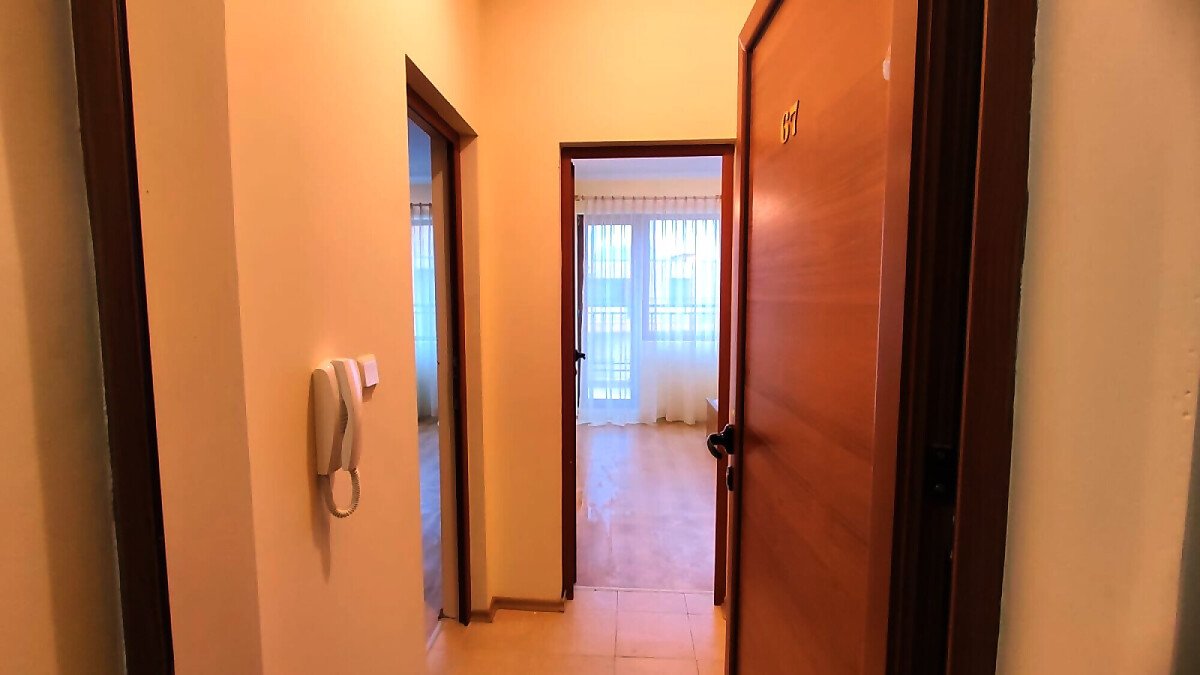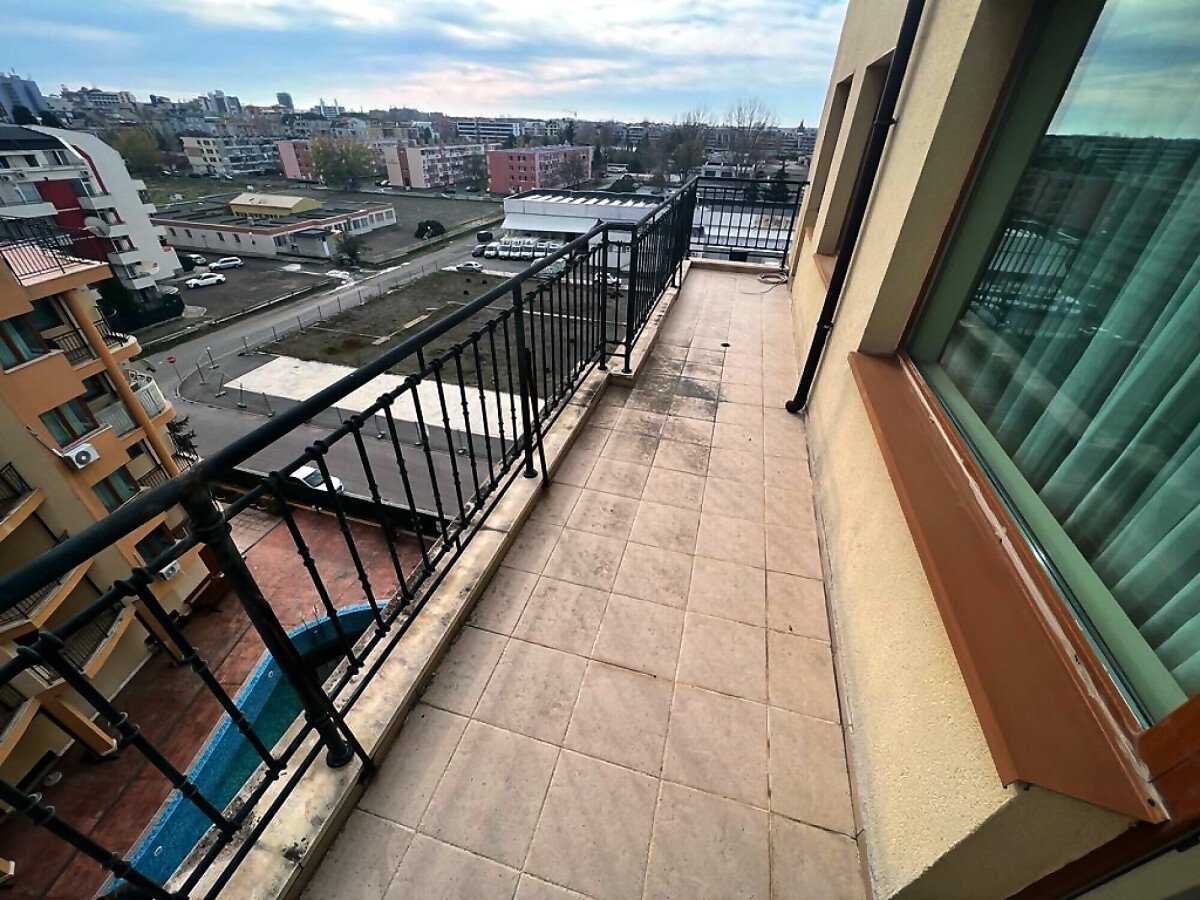 Апартаментът е светъл и просторен, разположен на шести, последен етаж, със следното разпределение – входно антре, всекидневна с малък кухненски бокс, спалня, баня с тоалетна, много голяма тераса. И от двете стаи има излаз към тераса, а тя разкрива красива гледка към басейна и към курорта.