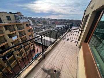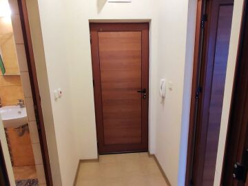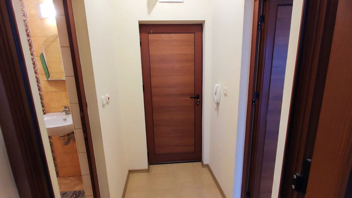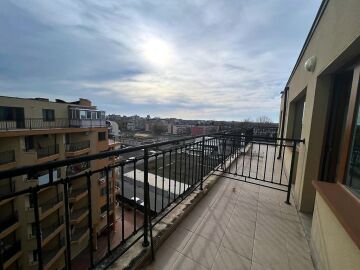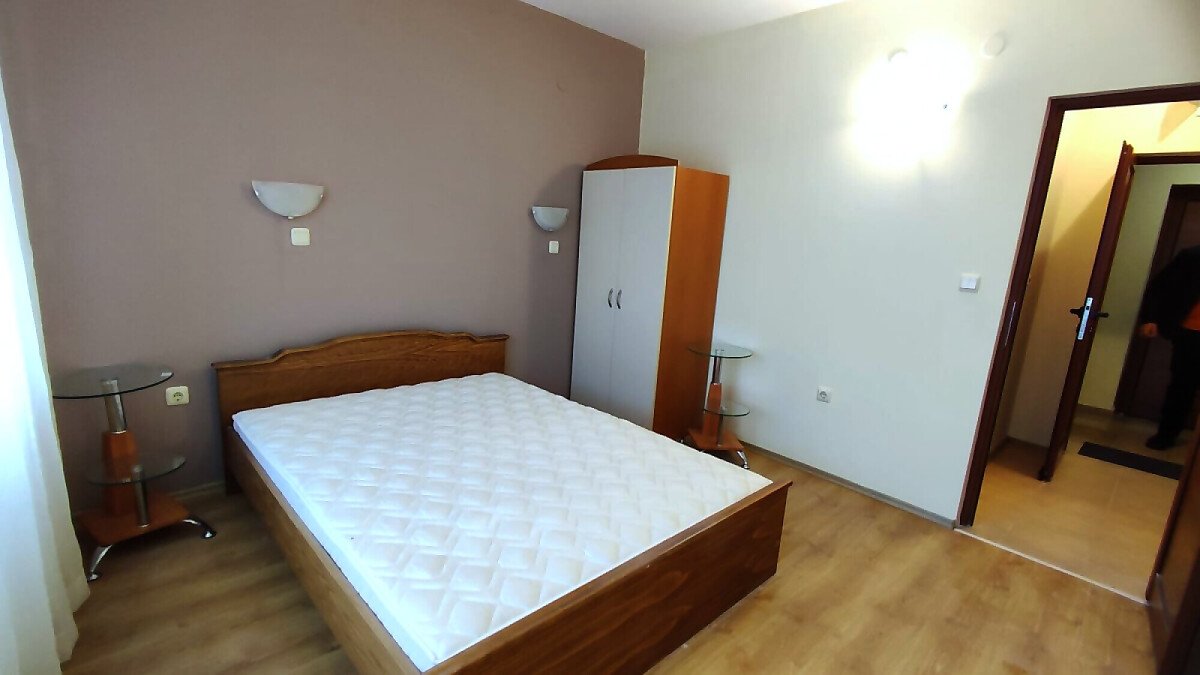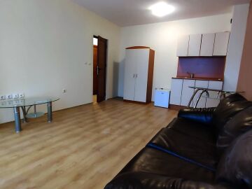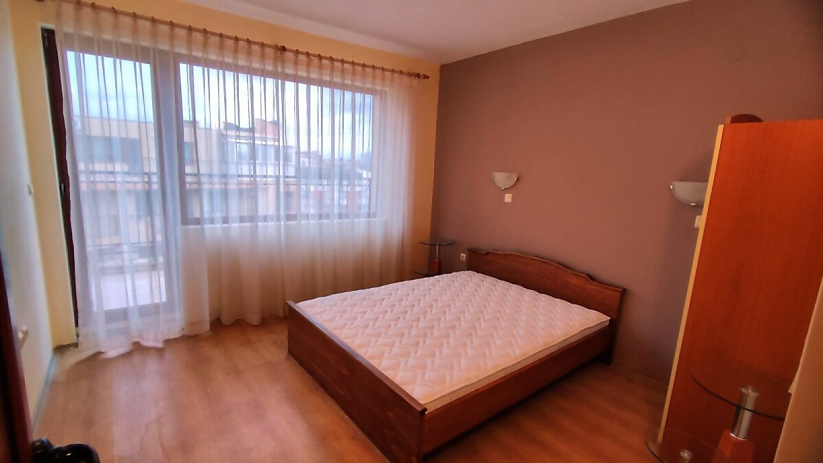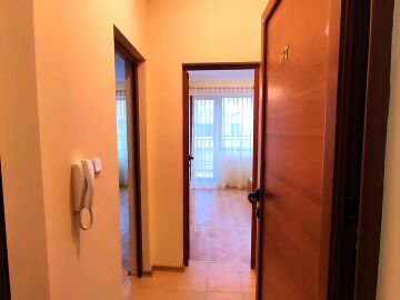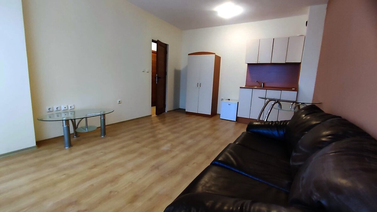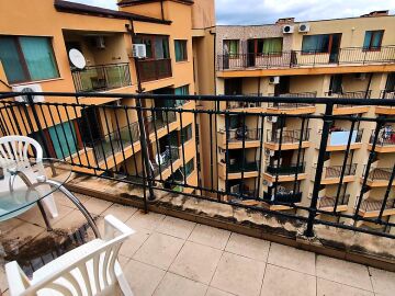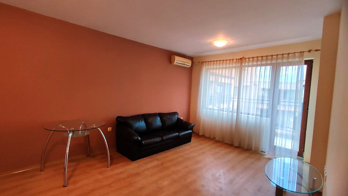 Апартаментът е светъл и просторен, разположен на шести, последен етаж, със следното разпределение – входно антре, всекидневна с малък кухненски бокс, спалня, баня с тоалетна, много голяма тераса. И от двете стаи има излаз към тераса, а тя разкрива красива гледка към басейна и към курорта.