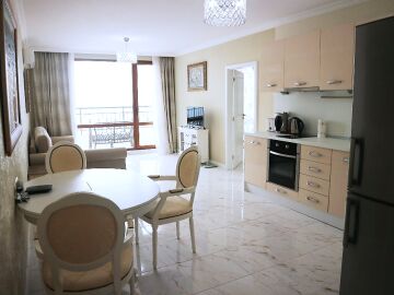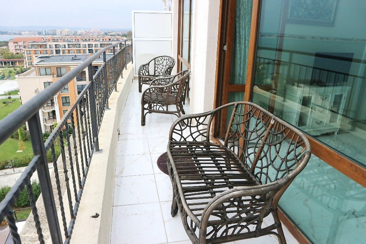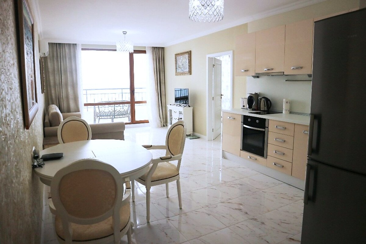 Апартаментът е разположен на пети етаж и има следното разпределение – входно антре, всекидневна с кухня и обособена зона за хранене, спалня, баня с тоалетна и душ кабина, тераса с невероятна панорамна гледка към морето и към басейна. Продава се в отлично състояние, обзаведен със стилни мебели, оборудван с качествена домакинска електротехника, готов за нанасяне или отдаване под наем.