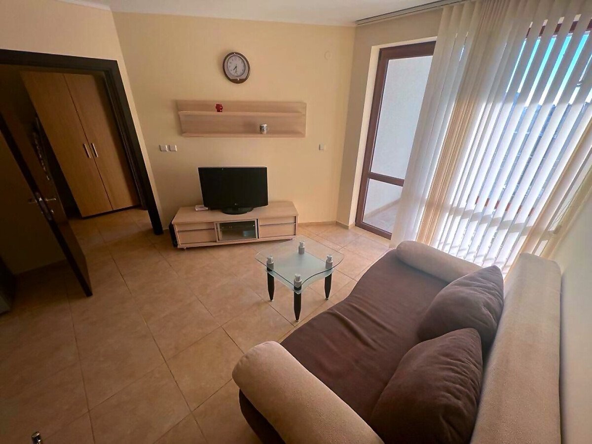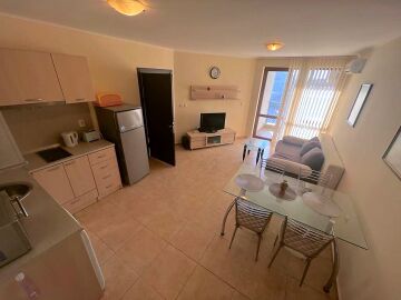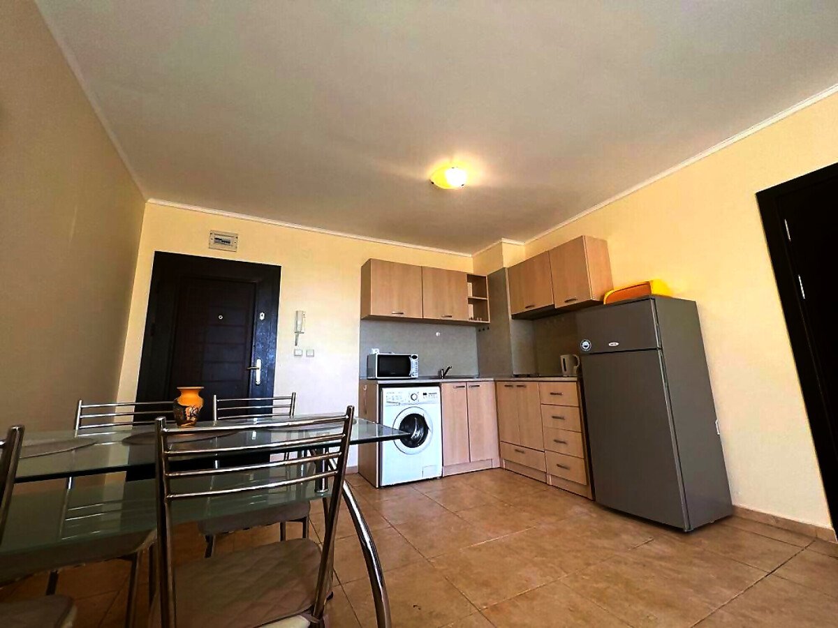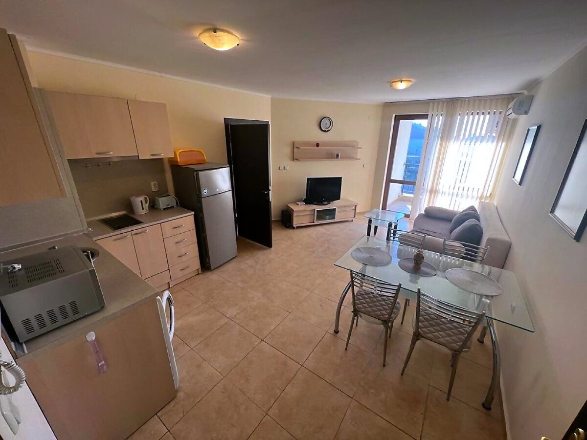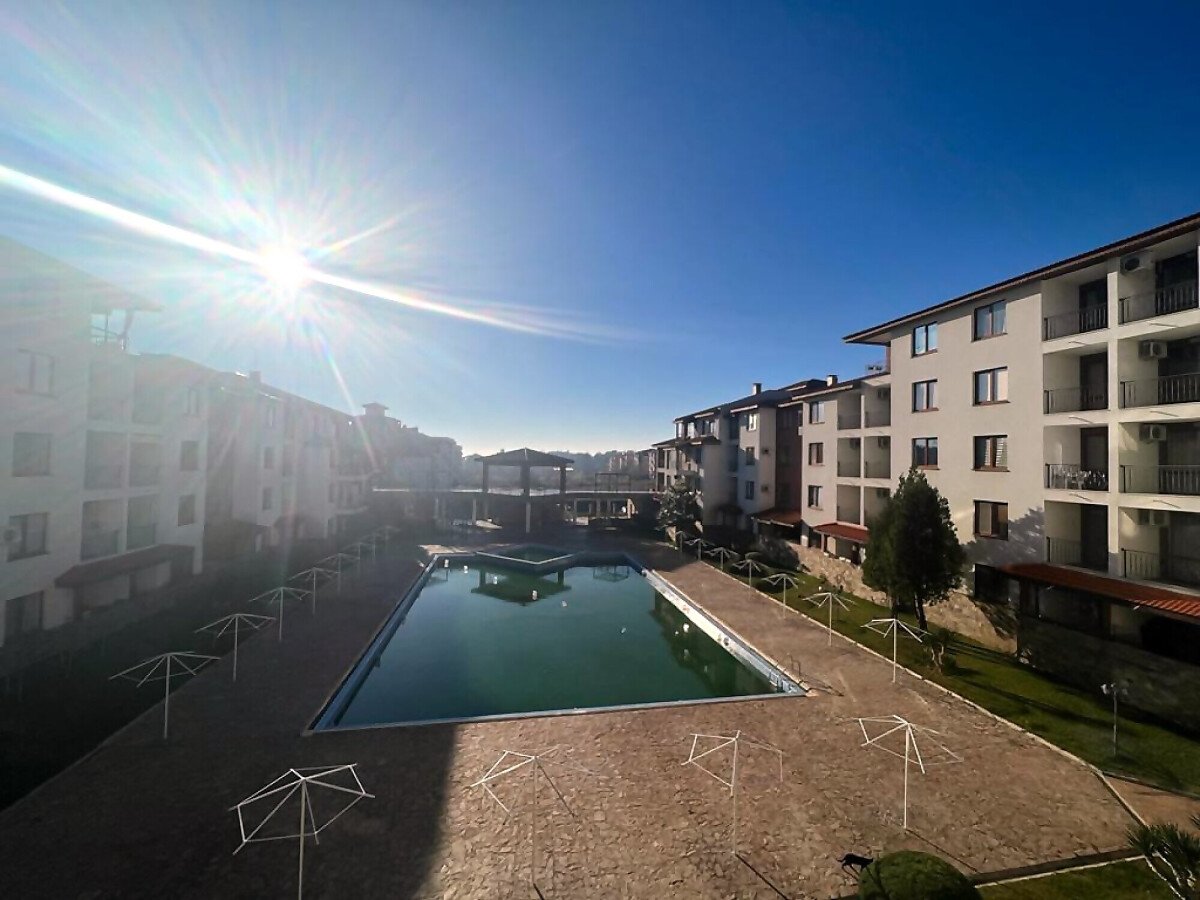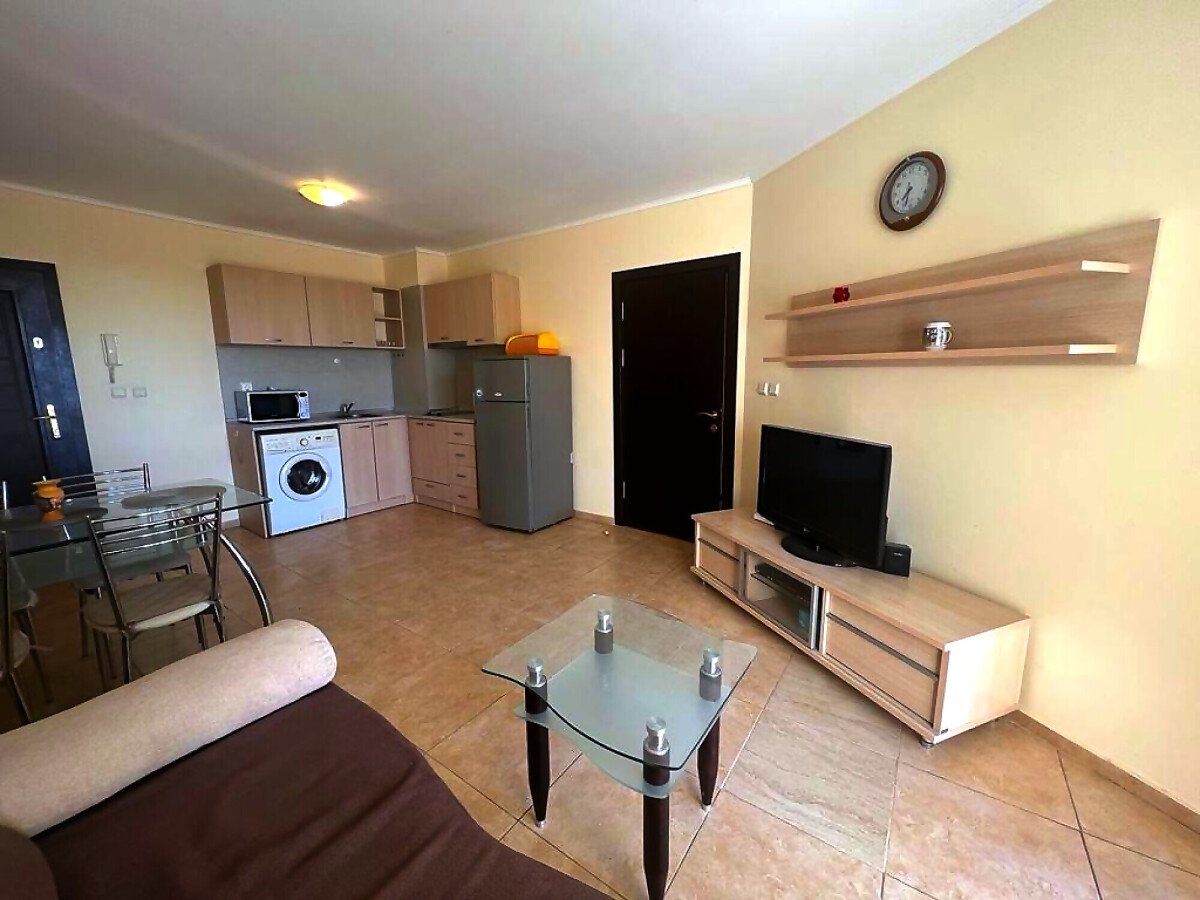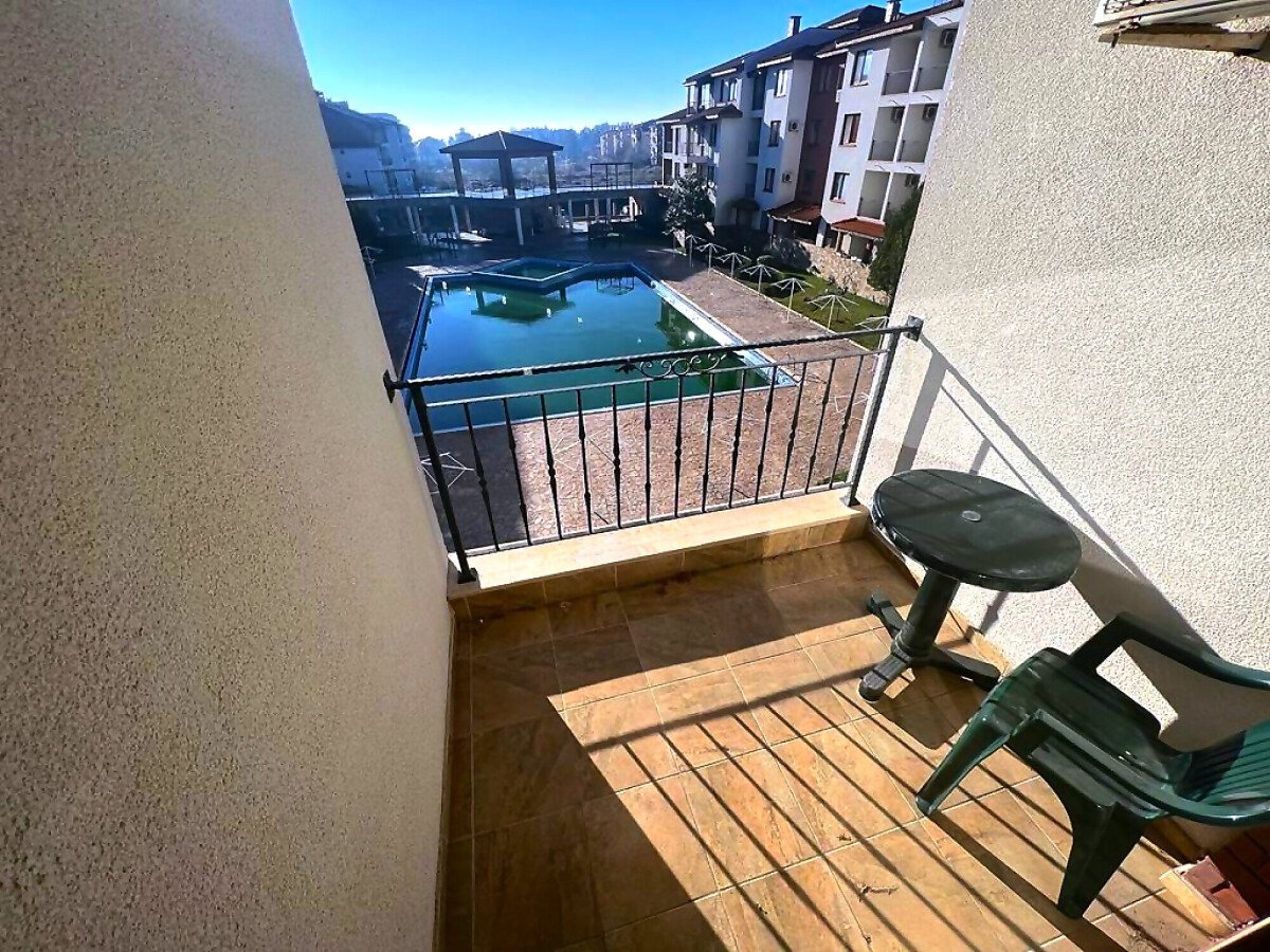 Апартаментът е разположен на трети етаж и се състои от всекидневна с кухненски бокс и обособена зона за хранене, баня с тоалетна и душ кабина, спалня, малка тераса с красив изглед към басейна. За продажба в отлично състояние, напълно обзаведен с качествени мебели, оборудван с необходимата домакинска електротехника, готов за нанасяне или отдаване под наем.