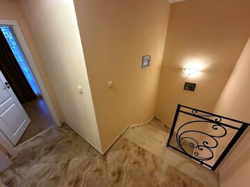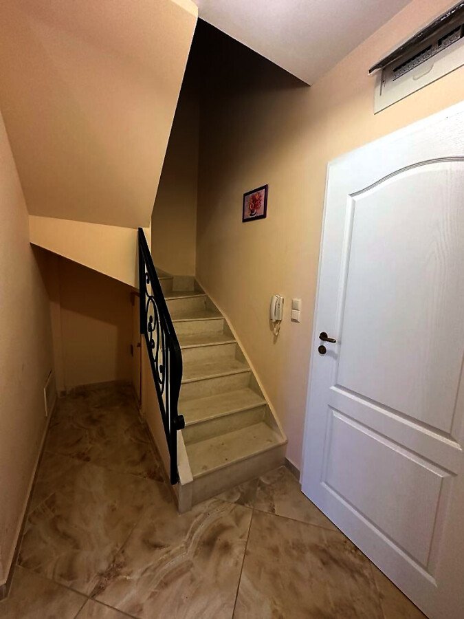 Първи етаж – входно антре, всекидневна с обособена зона за хранене и кухненски бокс, баня с тоалетна и душ кабина, самостоятелна веранда с барбекю и шезлонги.
