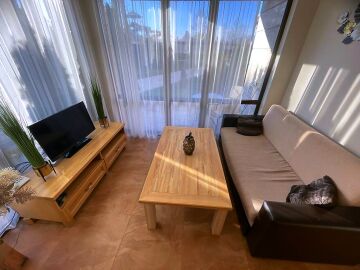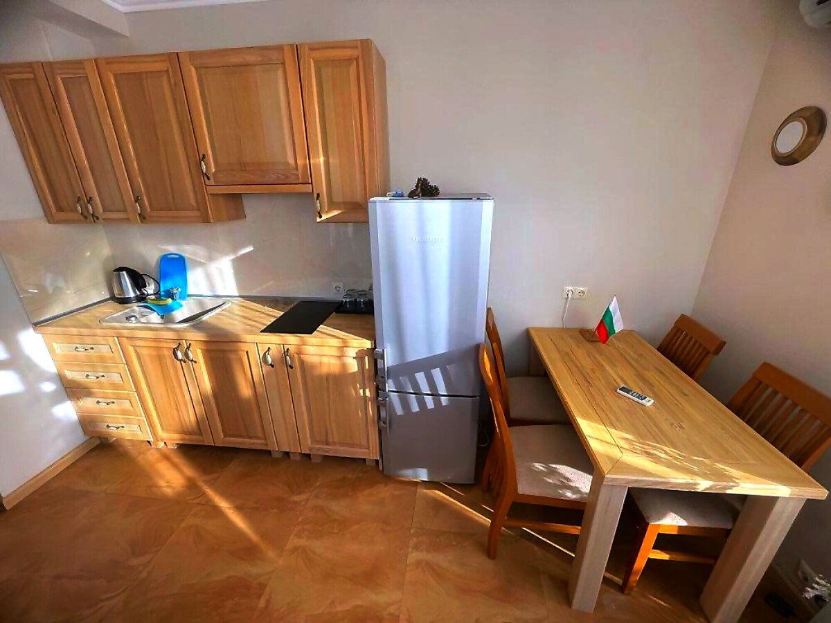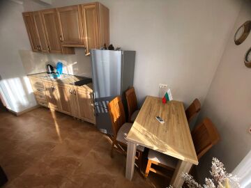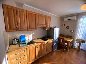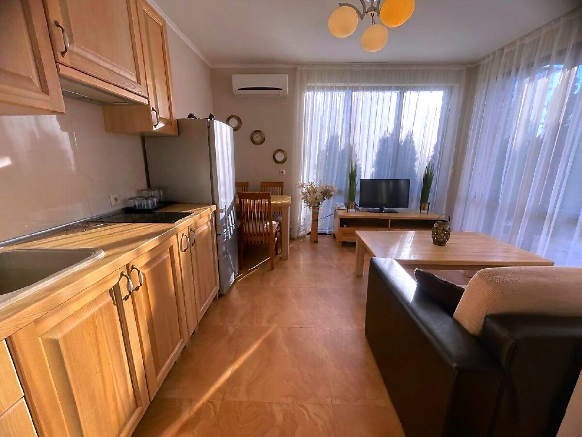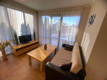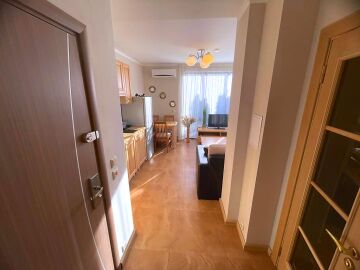Апартаментът е светъл и много функционален, разположен на партерен етаж, със следното разпределение – входно антре, всекидневна с обособена зона за хранене и кухненски бокс, баня с тоалетна и душ кабина, спалня, самостоятелна веранда с изход към басейна и озеленения двор на комплекса.