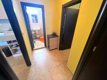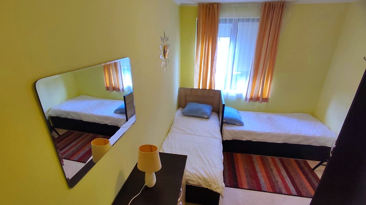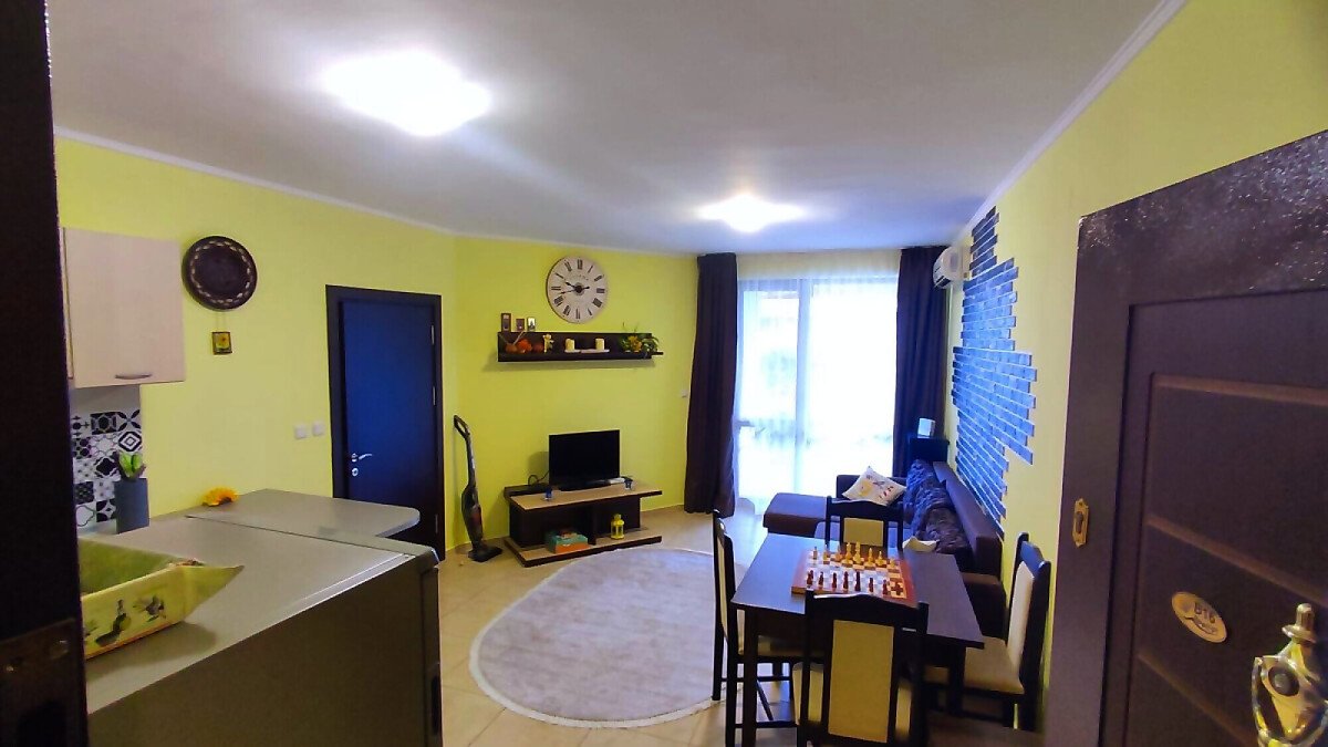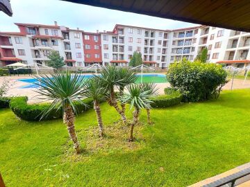 Апартаментът се продава в отлично състояние и разполага с всичко необходимо за комфортен престой или целогодишно живеене. Състои се от коридор, всекидневна с обособена зона за хранене и оборудван кухненски бокс, две спални, две бани с тоалетна и душ кабина, две тераси с красива гледка към басейна и към озеленената територия на комплекса.