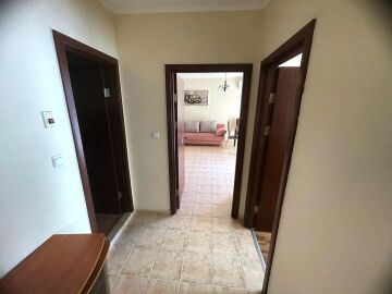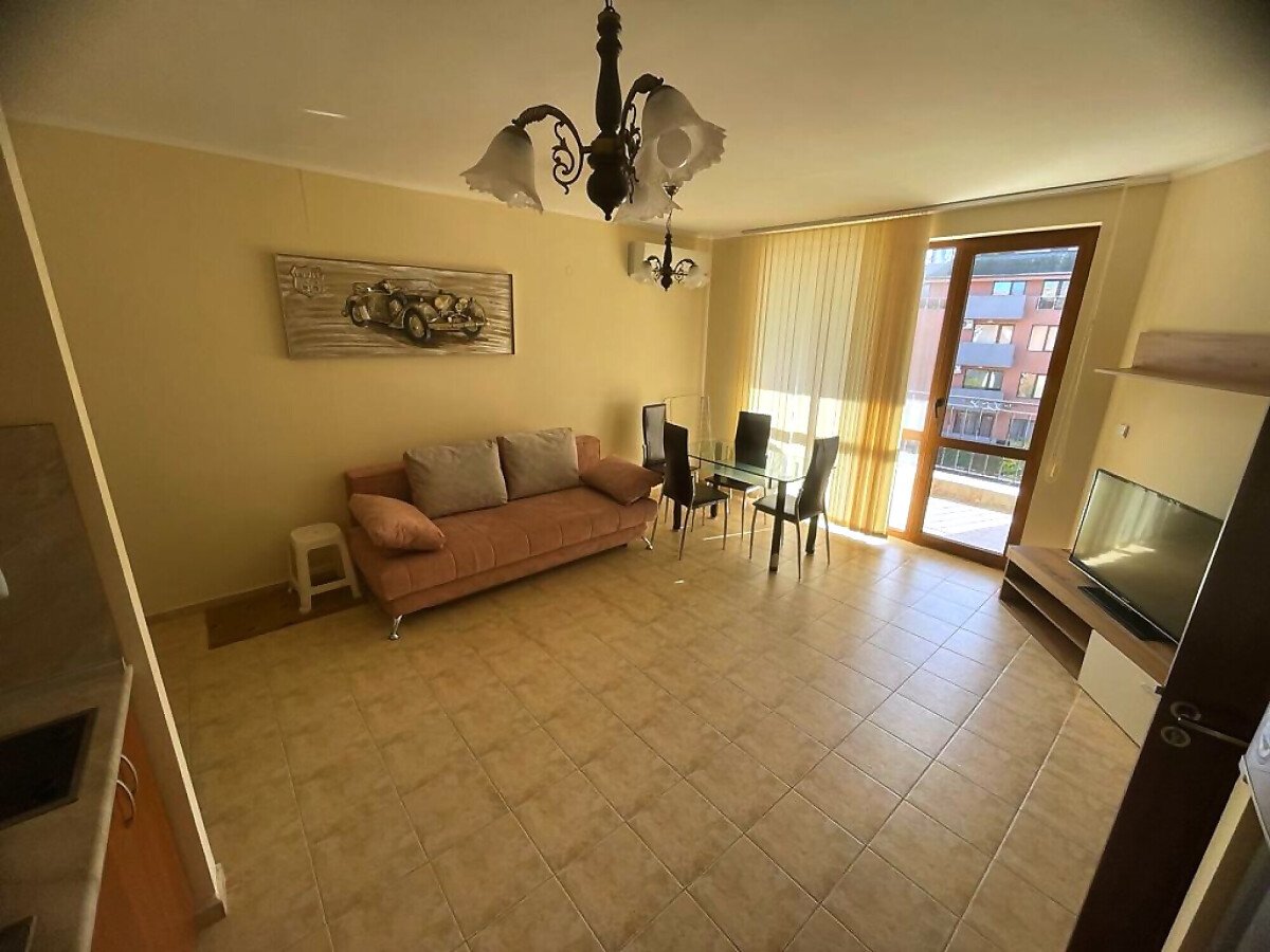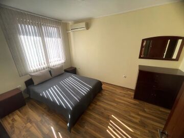 Апартаментът е разположен на трети етаж и се продава в отлично състояние, добре обзаведен и качествено оборудван, готов за нанасяне. Състои се от входно антре, всекидневна с кухненски бокс и зона за хранене, две спални, две бани с тоалетна, тераса с прекрасен изглед към озеленения двор на комплекса.