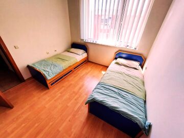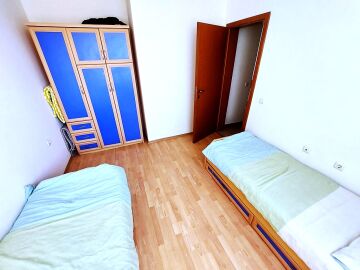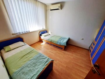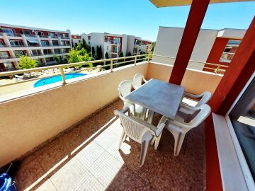 Апартаментът е разположен на четвърти, последен етаж и се състои от всекидневна с обособен кухненски бокс и кът за хранене, коридор, две спални, баня с тоалетна и душ кабина, отделна тоалетна, голяма тераса с красива гледка към басейна и озеленената част на комплекса. Продава се с целия пакет обзавеждане и оборудване, както е на снимките – има климатик във всяка стая.