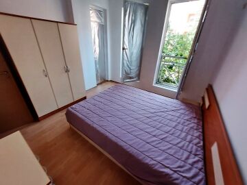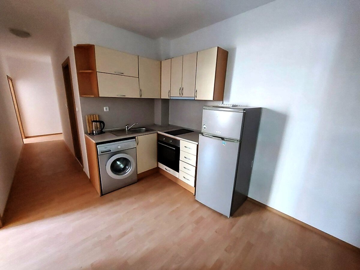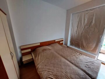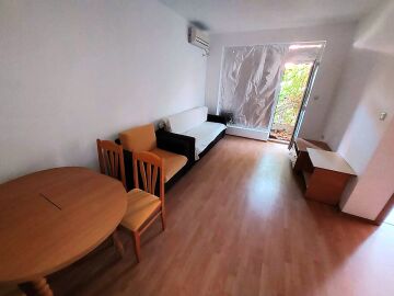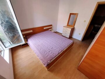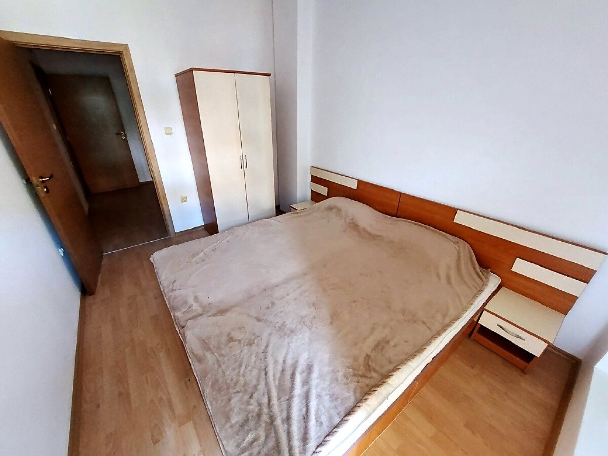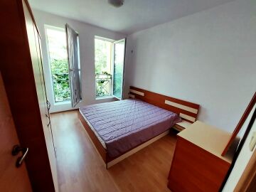 Апартаментът е разположен на втори етаж и се състои от голяма всекидневна с обособена зона за хранене и кухненски бокс, две спални, баня с тоалетна, тераса с изглед към озеленения двор на комплекса. За продажба в добро състояние, оборудван с домакинска електротехника, обзаведен с необходимите мебели, готов за живеене.