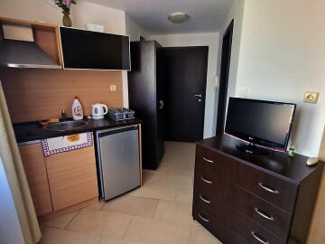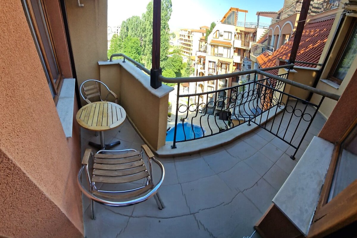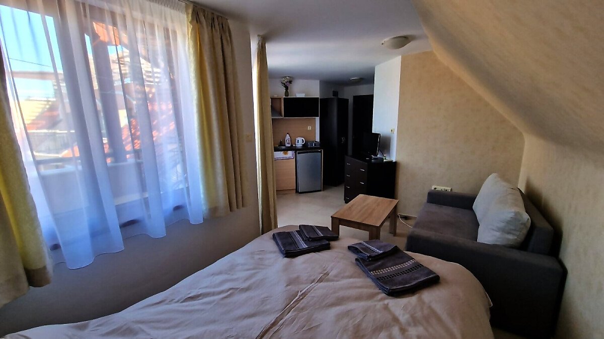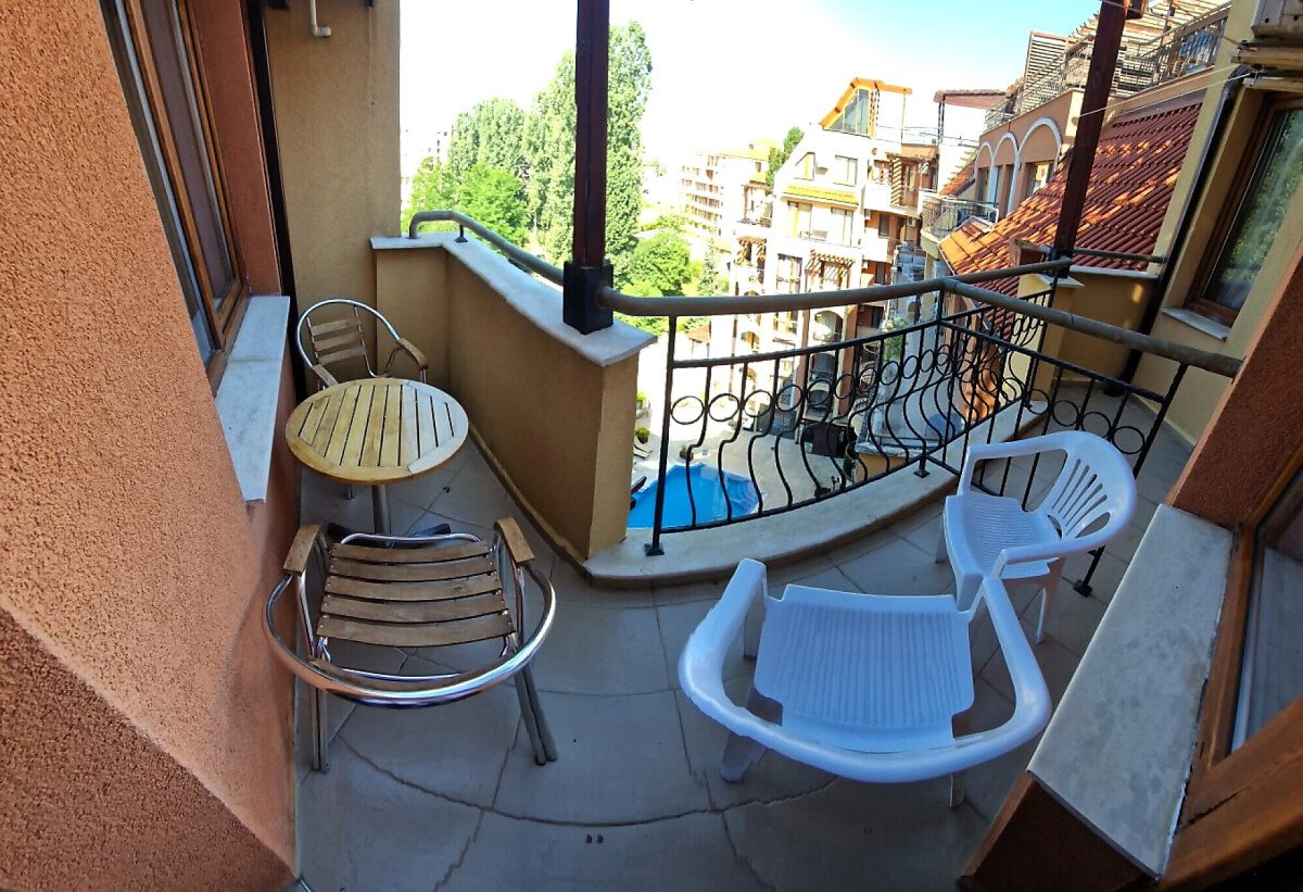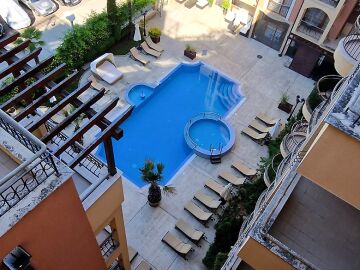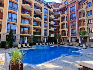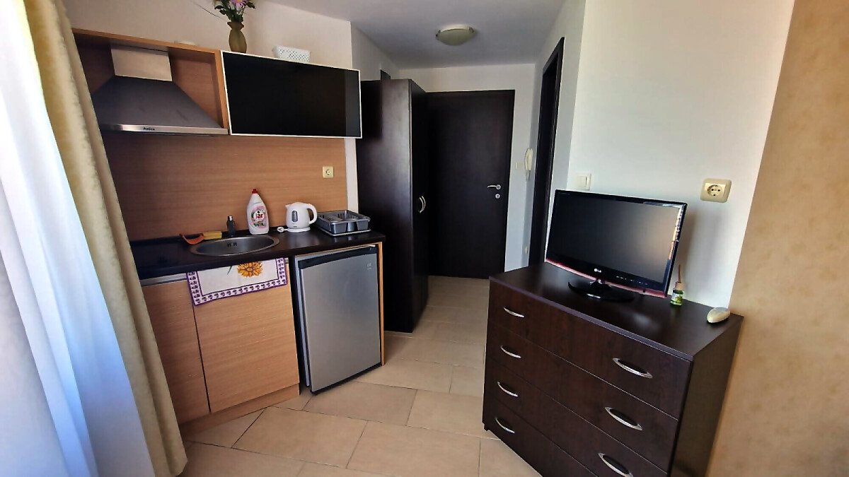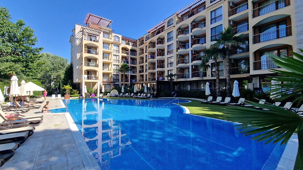 Предлагаме за продажба студио с гледка към басейна в луксозния жилищен комплекс “Harmony Suites 1“, разположен в северната част на курорта Слънчев бряг, на 700 метра от плажната ивица и морето.