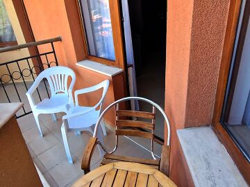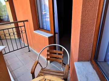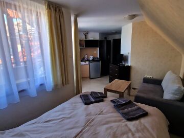 Студиото е разположено на седми, последен етаж и се състои от входно антре, всекидневна с напълно оборудван кухненски бокс и спалня, баня с тоалетна, тераса с чудесна гледка към басейна и озеленената вътрешна територия на комплекса.