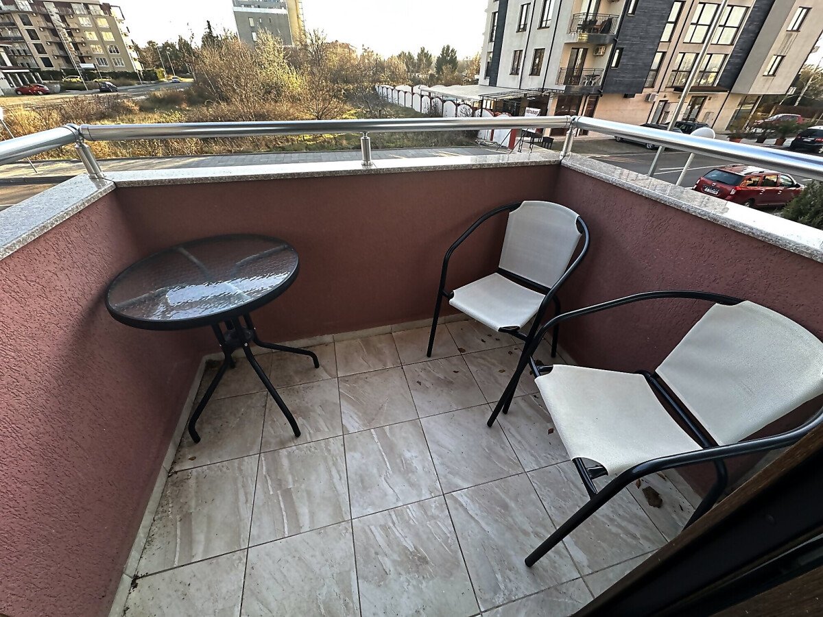 Студиото е разположено на втори етаж, напълно обзаведено, със следното разпределение – голяма всекидневна с обособена спалня, баня с тоалетна и душ кабина, тераса с гледка към двора.