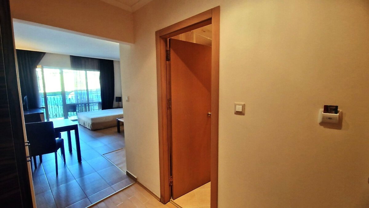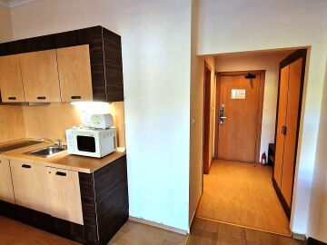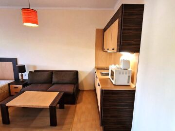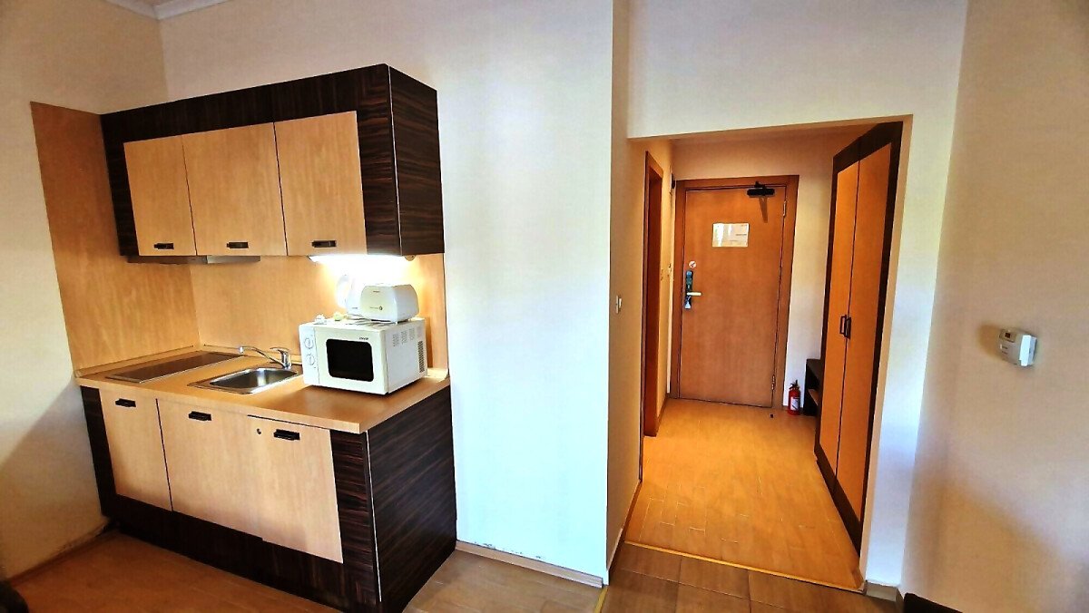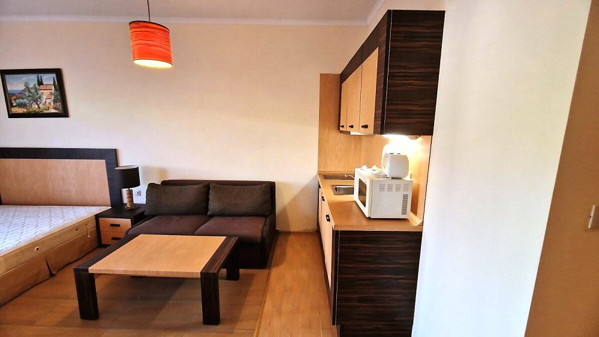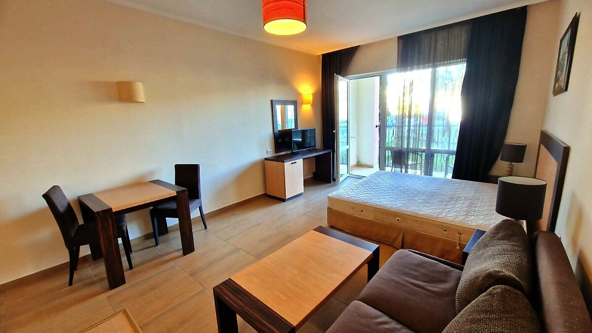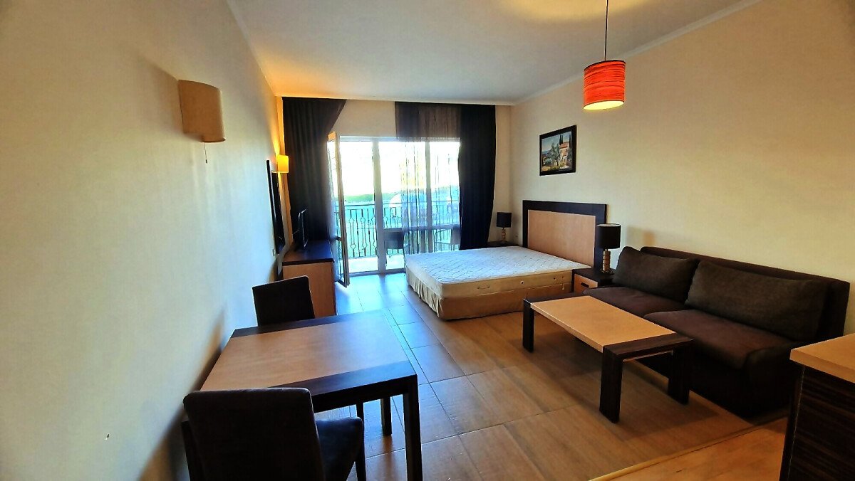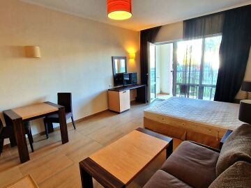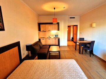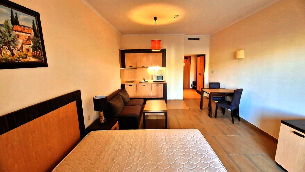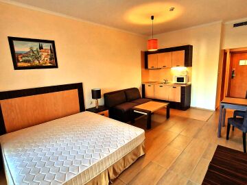 Студиото се намира на партерен етаж и има следното разпределение – входно антре, голяма всекидневна с обособен кухненски бокс, спалня и зона за хранене, баня с тоалетна и вана, тераса с чудесна гледка към озеленения двор на комплекса.