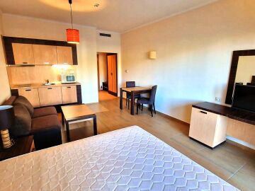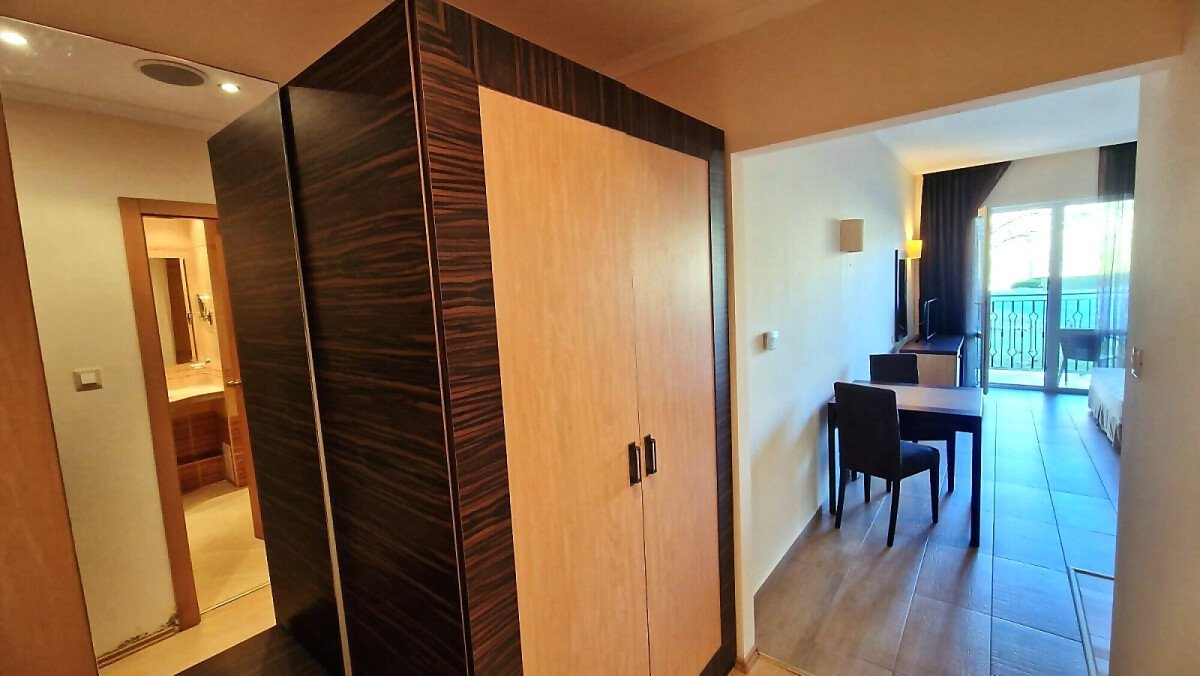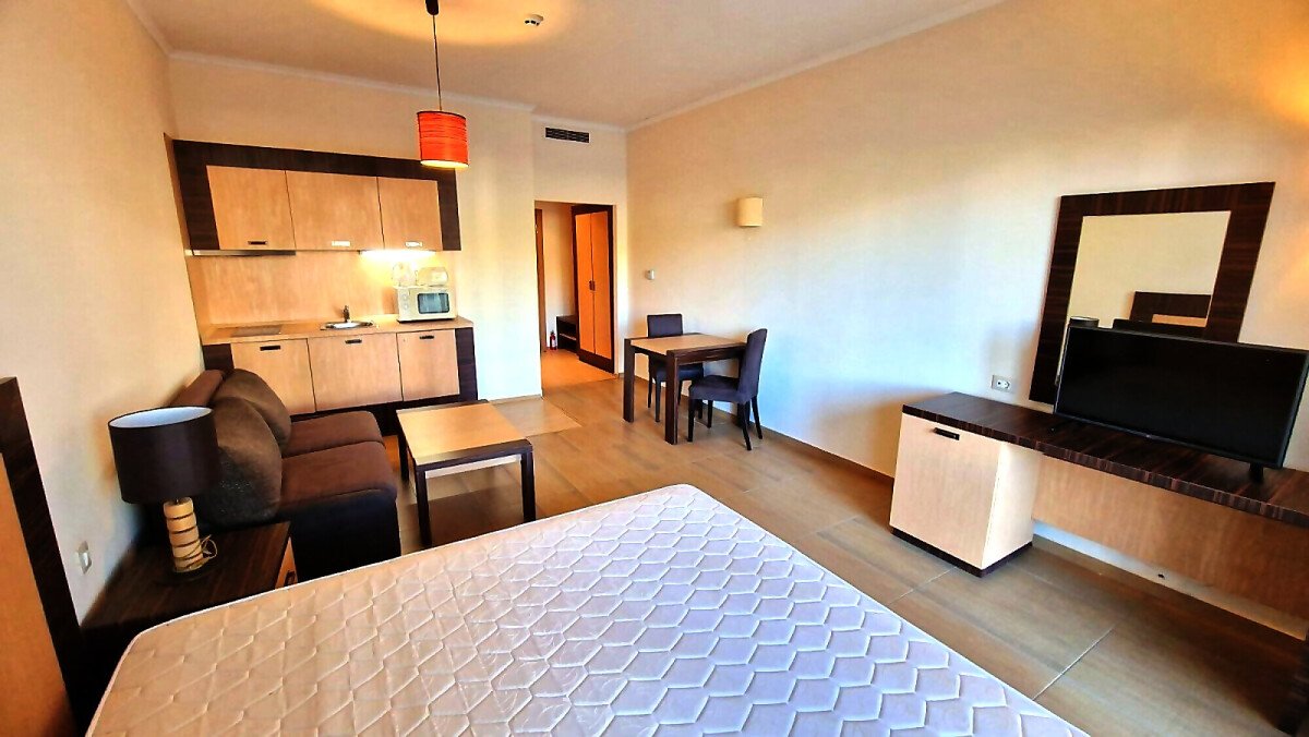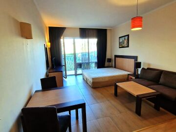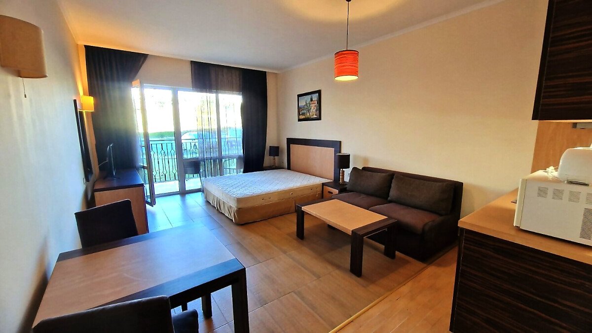Предлагаме за продажба просторно студио в невероятния комплекс „Маджестик“, разположен в северната част на Слънчев бряг, на първа брегова линия с директен достъп до плажната ивица. В непосредствена близост е централната алея на курорта, където може да откриете и да се насладите на разнообразие от магазини, летни атракции, ресторанти, плажни барове и нощни клубове.