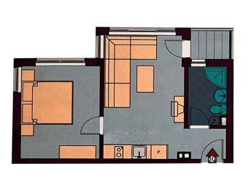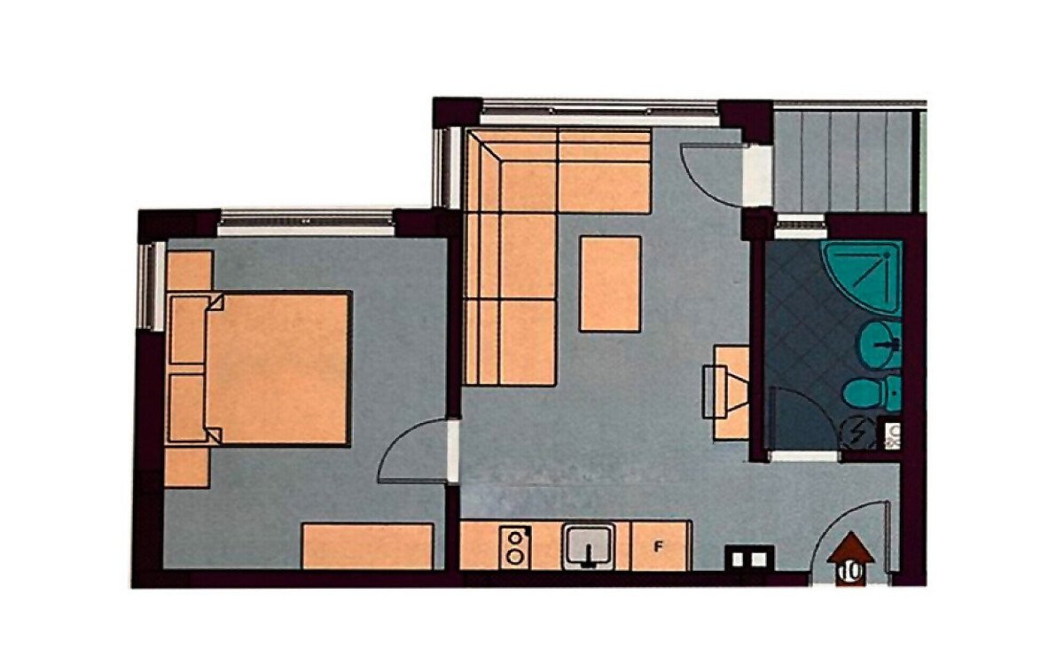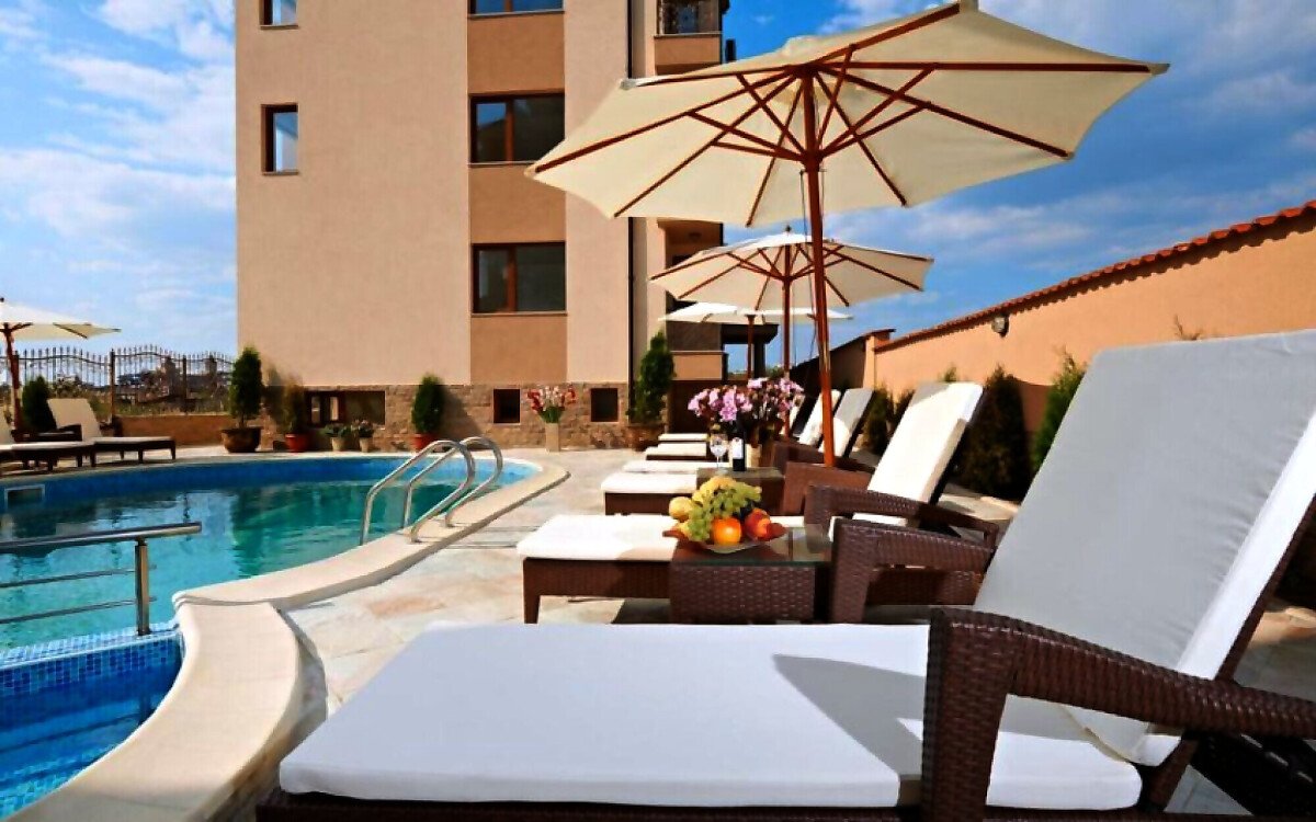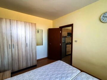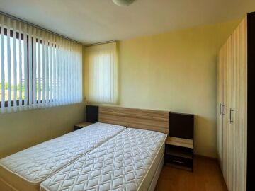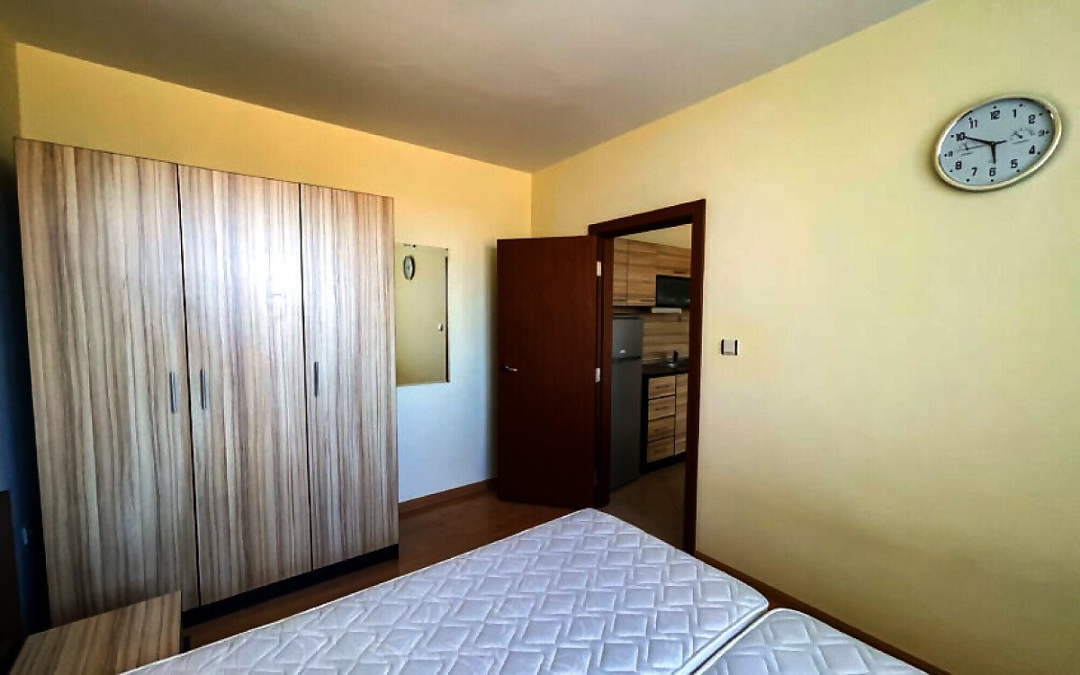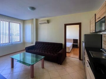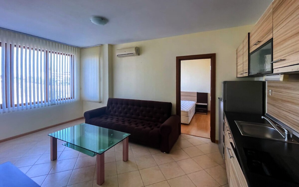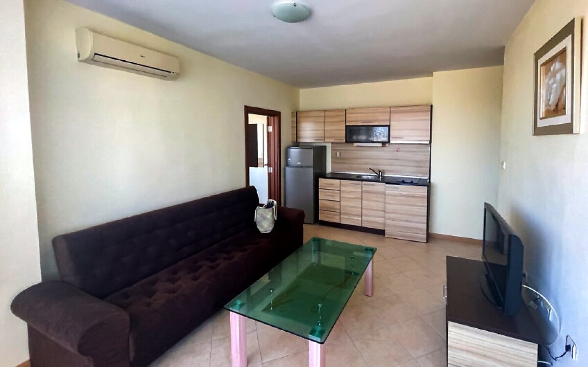 Имотът е разположен на трети етаж в сграда без асансьор и има следното разпределение – голяма всекидневна с оборудван кухненски бокс и трапезария, спалня, баня с тоалетна, балкон с гледка към курорта и към басейна.