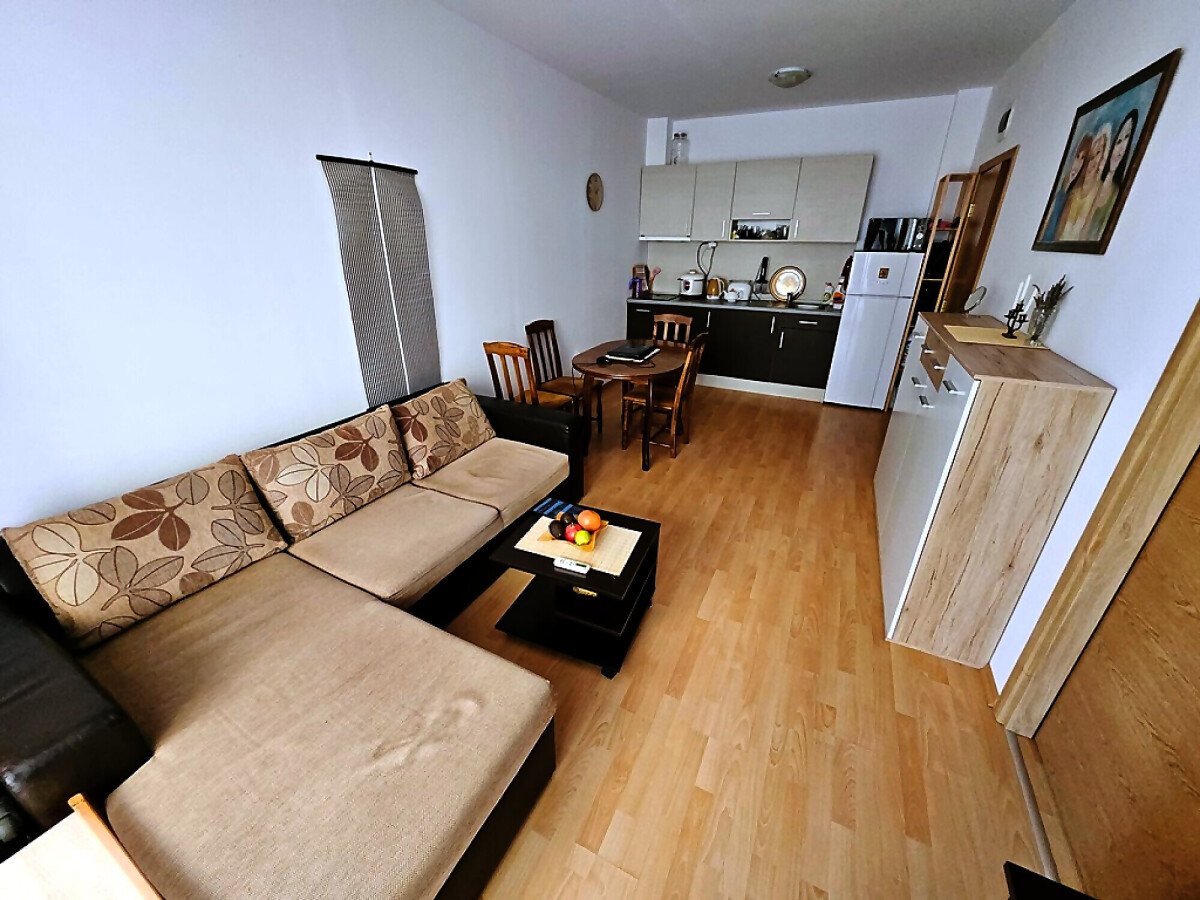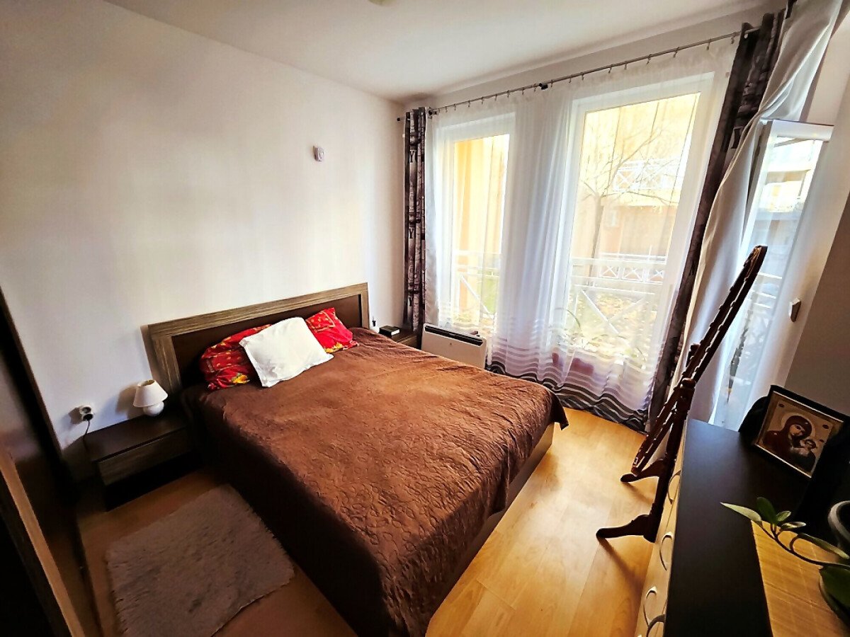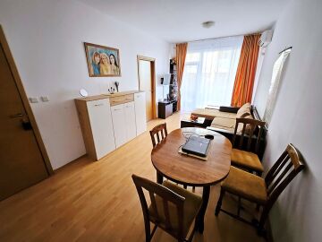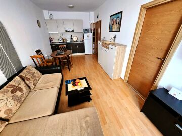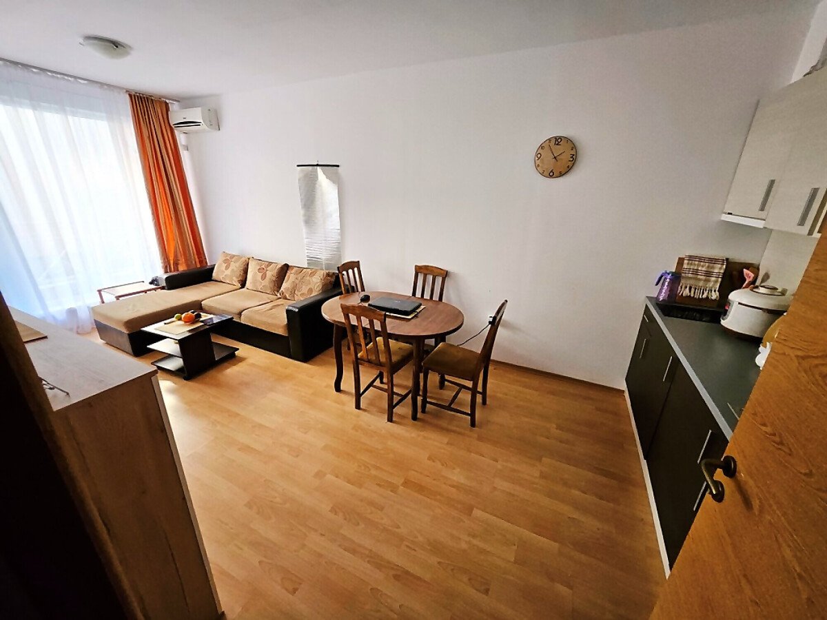 Апартаментът е разположен на първи етаж и се състои от всекидневна с обособен кът за хранене и оборудван кухненски бокс, спалня, баня с тоалетна и душ кабина, тераса с гледка към озеленения двор.