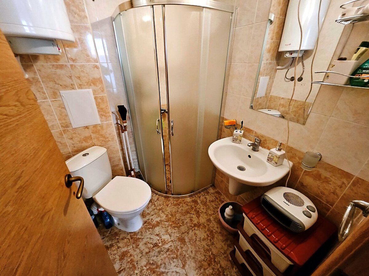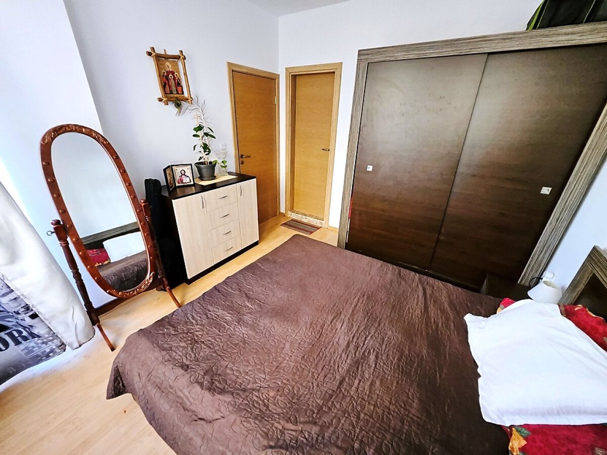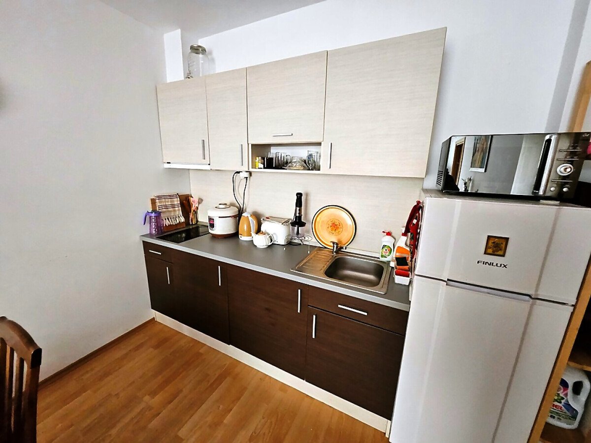 Апартаментът е разположен на първи етаж и се състои от всекидневна с обособен кът за хранене и оборудван кухненски бокс, спалня, баня с тоалетна и душ кабина, тераса с гледка към озеленения двор.