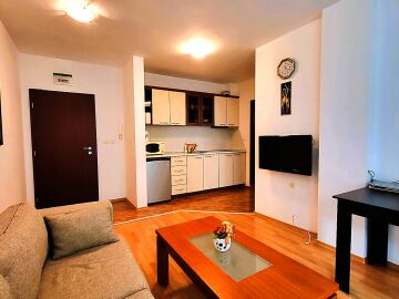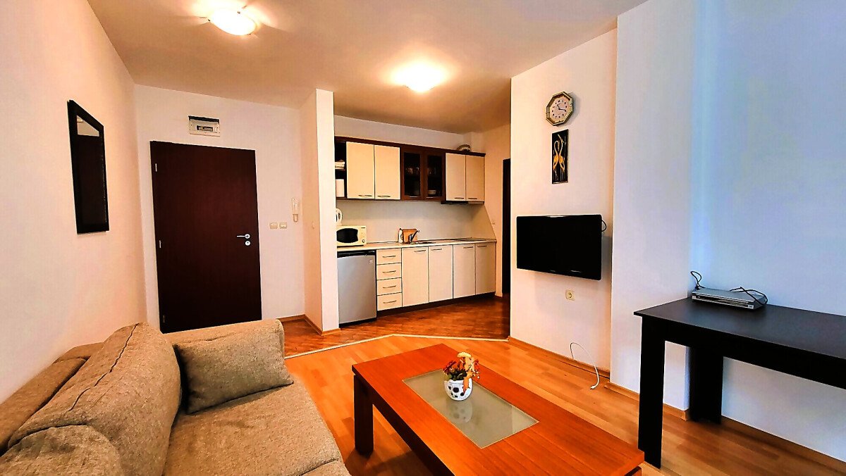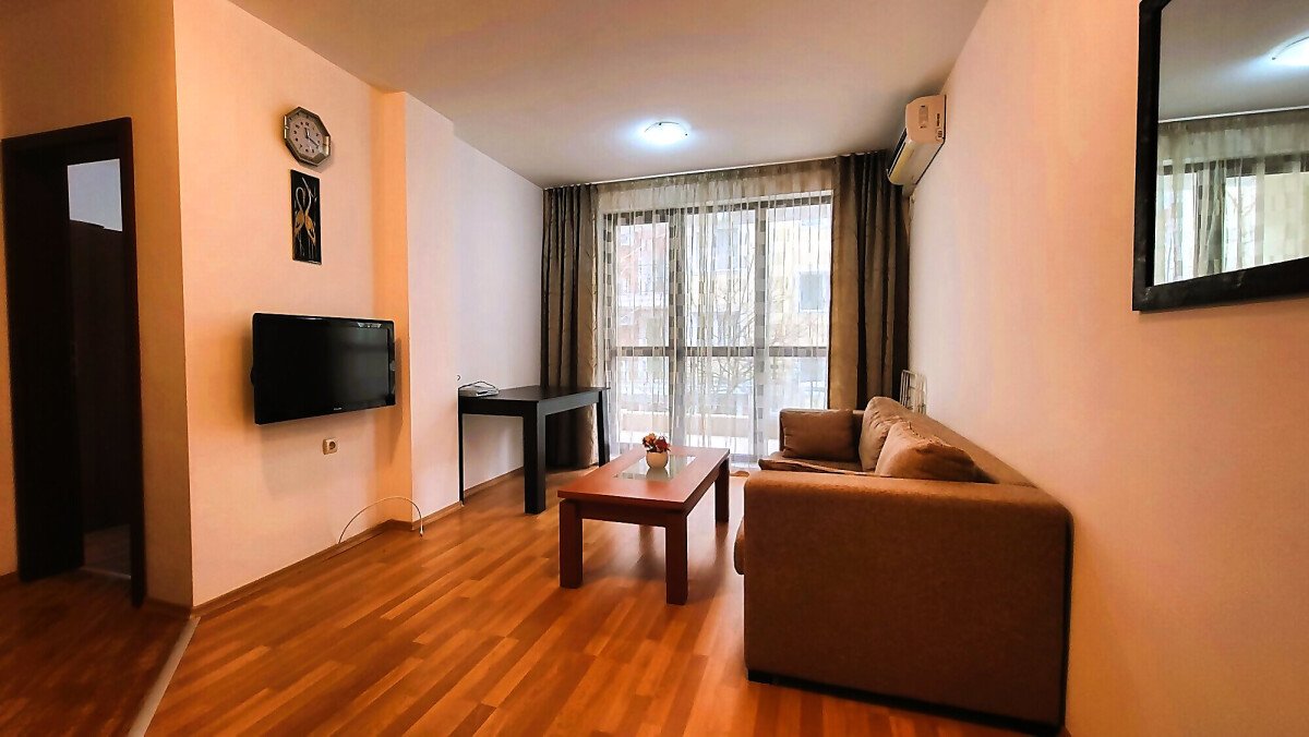 Имотът е разположен на втори етаж, продава се обзаведен и оборудван, със следното разпределение – всекидневна с кухненски бокс, спалня, баня с тоалетна и душ кабина, слънчева тераса с гледка към озеленената част на сградата.