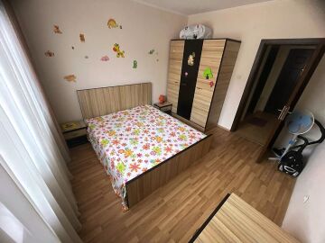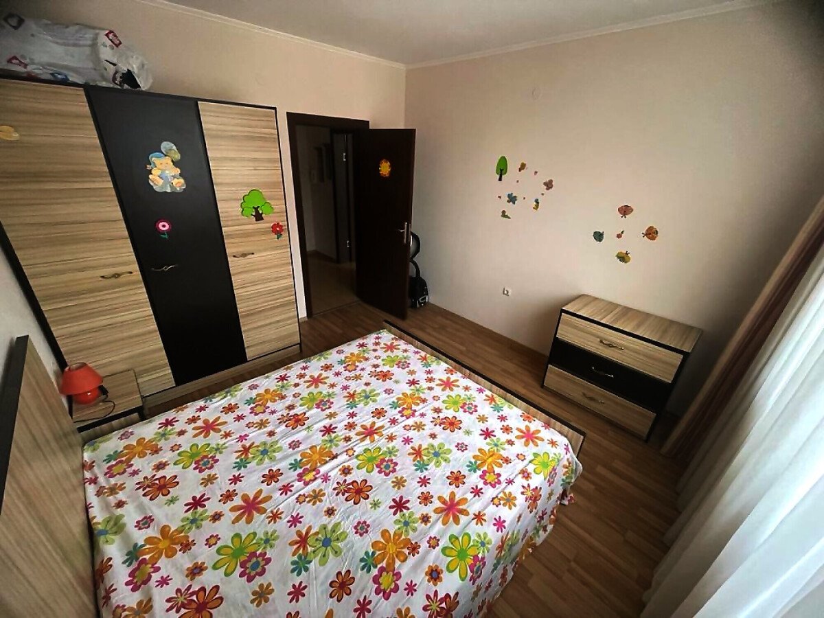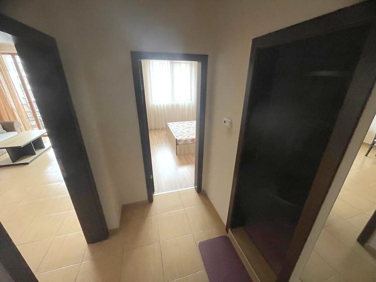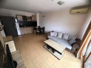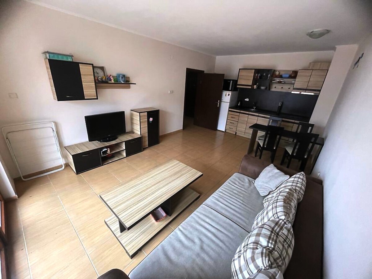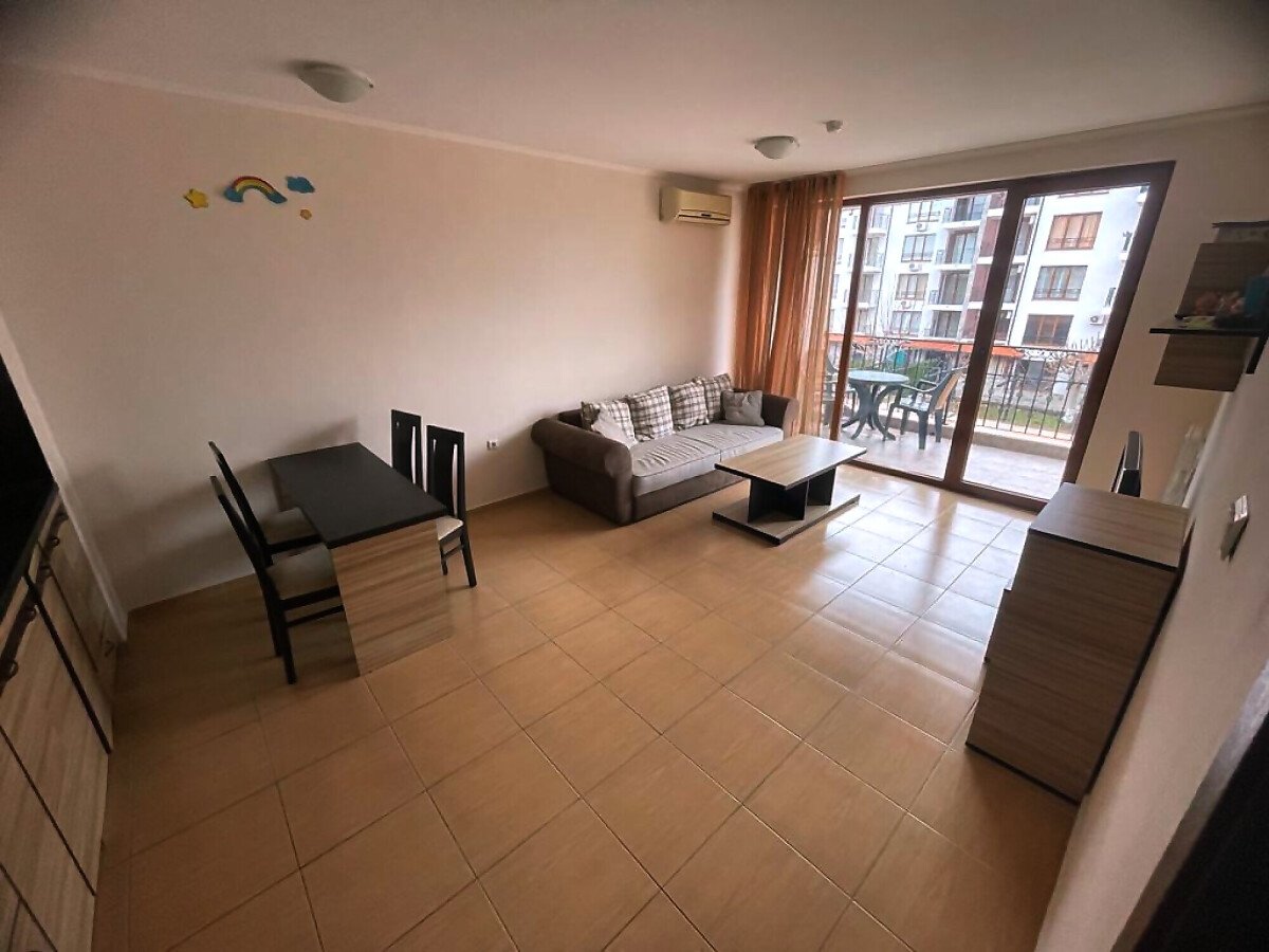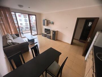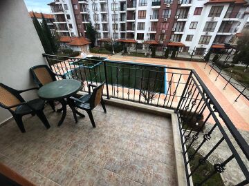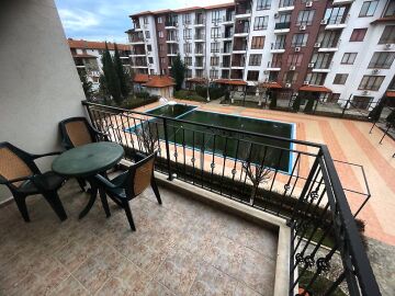 Ние Ви предлагаме да станете собственик на светъл двустаен апартамент с гледка към басейна в този комплекс. Имотът е разположен на трети етаж и се състои от входно антре, голяма всекидневна с трапезария и оборудван кухненски бокс, баня с тоалетна и душ кабина, спалня, просторна тераса с прекрасен изглед към басейна и озеленената вътрешната територия на сградата.