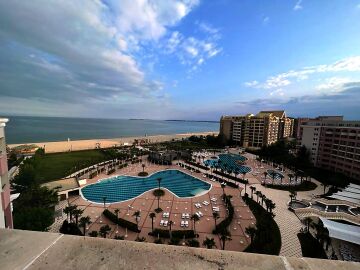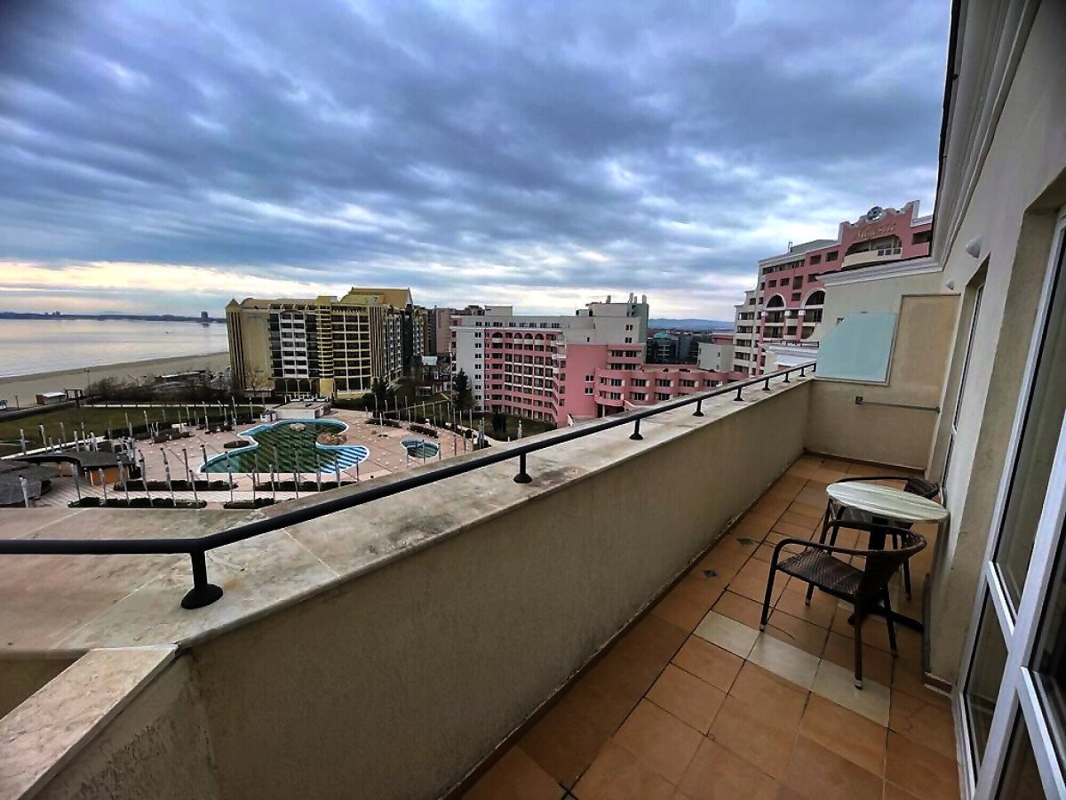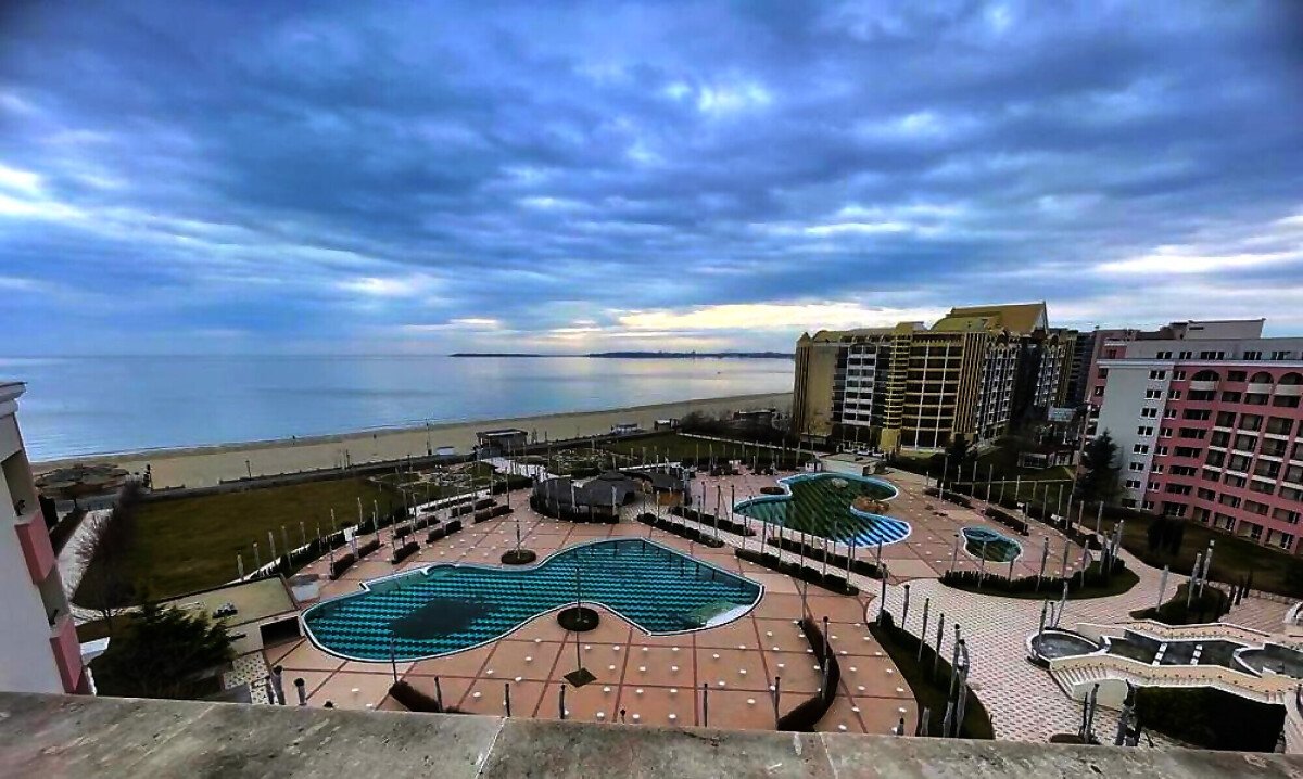 Предлагаме за продажба просторен двустаен апартамент с панорамна гледка към морето и към басейна в невероятния комплекс „Маджестик“, намиращ се в северната част на курорта Слънчев бряг, на първа брегова линия. Точно пред комплекса се намира плажната ивица, където може да се насладите на плажни барове и водни спортове.