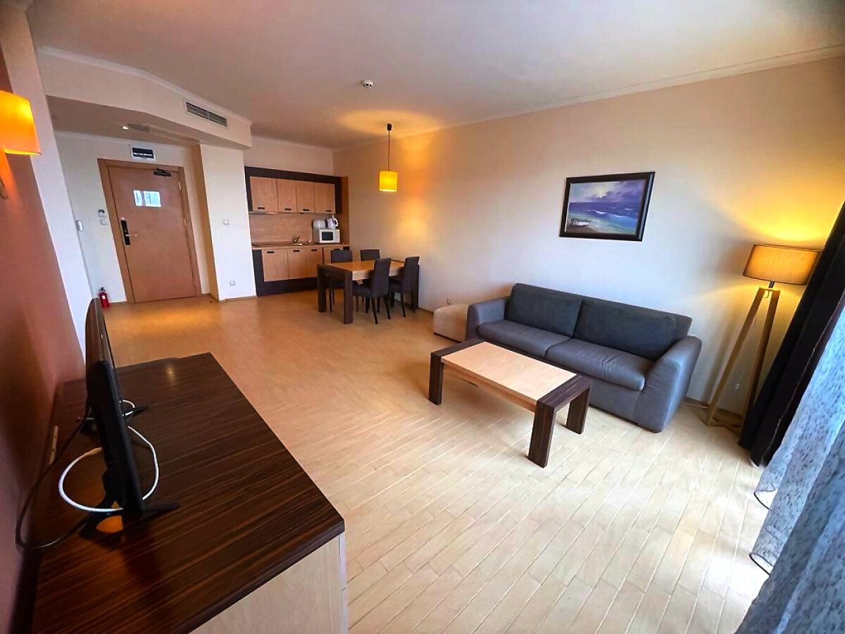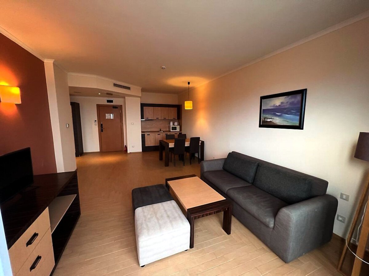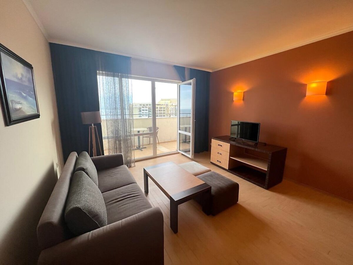 Апартаментът е разположен на девети етаж и разкрива уникална панорамна гледка към морето, басейните на комплекса и озеленената вътрешна територия. Имотът има следното разпределение – входно антре, голяма всекидневна с трапезария и оборудван кухненски бокс, баня с тоалетна и вана, спалня, просторен балкон.