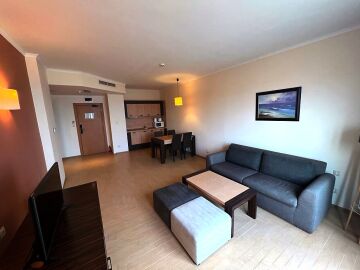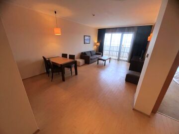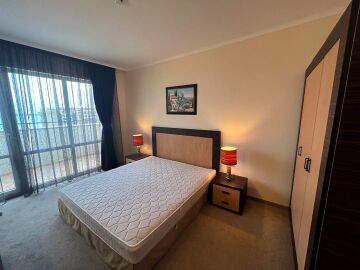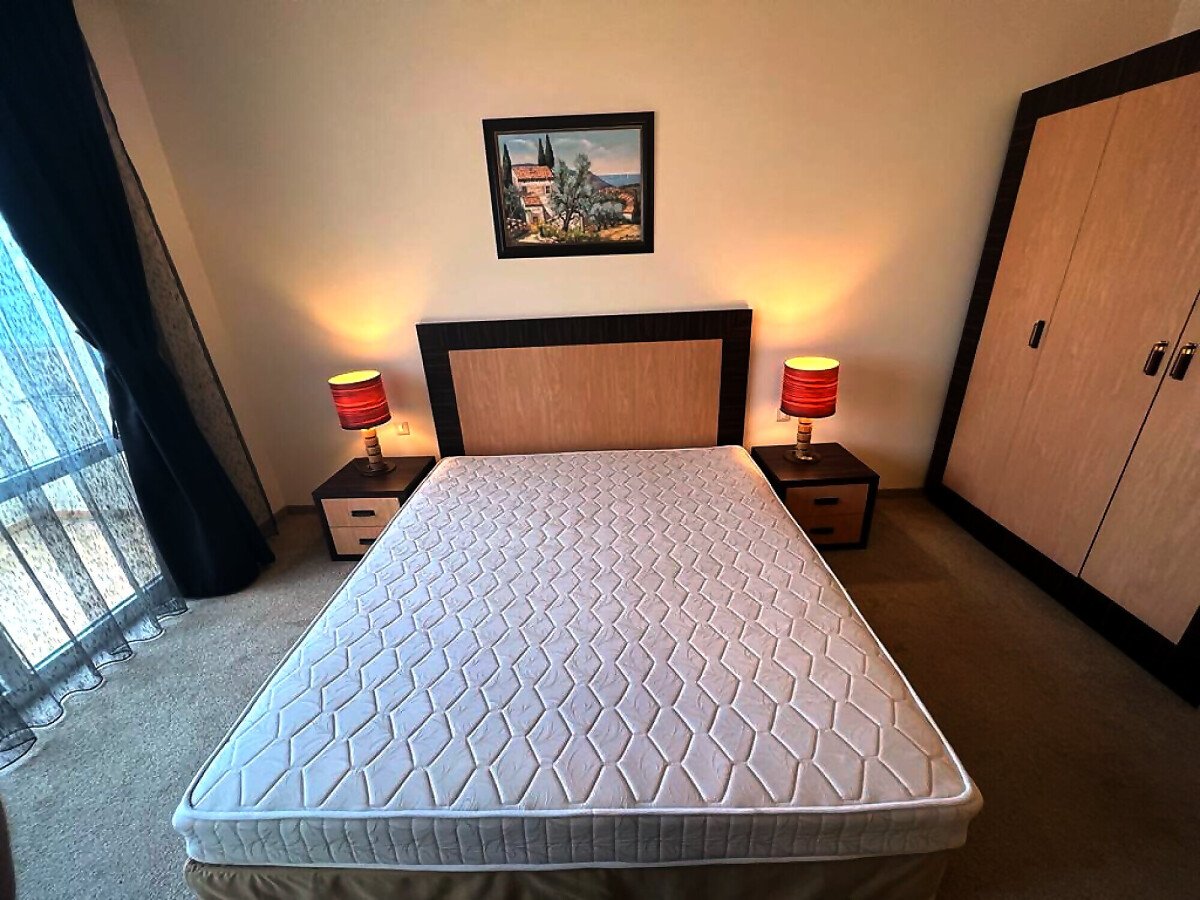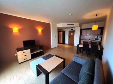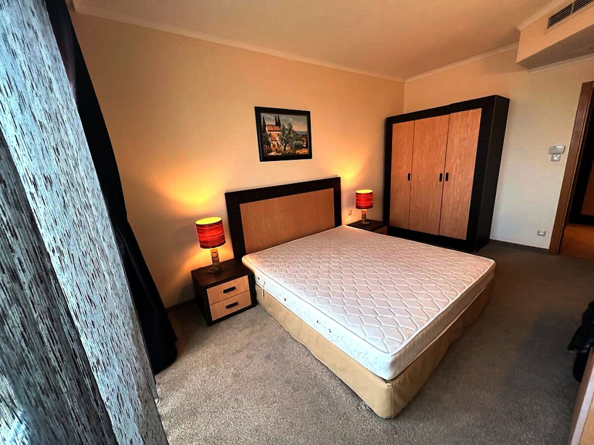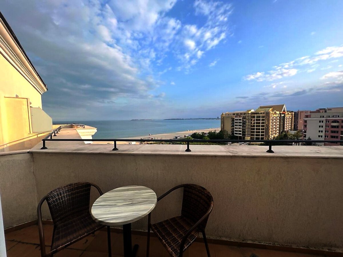 Апартаментът е разположен на девети етаж и разкрива уникална панорамна гледка към морето, басейните на комплекса и озеленената вътрешна територия. Имотът има следното разпределение – входно антре, голяма всекидневна с трапезария и оборудван кухненски бокс, баня с тоалетна и вана, спалня, просторен балкон.