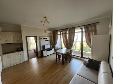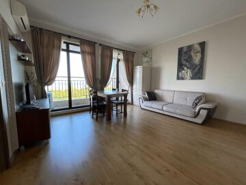Апартаментът е слънчев и много функционален, разположен на пети етаж, със следното разпределение – входно антре, голяма всекидневна с кухненски бокс и трапезария, две спални, две бани с тоалетна, три тераси с невероятна гледка към морето и към озеленения парк.