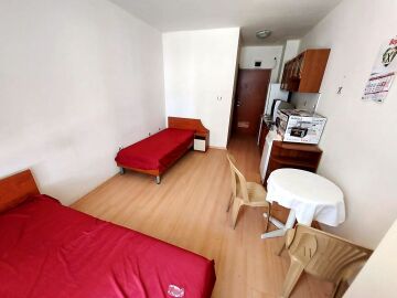 Апартаментът се продава с мебели и оборудване, разположен на партерен етаж, със следното разпределение – входно антре, всекидневна с две единични легла, кухненски бокс и кът за хранене, баня с тоалетна. Имотът няма балкон.