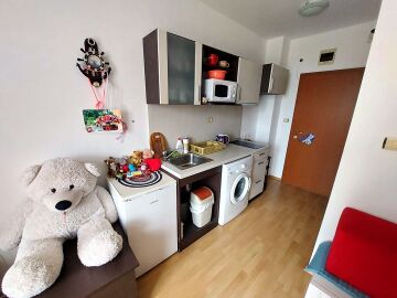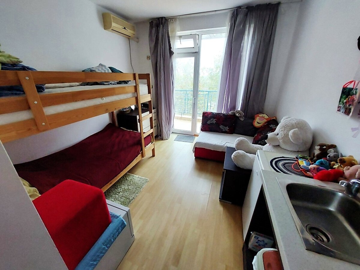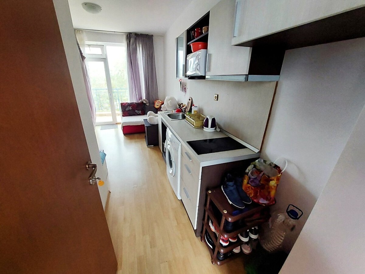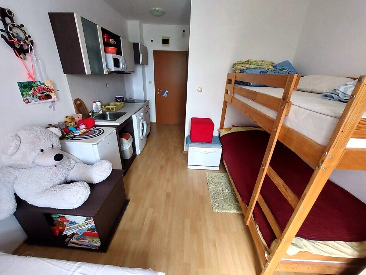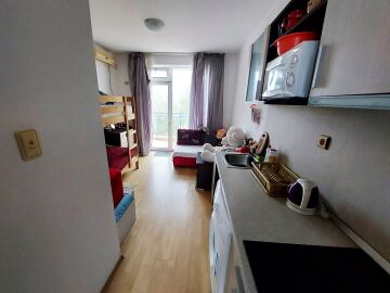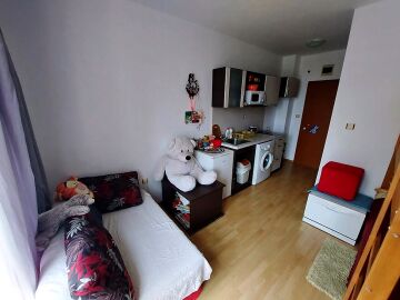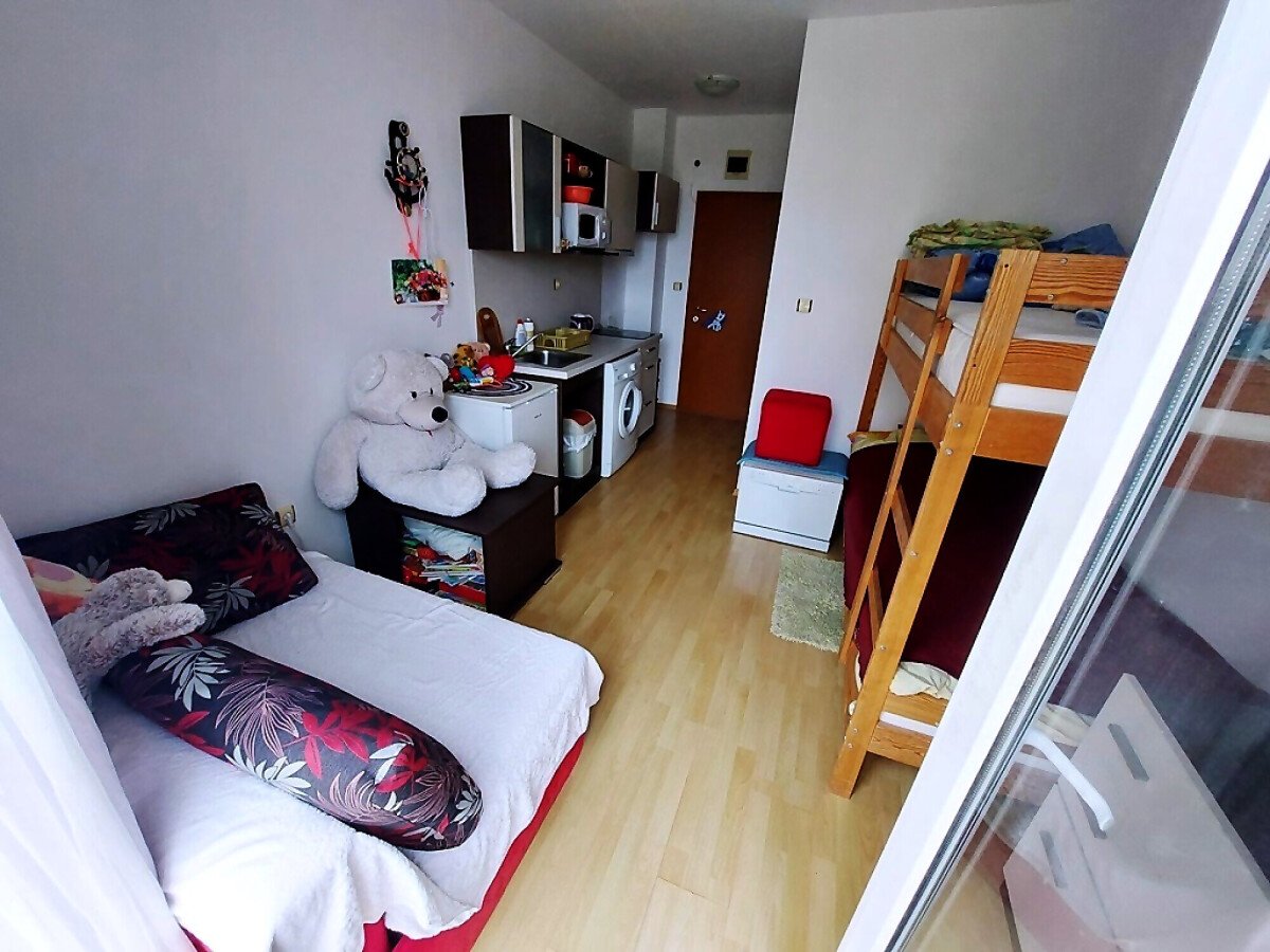 Студиото е разположено на четвърти, последен етаж и се продава с обзавеждане и оборудване. Имотът е с южно изложение и се състои от входно антре с кухненски бокс, всекидневна с двуетажно легло, баня с тоалетна, тераса с гледка към двора.