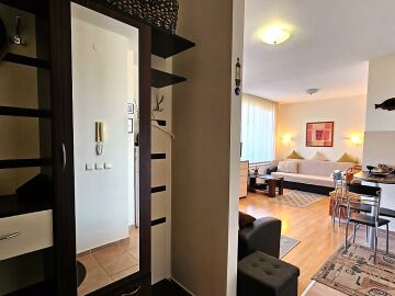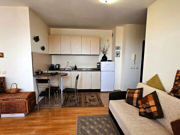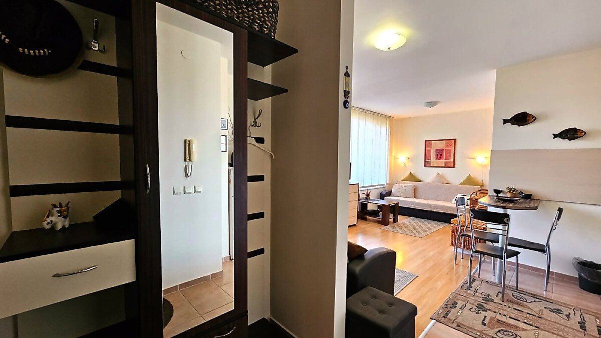 Студиото е разположено на четвърти, последен етаж и се състои от входно антре, голяма всекидневна с трапезария и напълно оборудван кухненски бокс, баня с тоалетна и душ кабина, просторен балкон с чудесен изглед към озеленения двор.