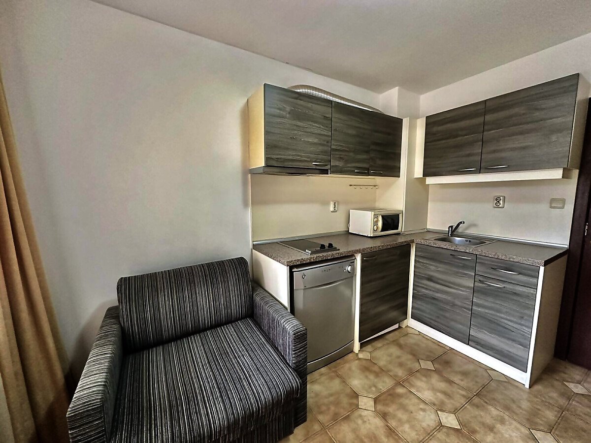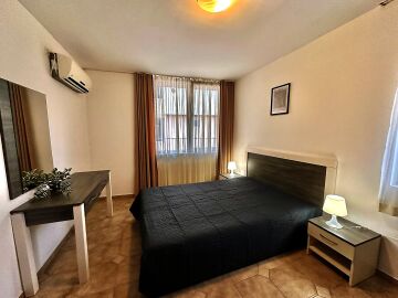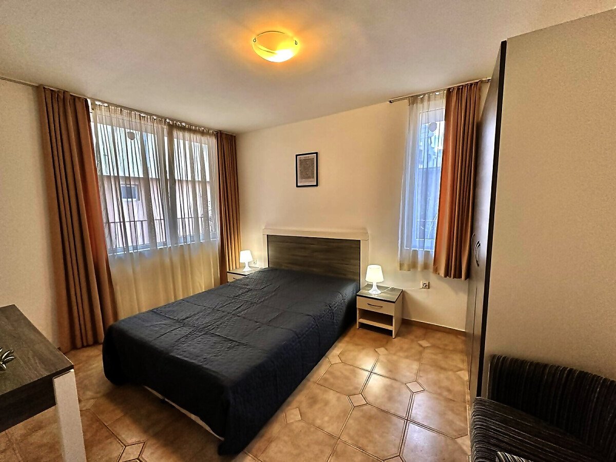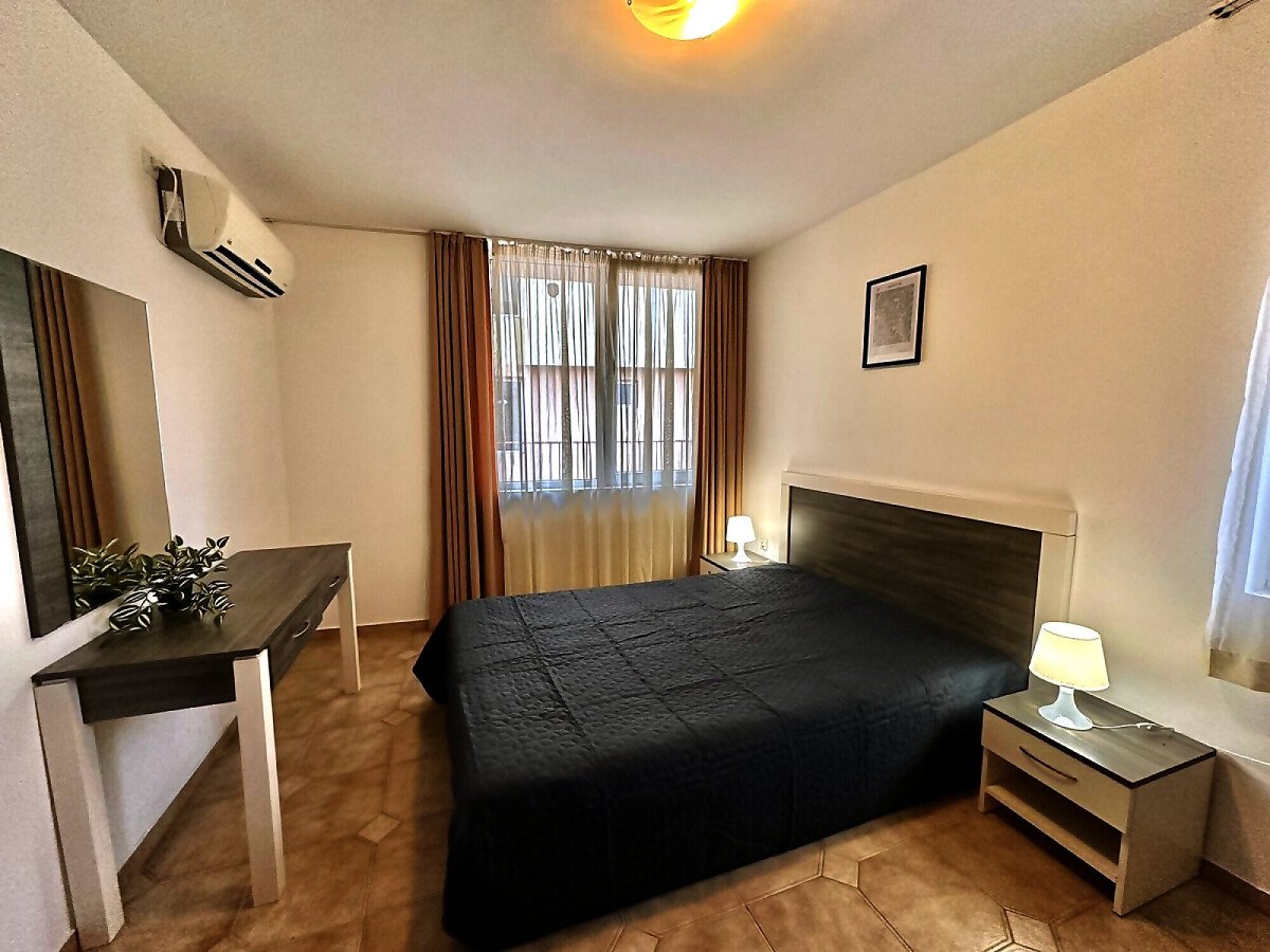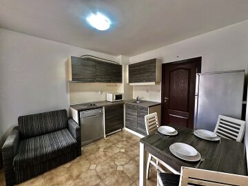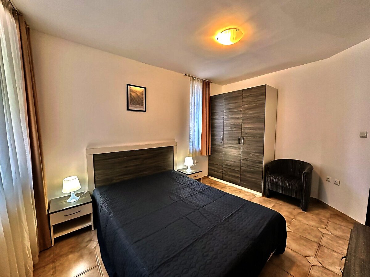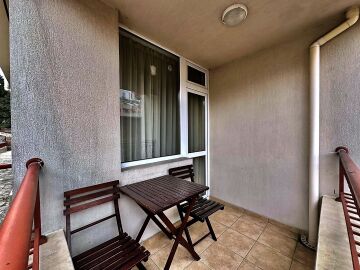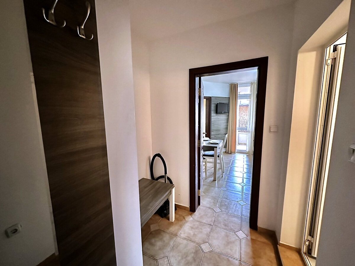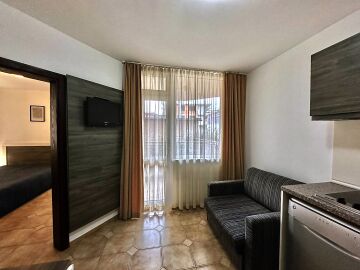 Апартаментът е разположен на първи жилищен етаж и се състои от входно антре, малка всекидневна с оборудван кухненски бокс и зона за хранене, уютна спалня, баня с тоалетна, балкон с изглед към двора.