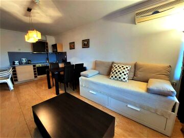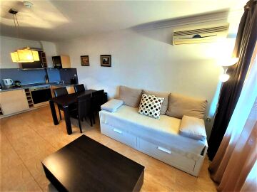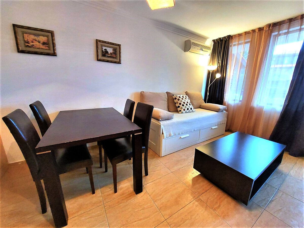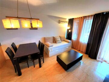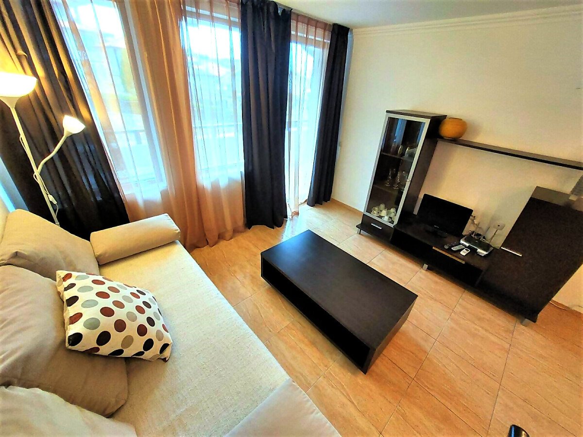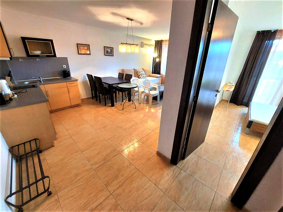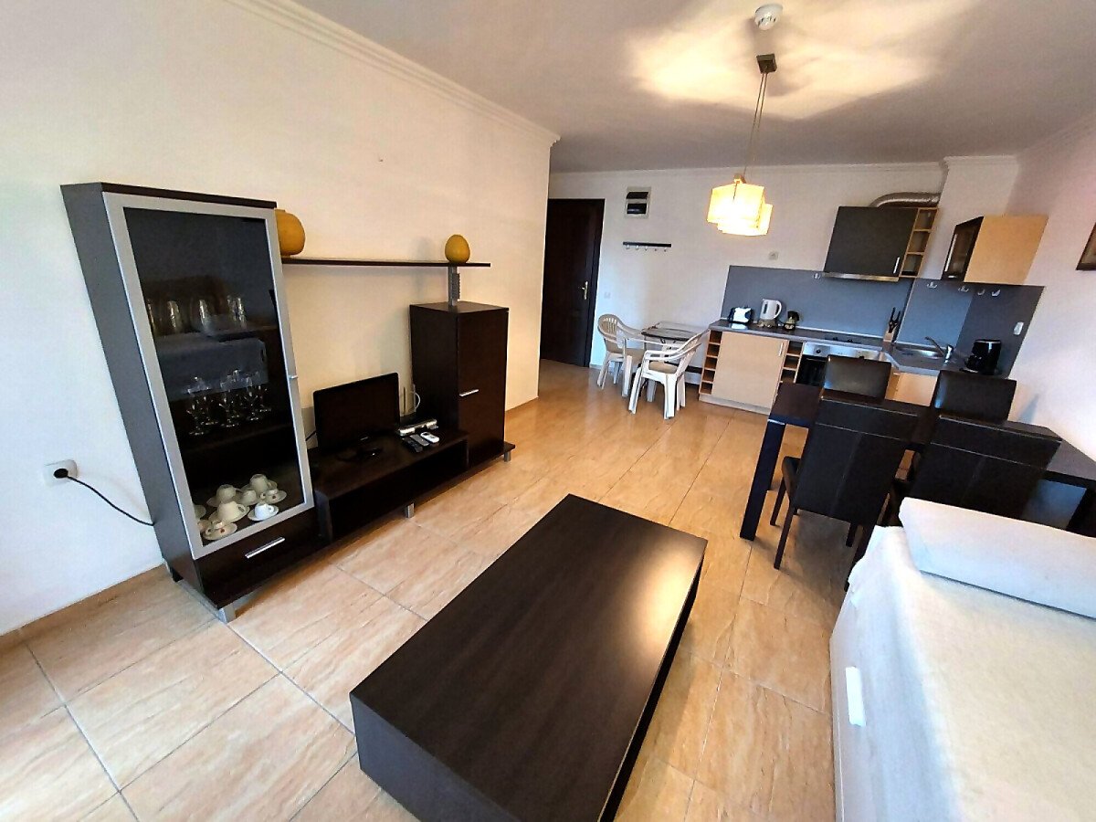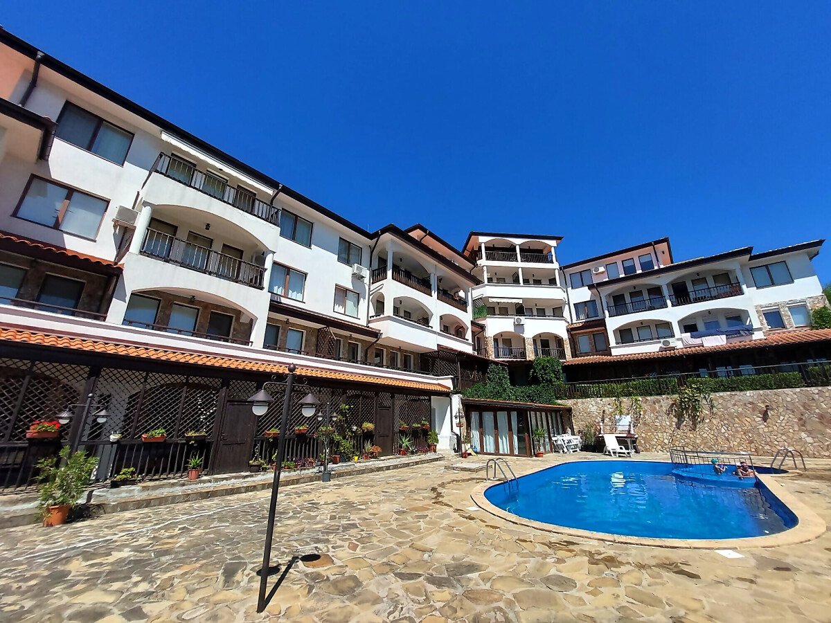 Апартаментът се продава в отлично състояние, напълно оборудван и обзаведен, със следното разпределение – просторна всекидневна с обособен кухненски бокс и трапезария, баня с тоалетна, спалня, балкон с невероятен изглед към морето, басейна и вътрешната територия на комплекса.