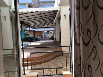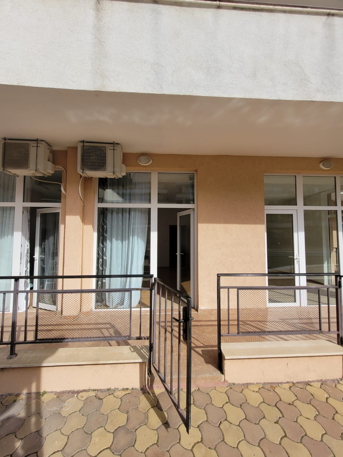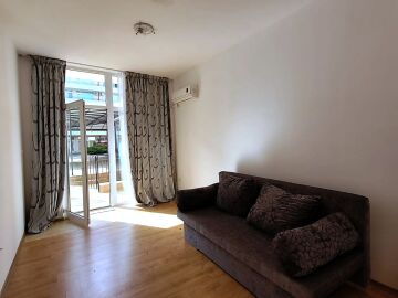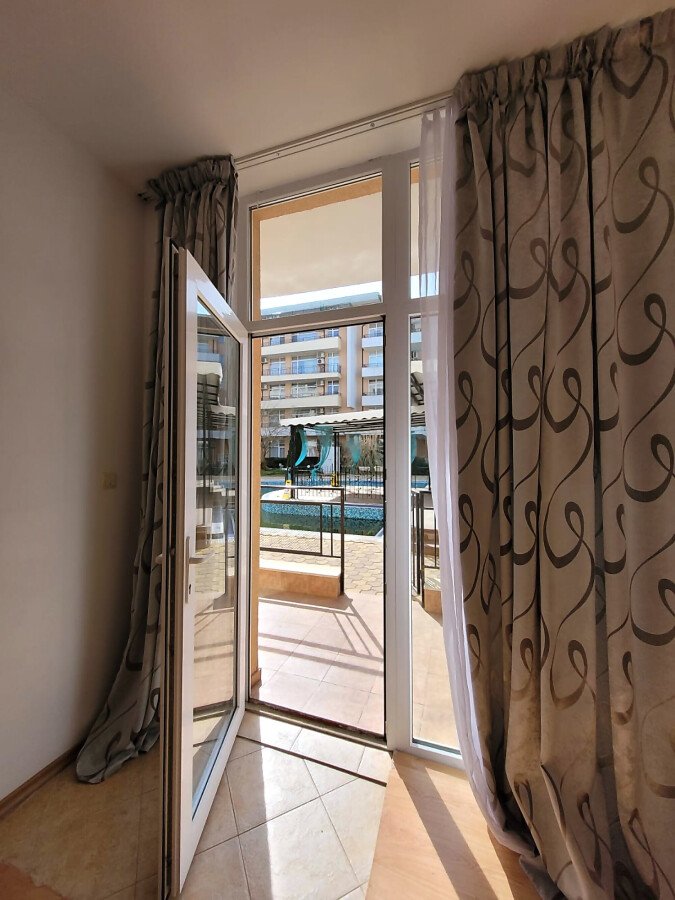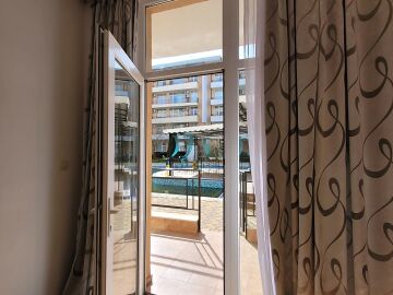 Апартаментът е на партерен етаж и се състои от всекидневна с кухненски бокс, две спални, баня с тоалетна и душ кабина, просторен балкон с изход към басейна и вътрешната територия на комплекса.