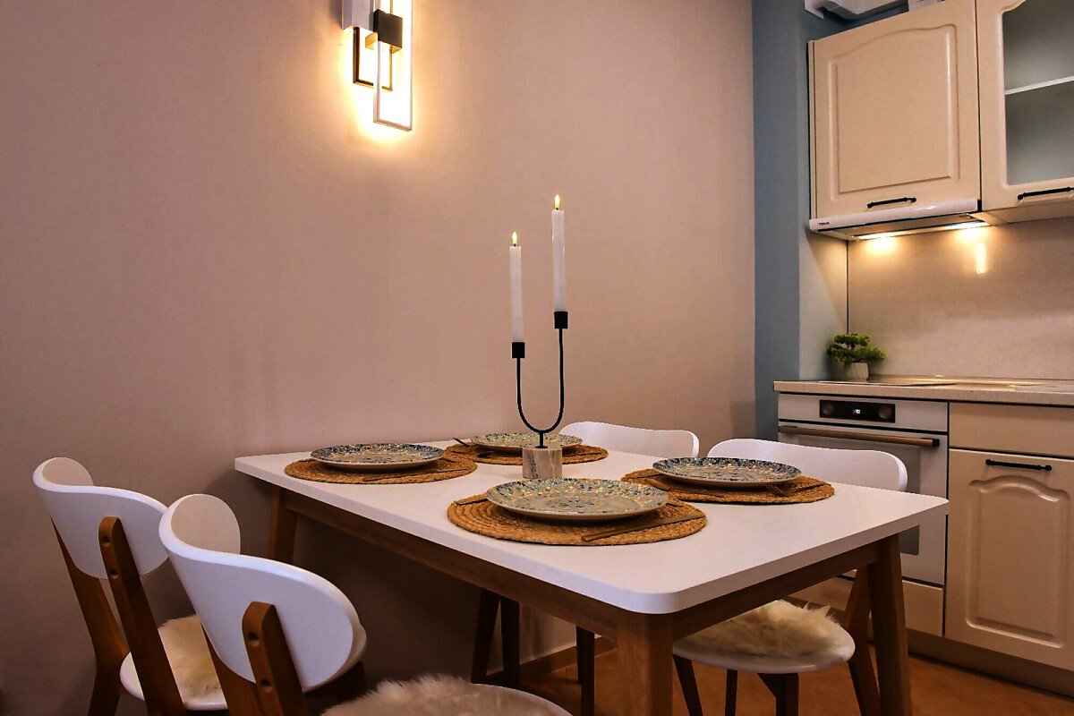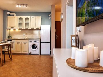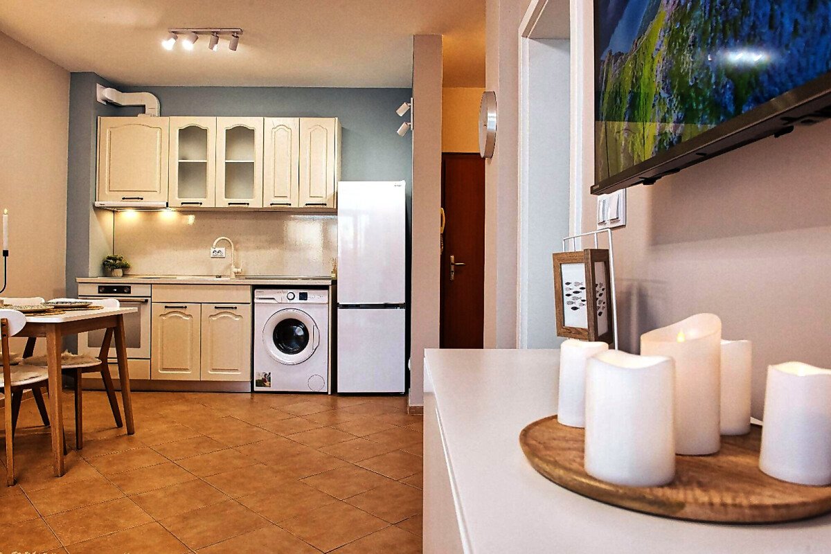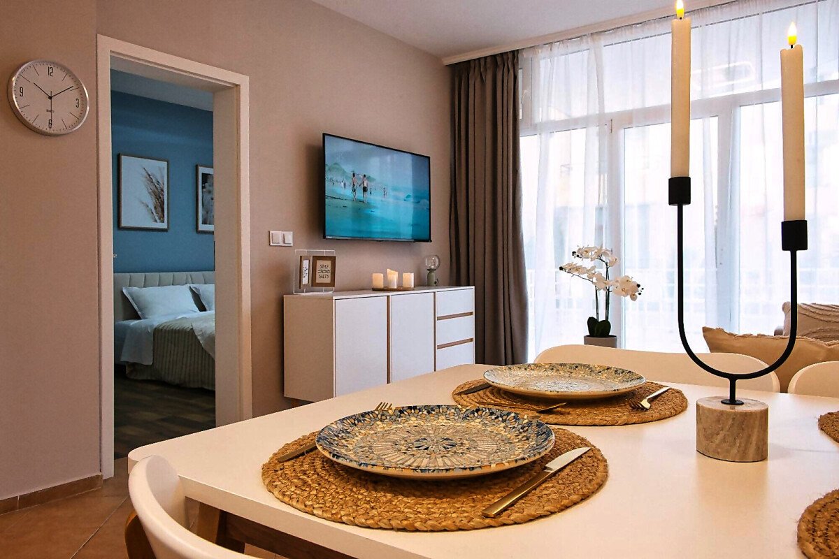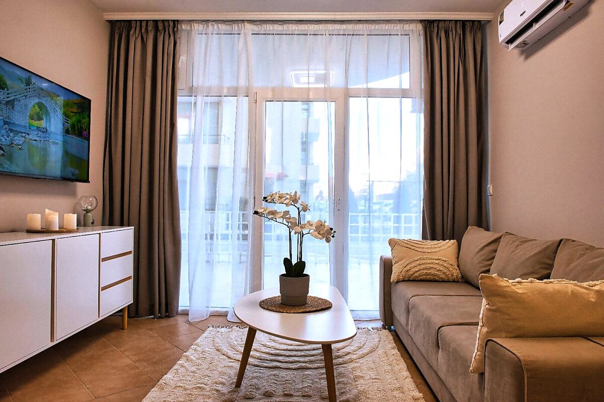 Апартаментът е уютен и много функционален, със следното разпределение – входно антре, всекидневна с оборудван кухненски бокс и трапезария, баня с тоалетна и вана, спалня, просторен балкон.