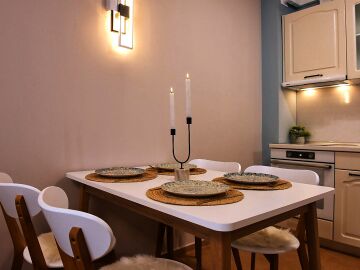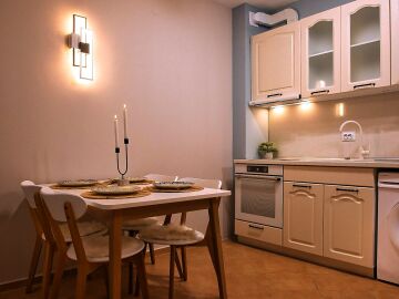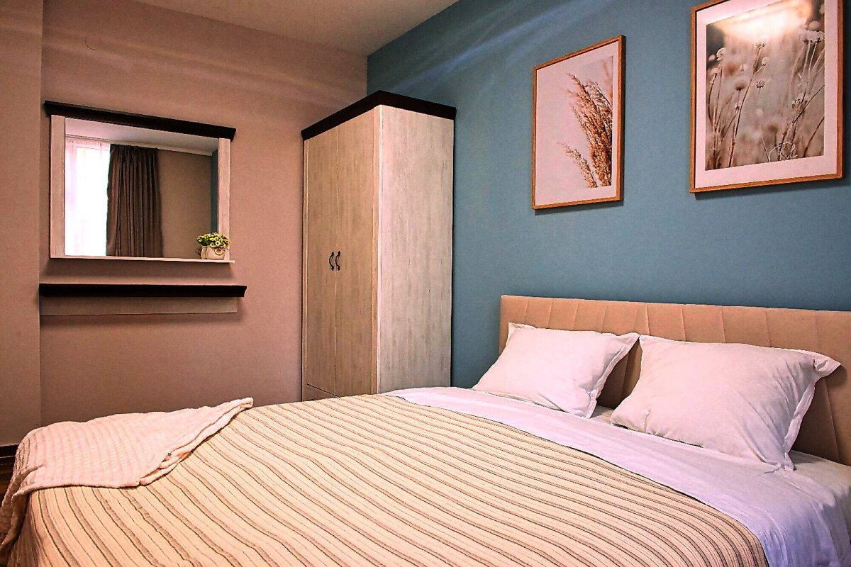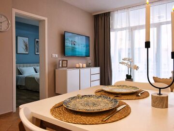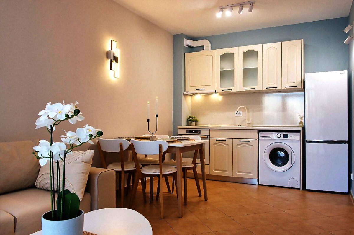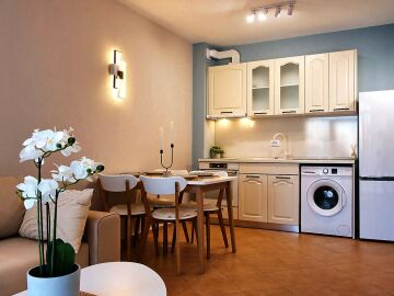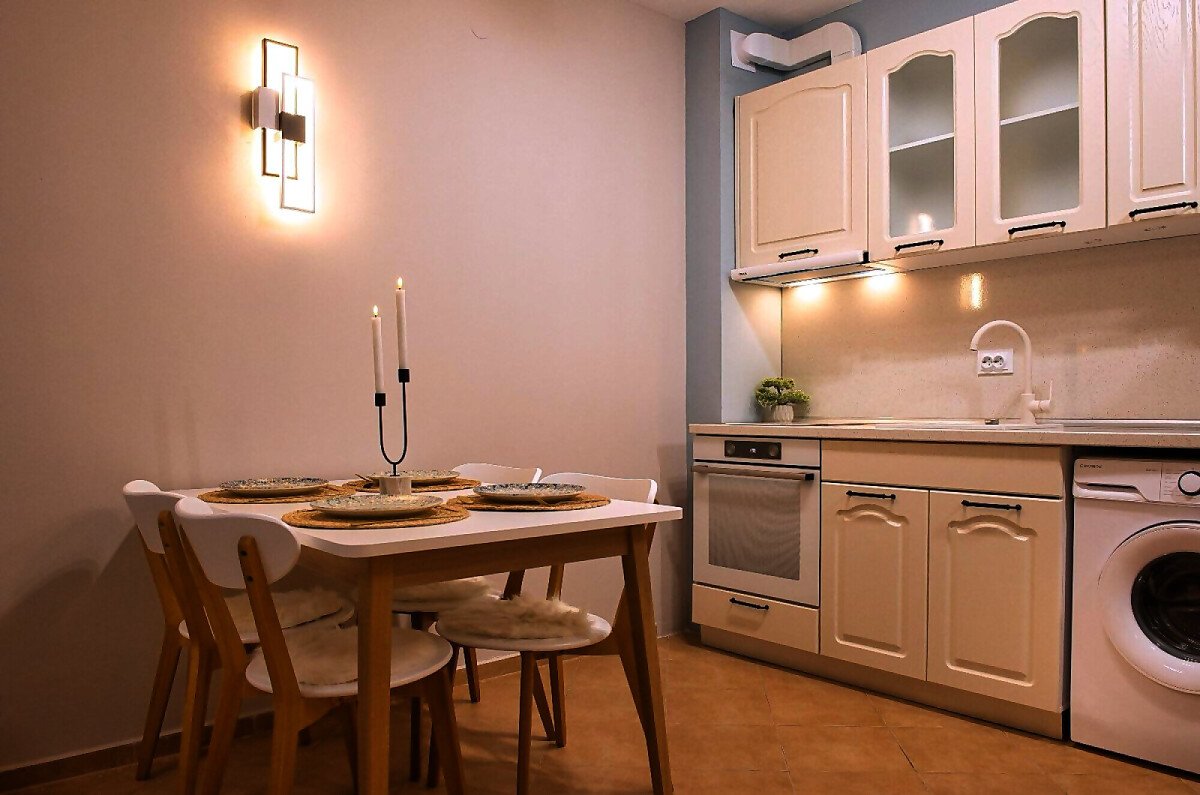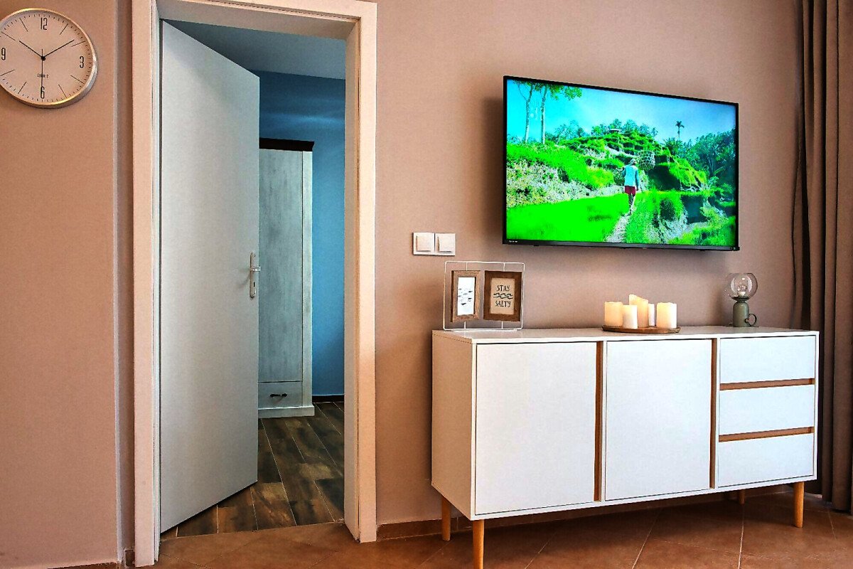 Апартаментът е уютен и много функционален, със следното разпределение – входно антре, всекидневна с оборудван кухненски бокс и трапезария, баня с тоалетна и вана, спалня, просторен балкон.