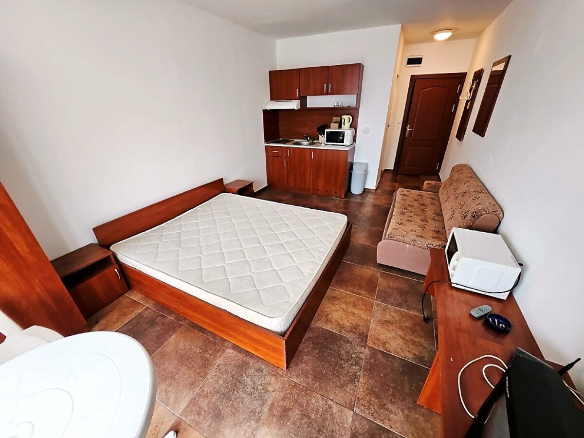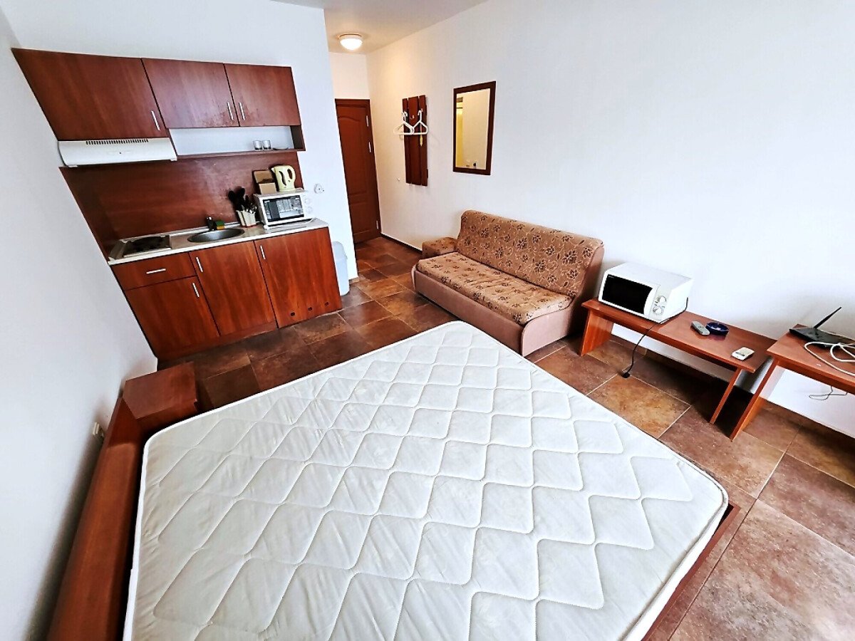 Студиото е на трети етаж и се състои от входно антре, просторна всекидневна с напълно оборудван кухненски бокс и обособена спалня, баня с тоалетна и вана, голям балкон с изглед към двора.