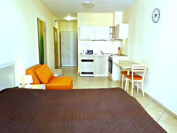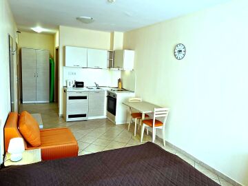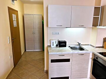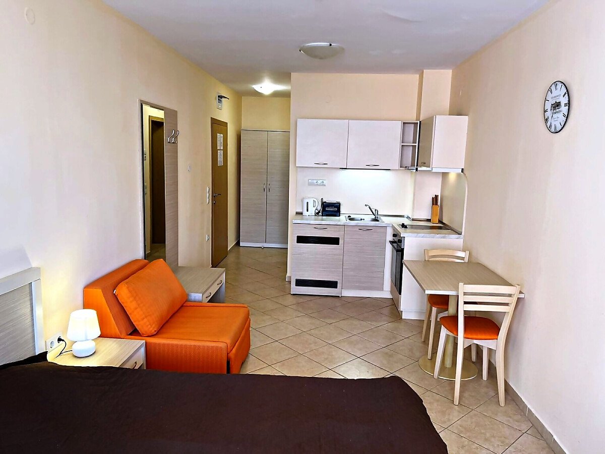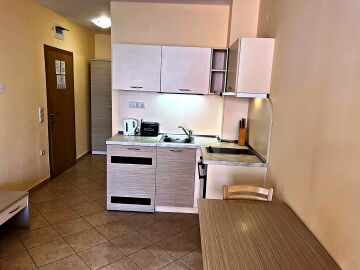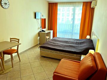 Студиото е на четвърти етаж и се състои от входно антре, голяма всекидневна с обособена спалня, кът за хранене и оборудван кухненски бокс, баня с тоалетна и вана, удобен балкон.