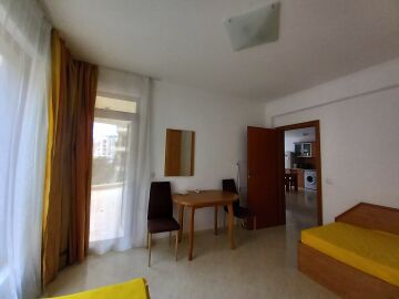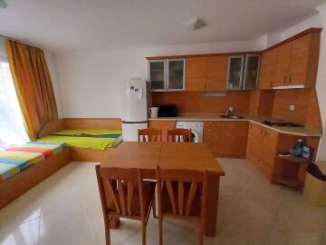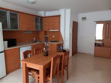 Апартаментът е разположен на втори етаж, напълно обзаведен и оборудван, със следното разпределение – голяма всекидневна с кухненски бокс и трапезария, две спални, баня с тоалетна и душ кабина, просторен балкон с красива гледка към басейна.