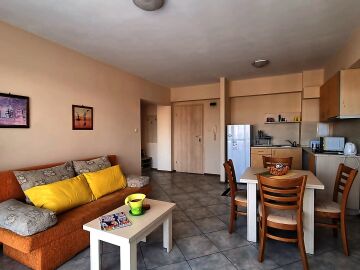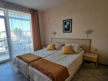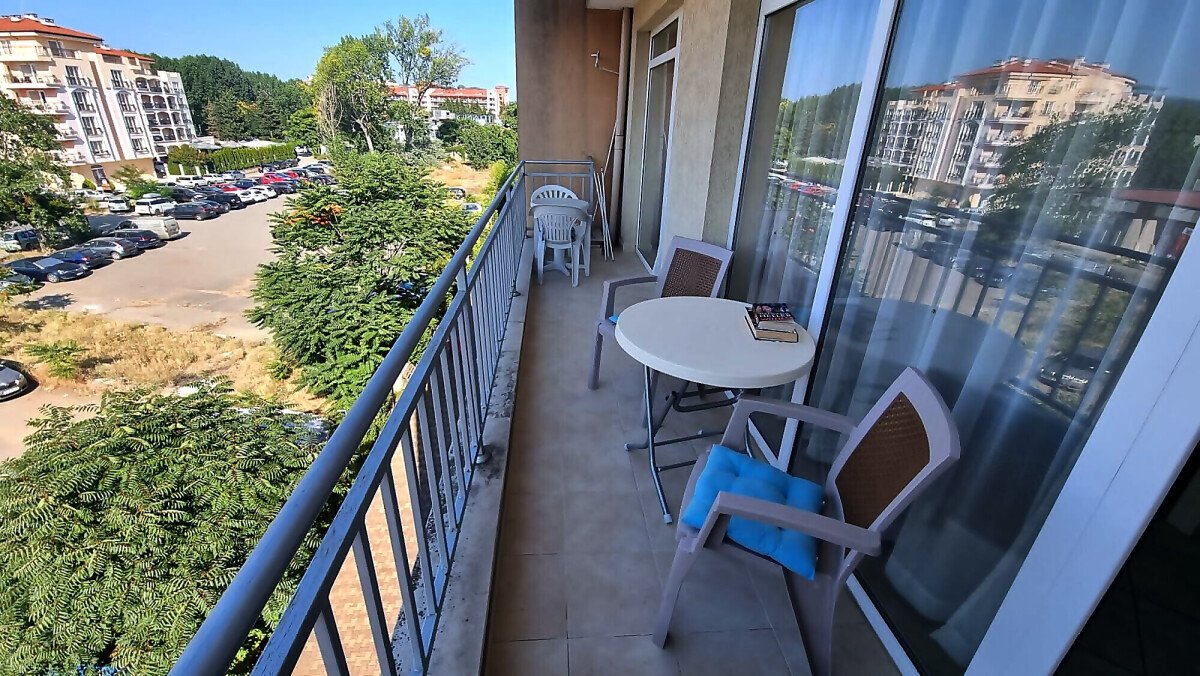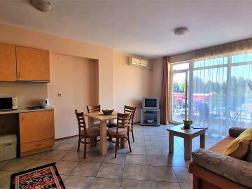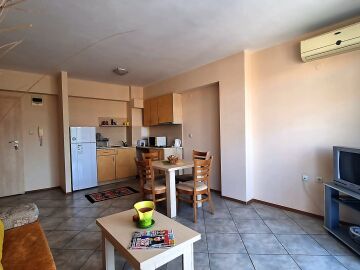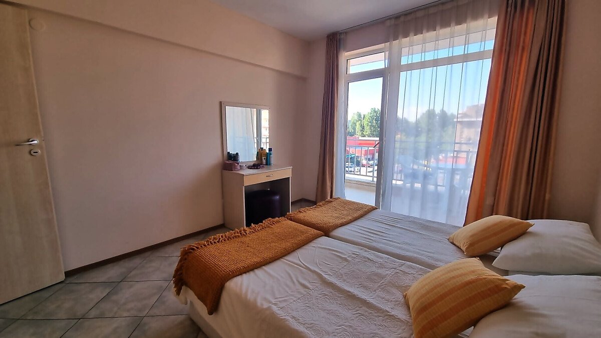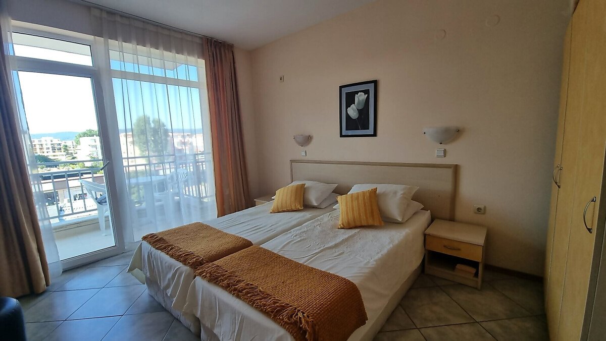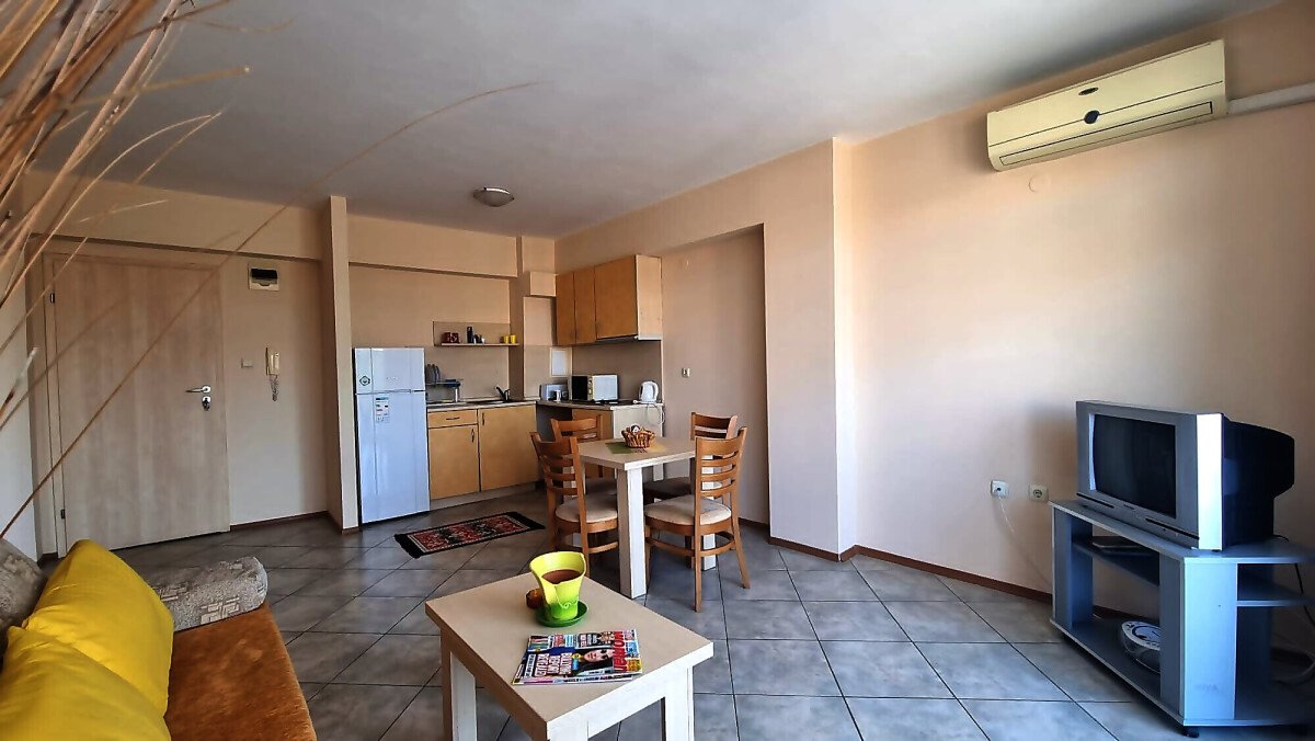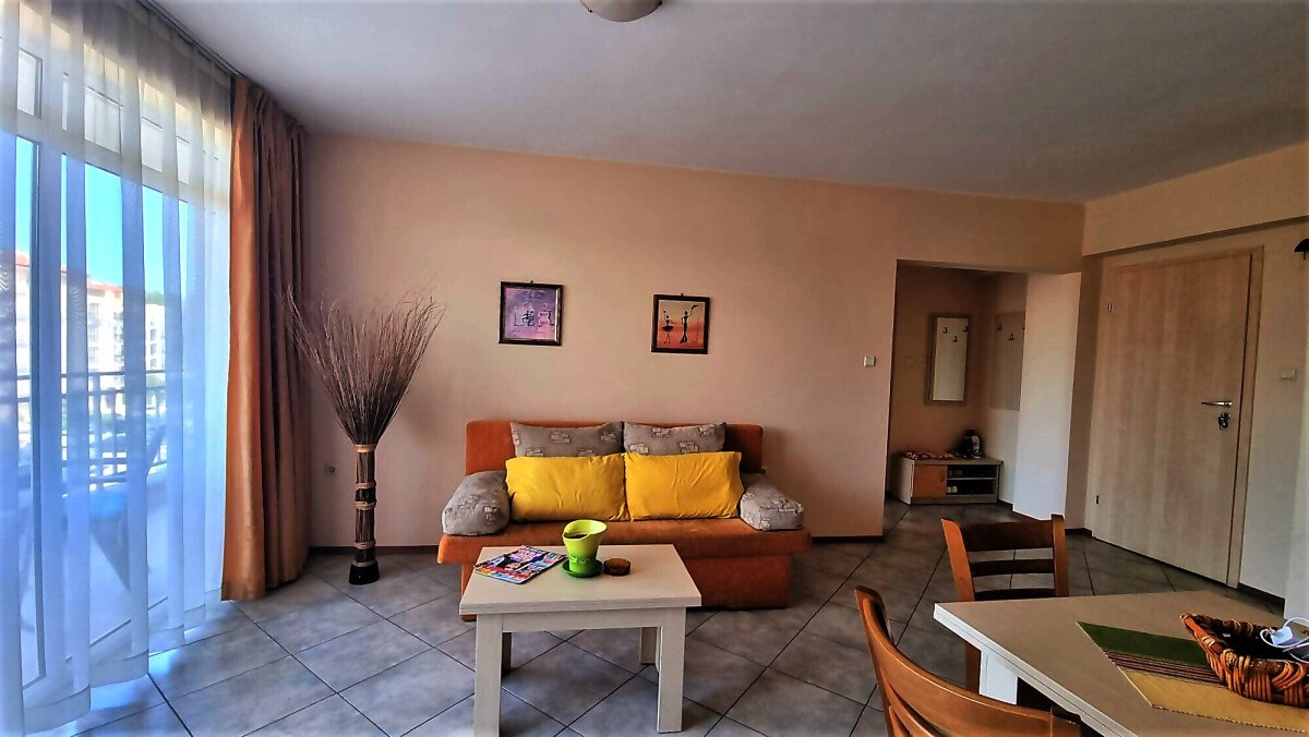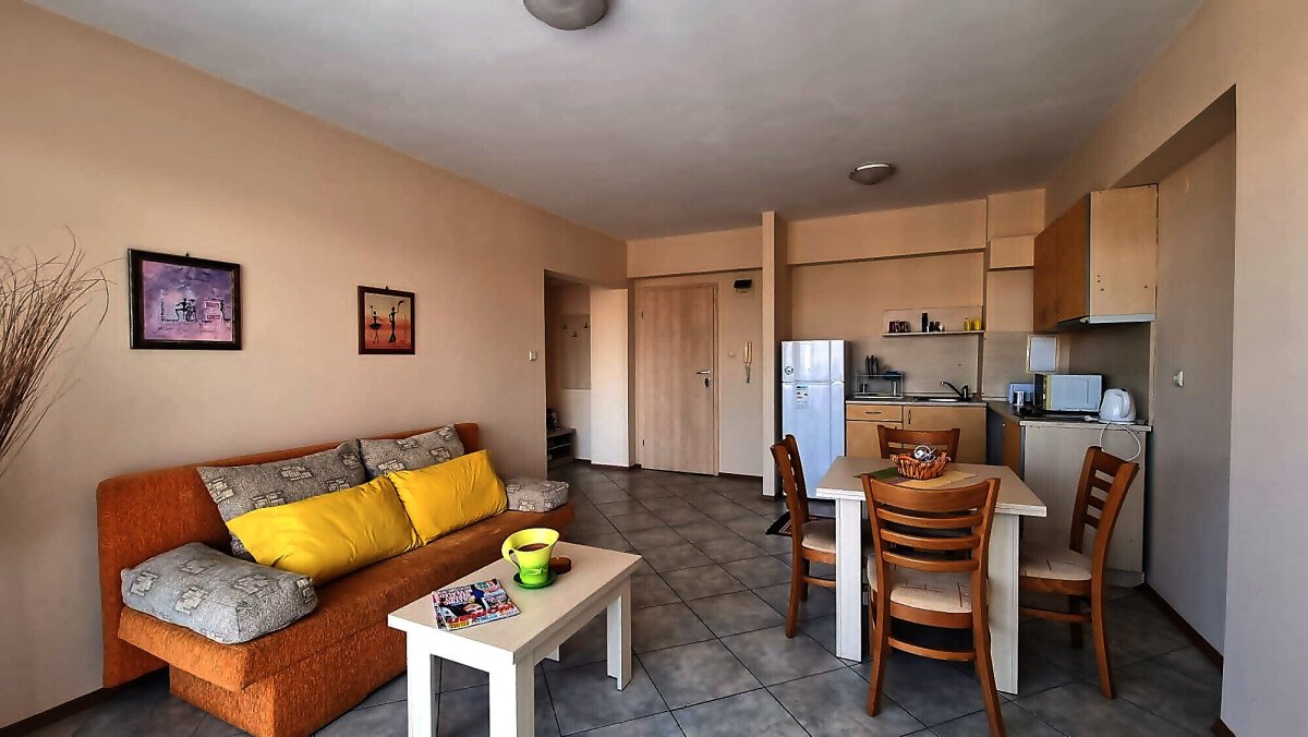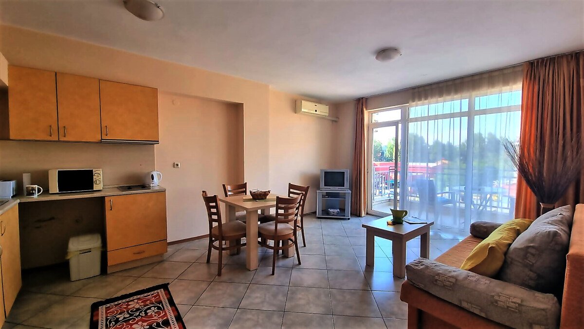 Апартаментът се намира на четвърти, предпоследен етаж и има следното разпределение – входно антре, голяма всекидневна с обособен кухненски бокс и трапезария, баня с тоалетна и душ кабина, уютна спалня, просторен балкон с изглед към курорта.