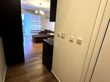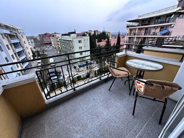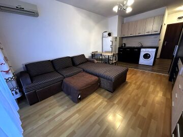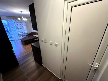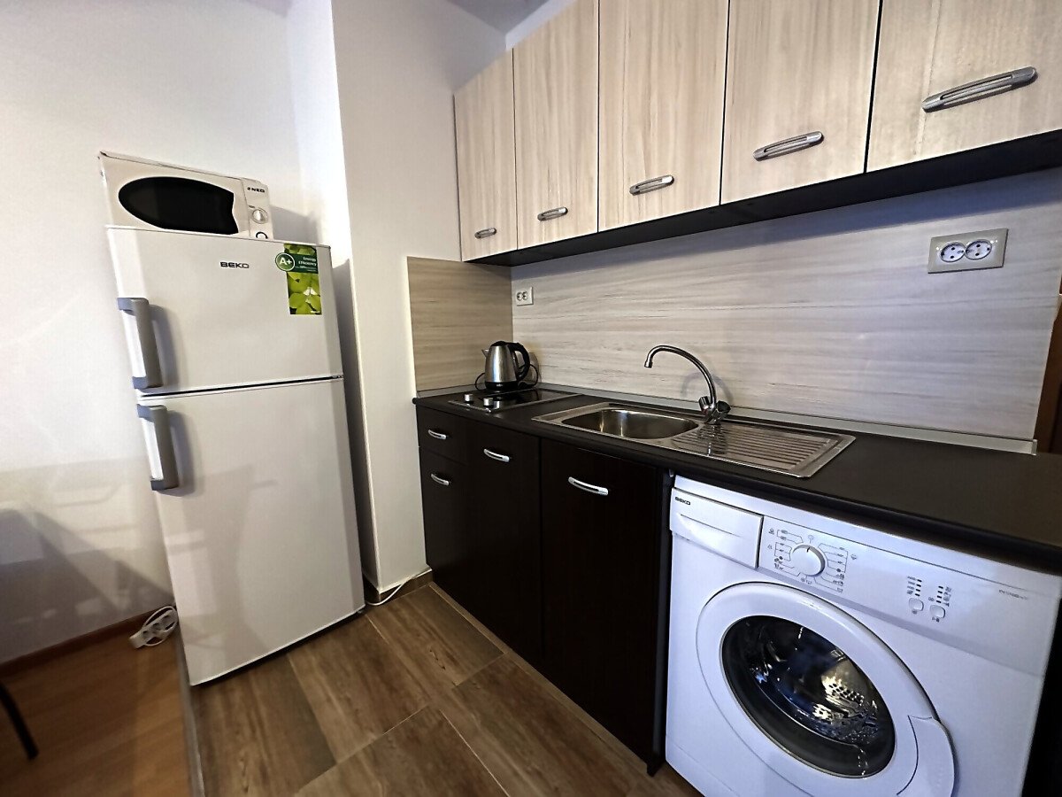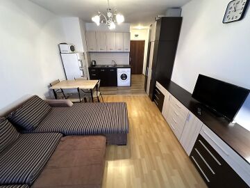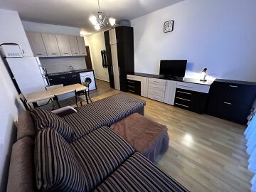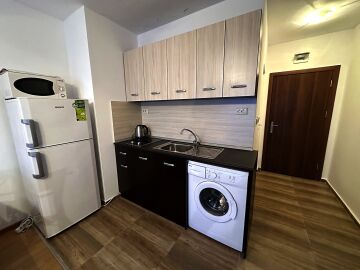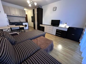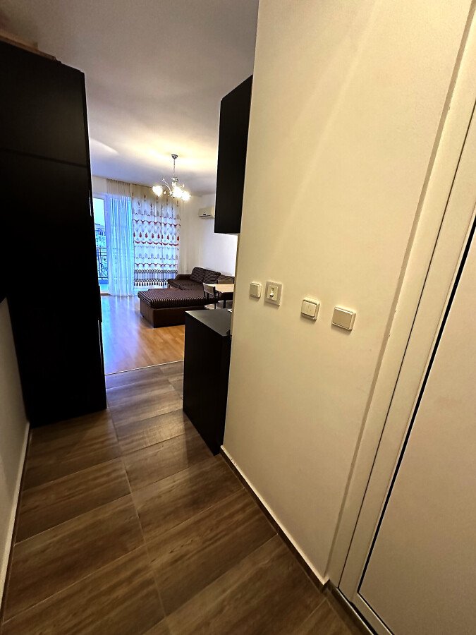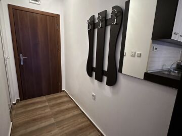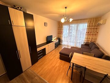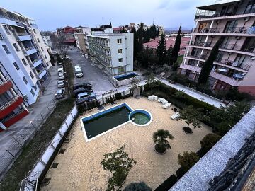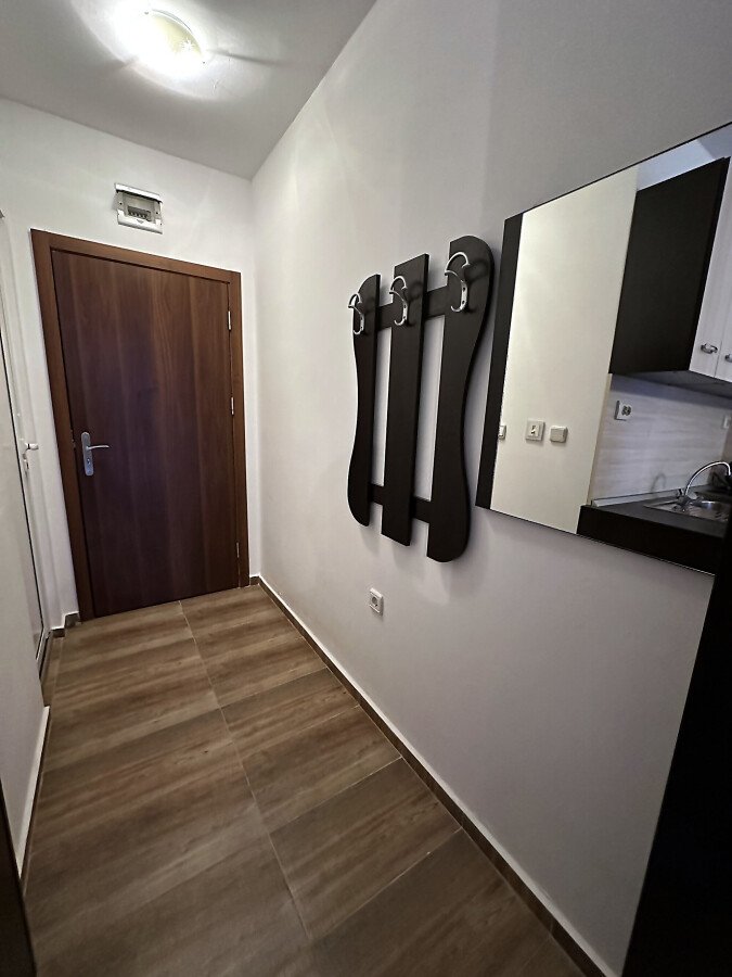 Студиото е разположено на пети етаж и се състои от входно антре, просторна всекидневна с оборудван кухненски бокс и кът за хранене, баня с тоалетна и вана, балкон с прекрасен изглед към басейна и закритата територия на комплекса.