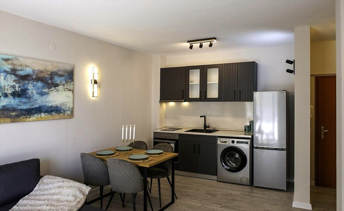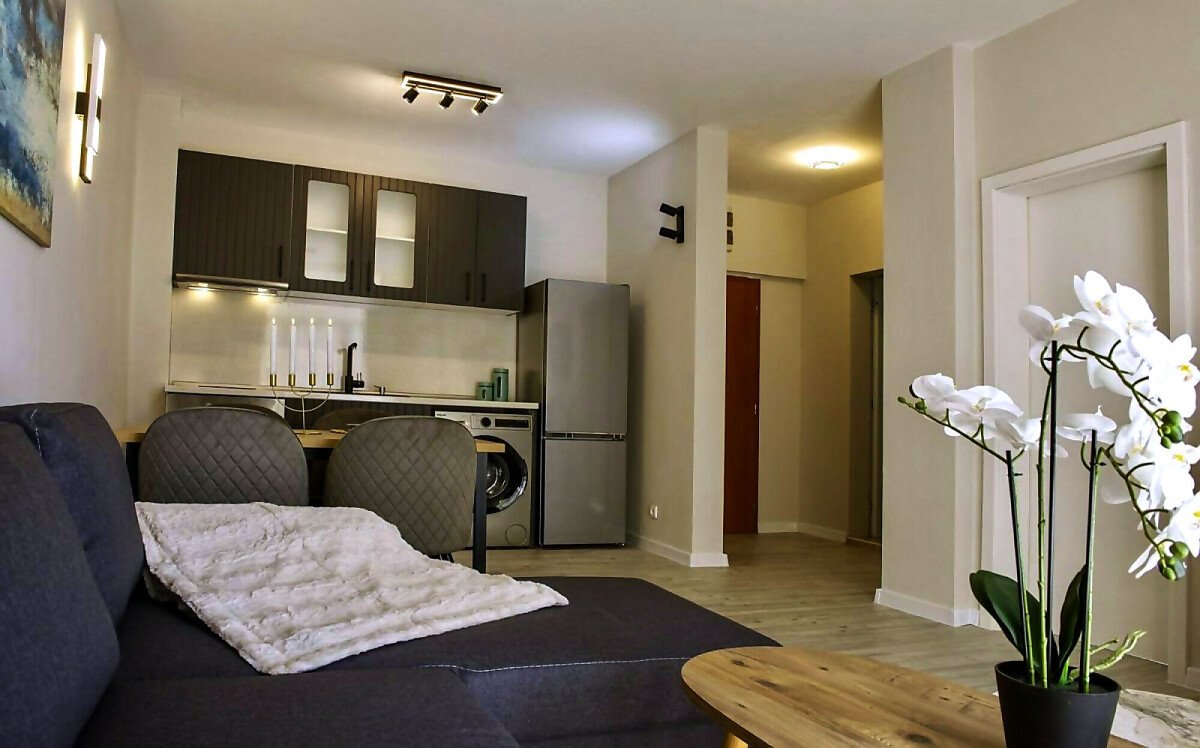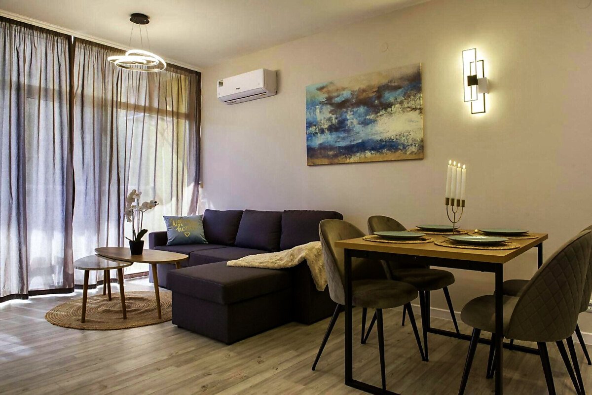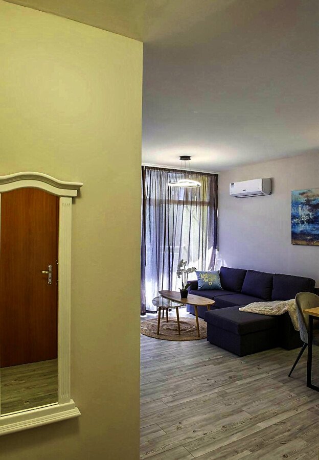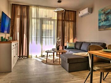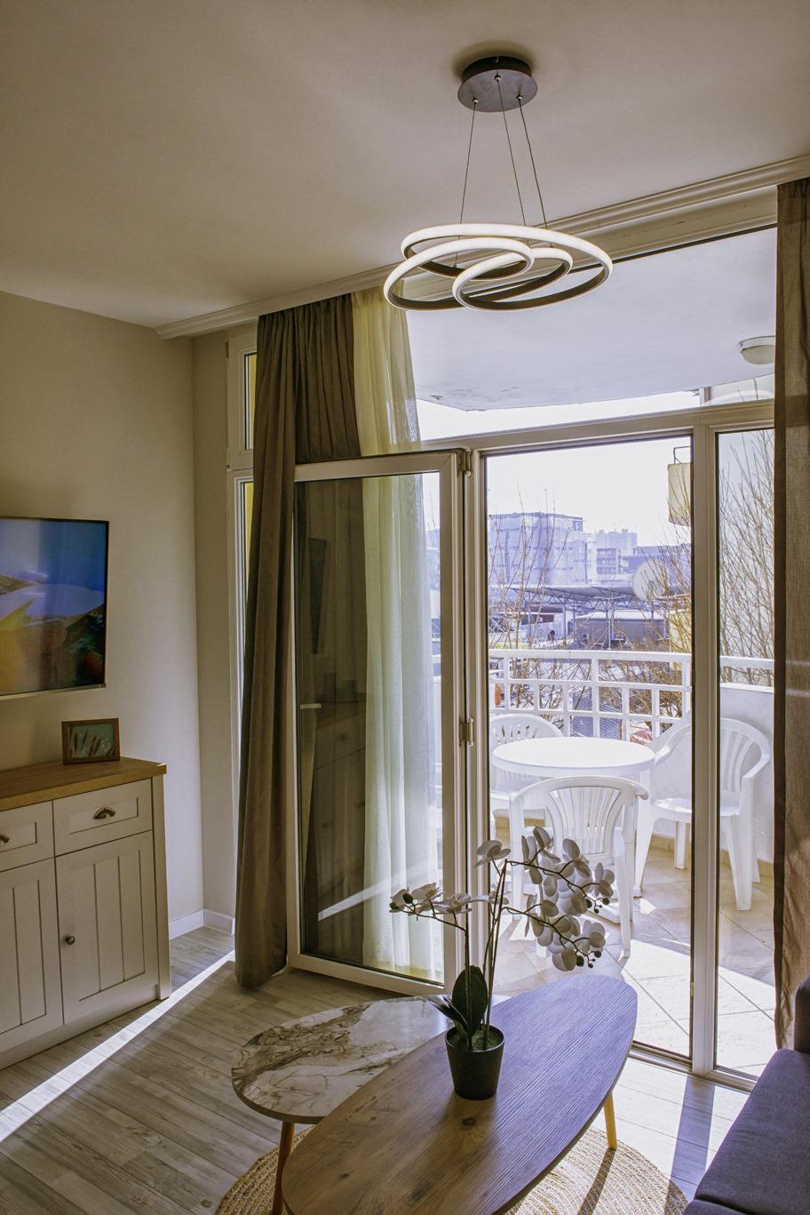 Апартаментът се продава със стилно обзавеждане и качествено оборудване, като има следното разпределение – входно антре, всекидневна с кухня и кът за хранене, уютна спалня, баня с тоалетна и вана, слънчев балкон.