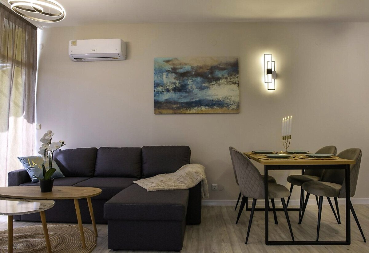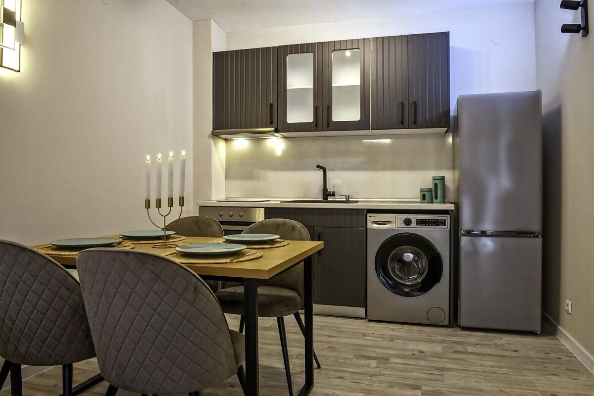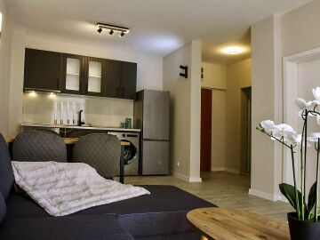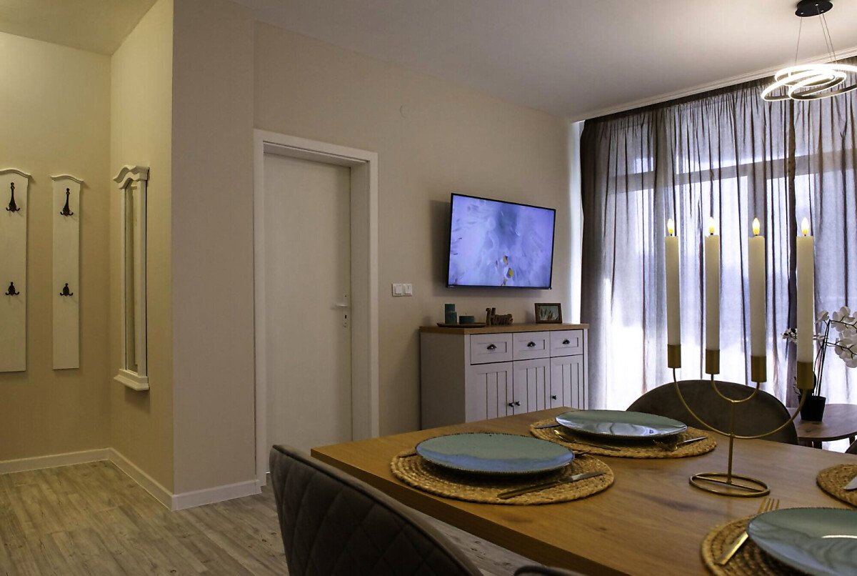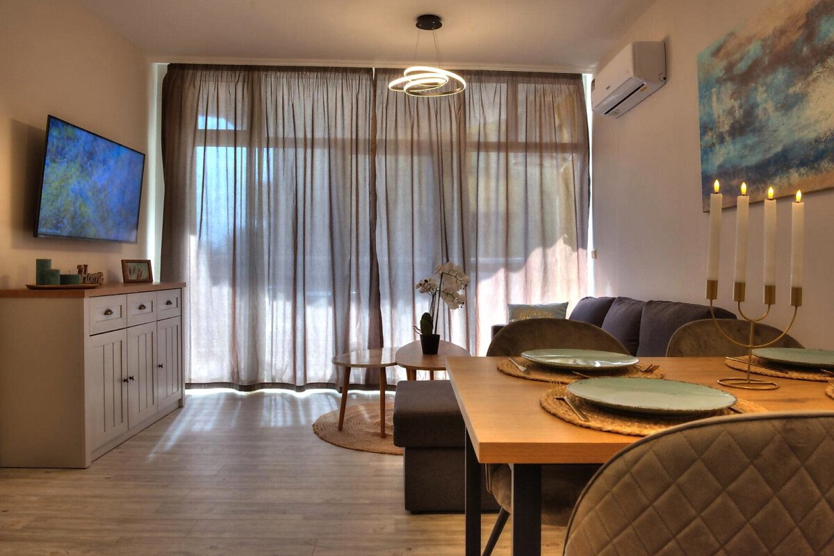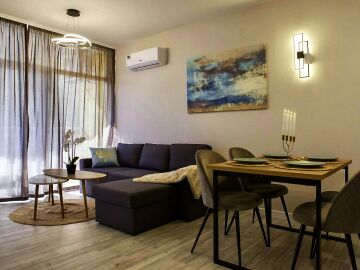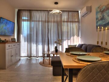 Апартаментът се продава със стилно обзавеждане и качествено оборудване, като има следното разпределение – входно антре, всекидневна с кухня и кът за хранене, уютна спалня, баня с тоалетна и вана, слънчев балкон.