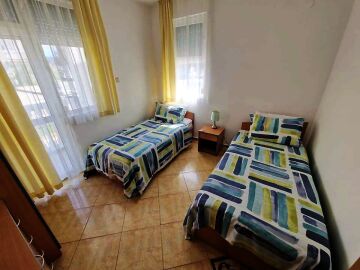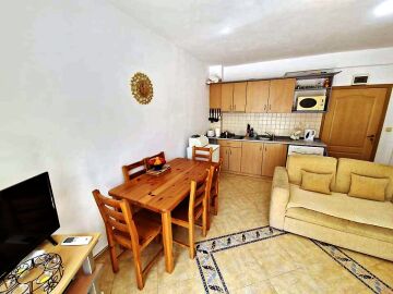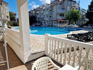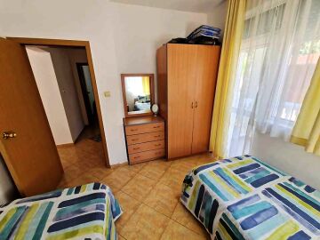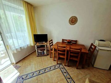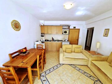 Апартаментът е на партерен етаж и се състои от входно антре, всекидневна с оборудван кухненски бокс и обособен кът за хранене, две спални, баня с тоалетна и вана, самостоятелна веранда с изход към басейна и вътрешната част на комплекса.